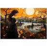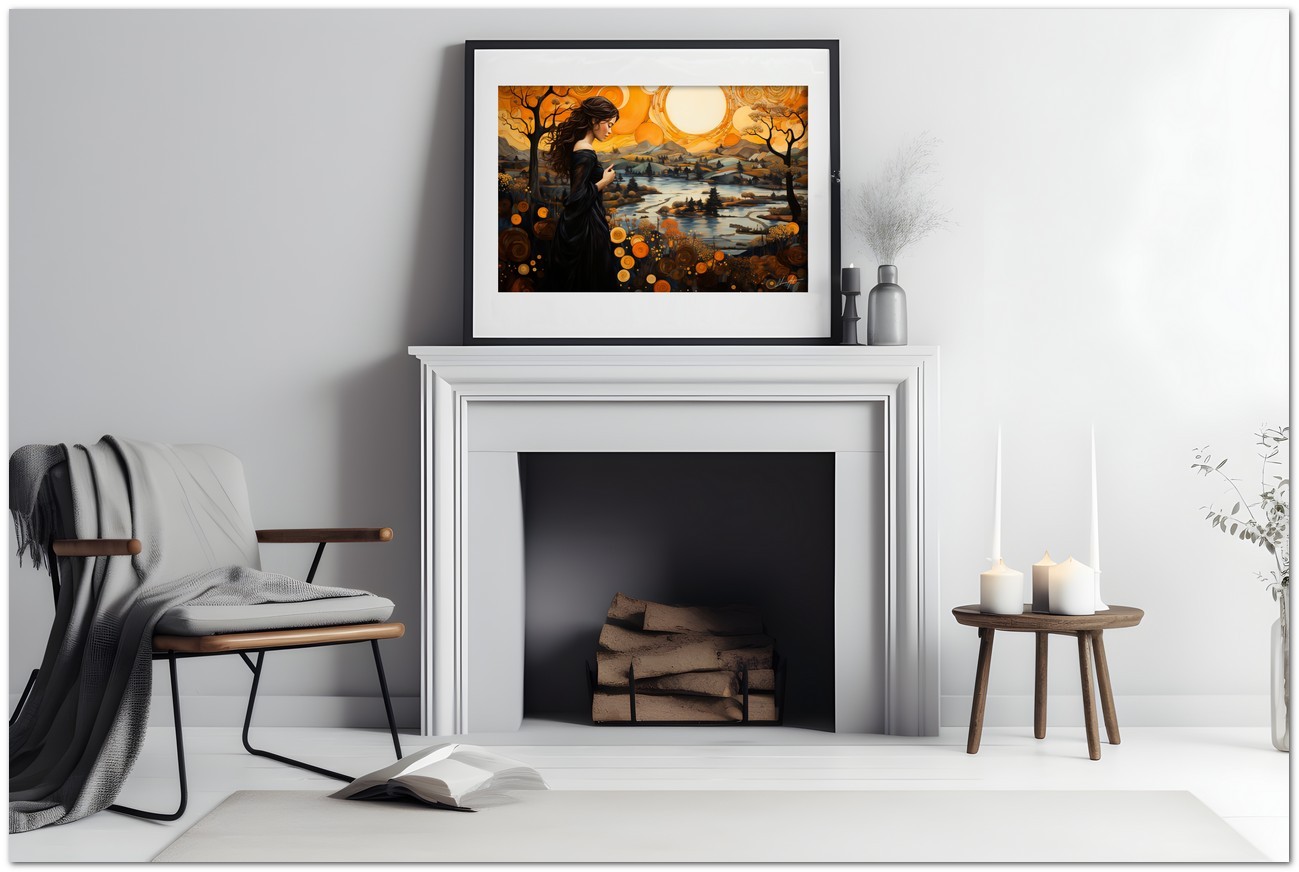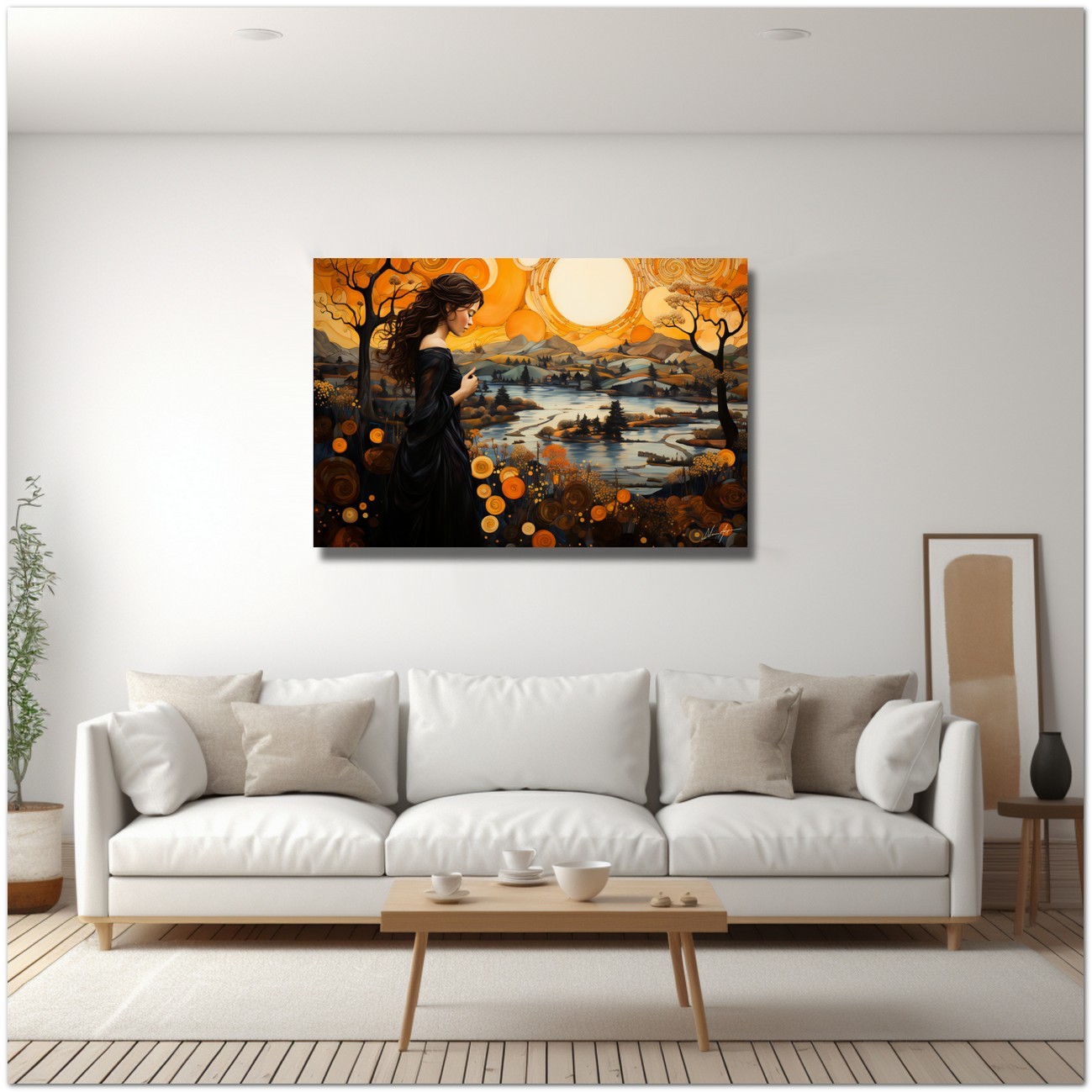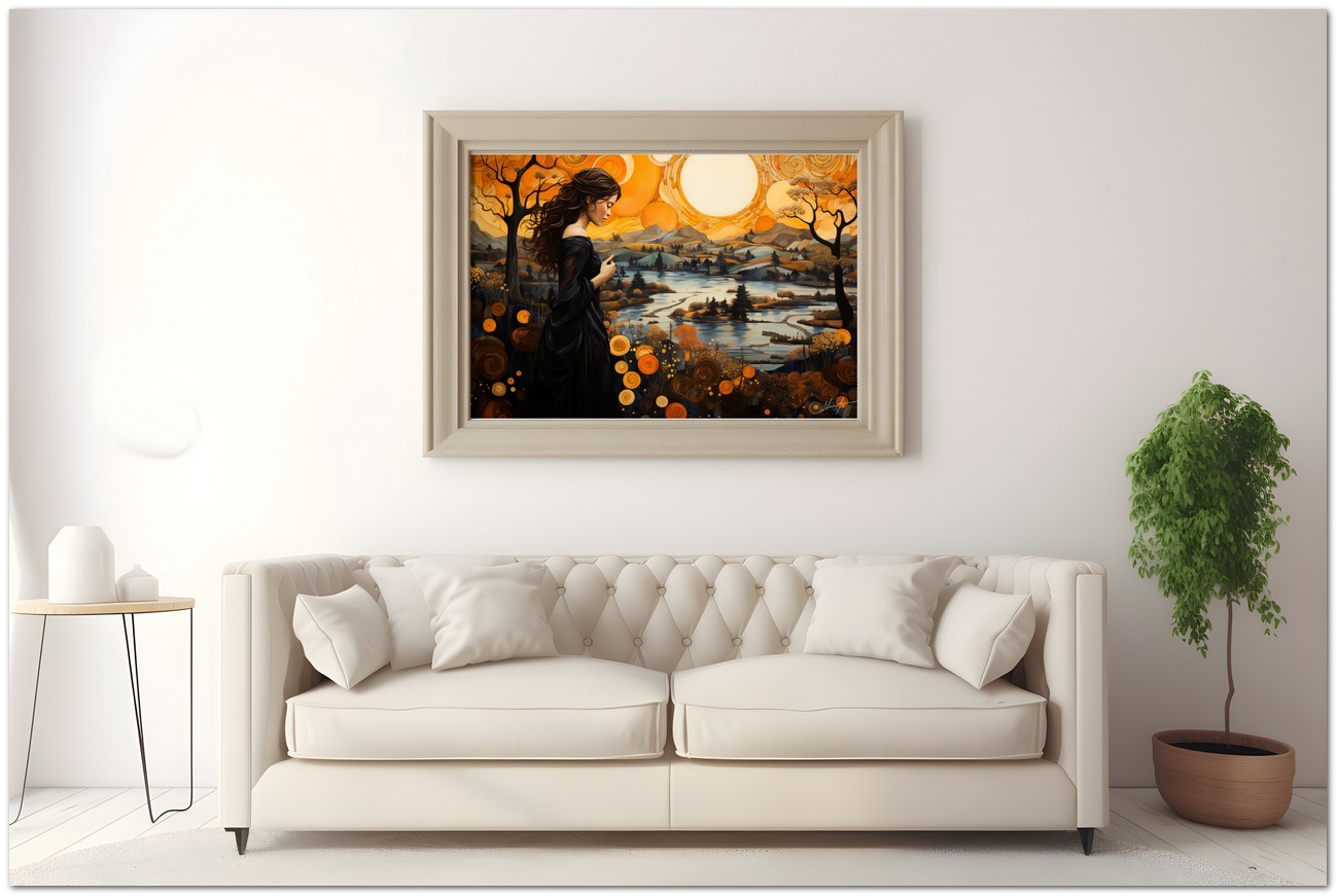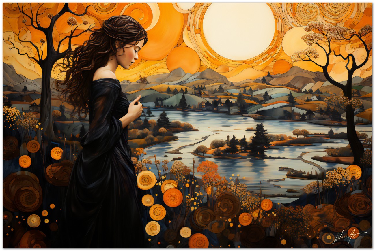 „Fallen Leaves“ ist ein Gemälde, das eine kontemplative und melancholische Szene darstellt, in der eine Frau in einem schwarzen Kleid auf einen fernen See blickt. Die Arbeit weckt ein Gefühl der Reflexion und Selbstbeobachtung und lädt den Betrachter ein, in die Gefühle und Symbole einzutauchen, die im Bild verborgen sind. Die Mischung aus realistischen und abstrakten Elementen sorgt für ein reichhaltiges visuelles Erlebnis und bietet unterschiedliche Interpretationen und Bedeutungen. Über „Fallen Leaves“: Klassifizierung, Techniken und Stile