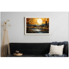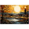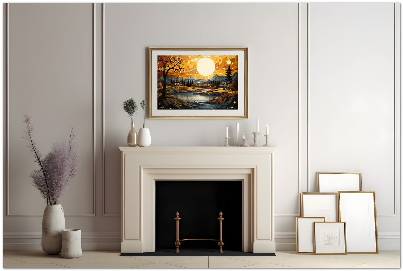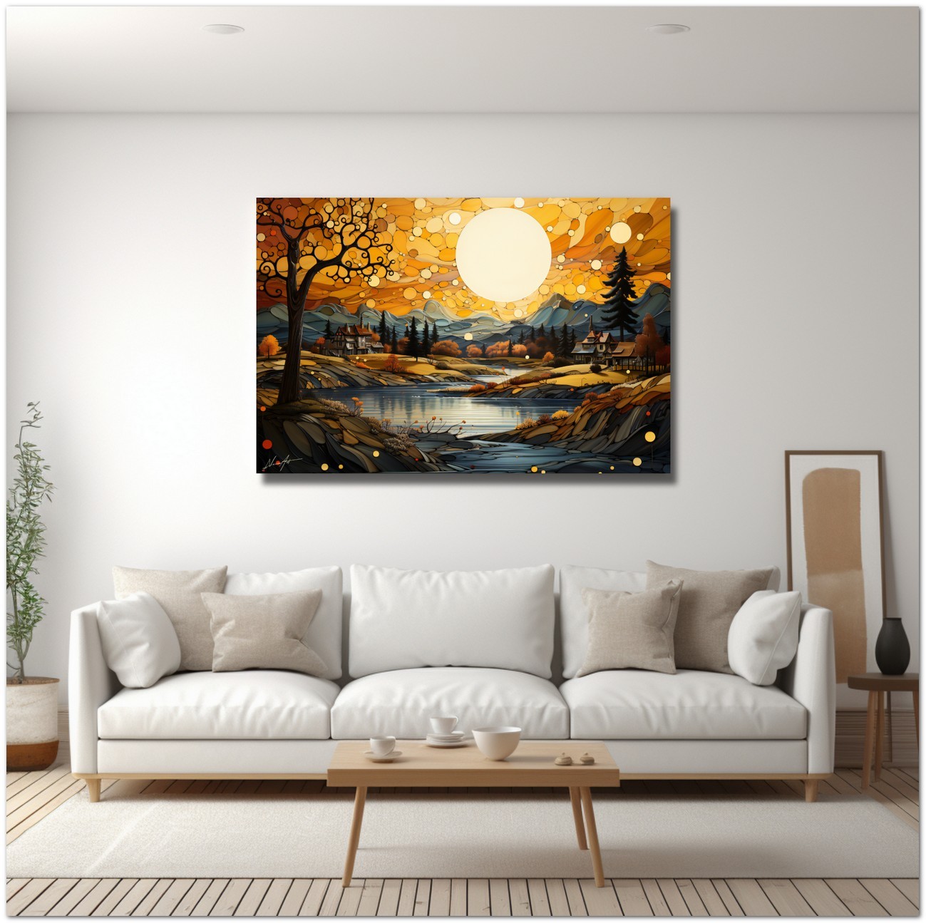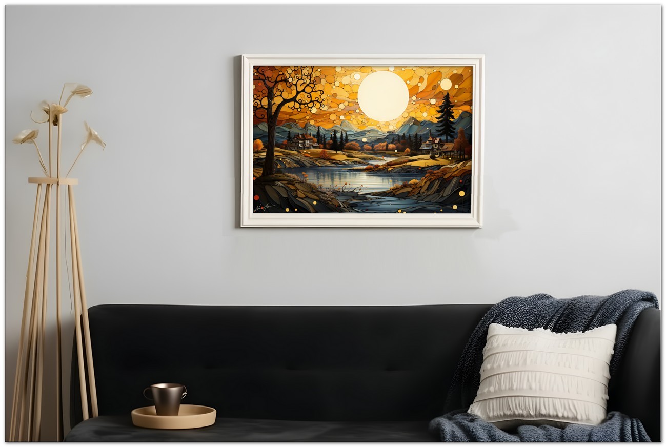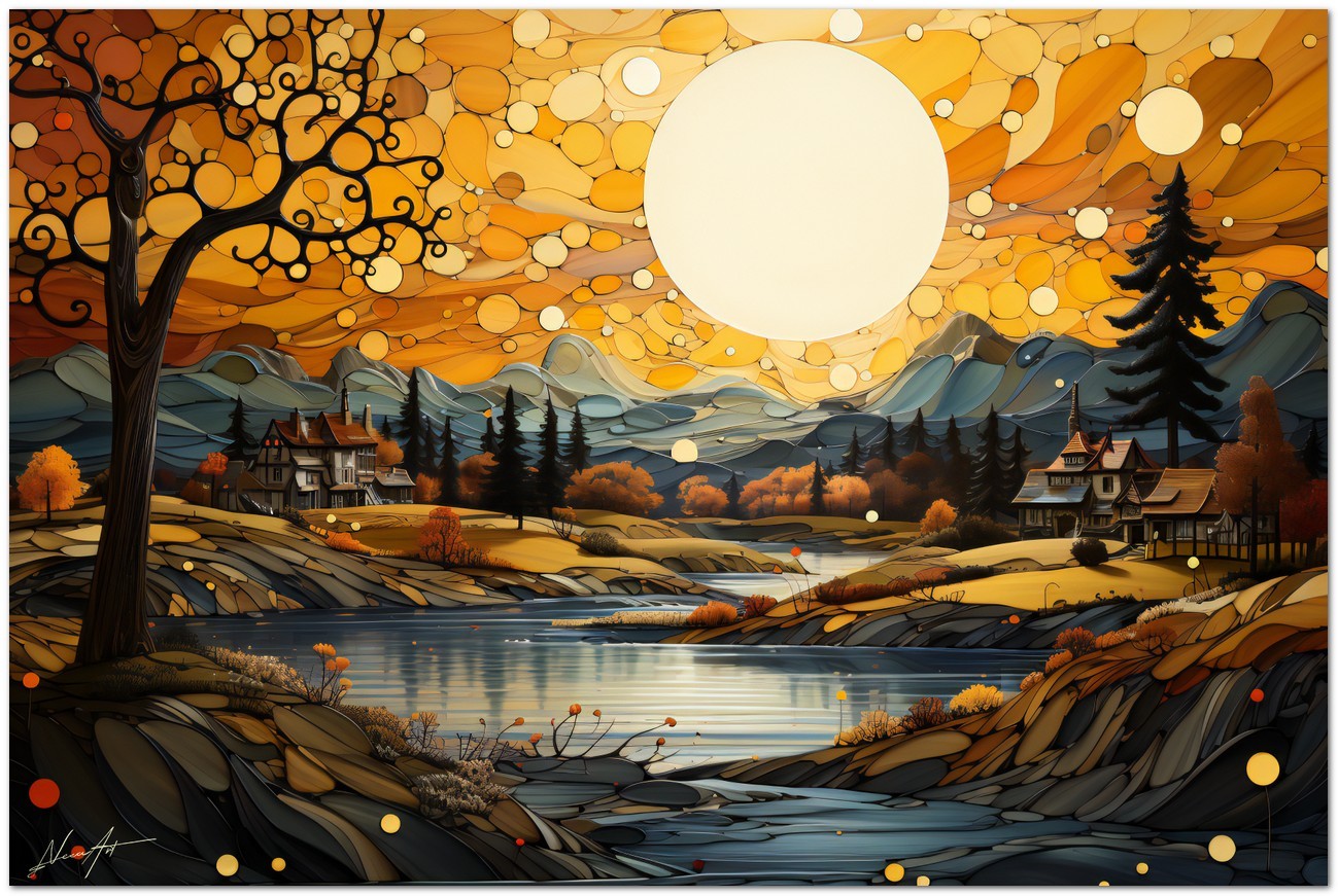 „Contrasts in Nature“ ist ein digitales Gemälde, das eine ruhige Herbstlandschaft voller Bäume und eines Flusses mit lebendigen und warmen Farben darstellt, die ein Gefühl der Ruhe hervorrufen. Im Vordergrund sorgt die Sonne für ein kontrastierendes Element, während ein wesentlicher Teil des Bildes der Darstellung eines Flusses und eines Dorfes gewidmet ist, die zusammen eine malerische und entspannende Umgebung schaffen. Details zu „Kontraste in der Natur“: Klassifizierung, Techniken und Stile