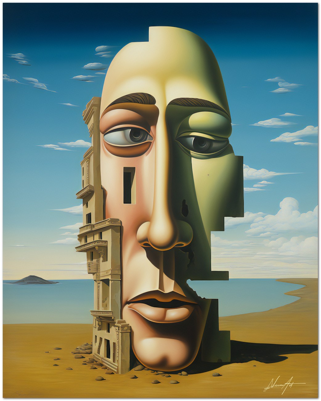 „Enigma Surreale“ ist ein digitales Werk, das den Betrachter auf eine Reise durch Surrealismus und Fantasie mitnimmt. Im Zentrum der Komposition steht ein detailliertes Porträt eines Mannes, das ein Gefühl von Geheimnis und Faszination vermittelt. Das Gesicht des Mannes ist geschickt in ein markantes Gebäude mit animiertem Gesicht integriert, wodurch eine Szene entsteht, die Konventionen in Frage stellt und die Fantasie anregt. Details zum Werk „Enigma Surreale“: Klassifizierung, Techniken und Stile