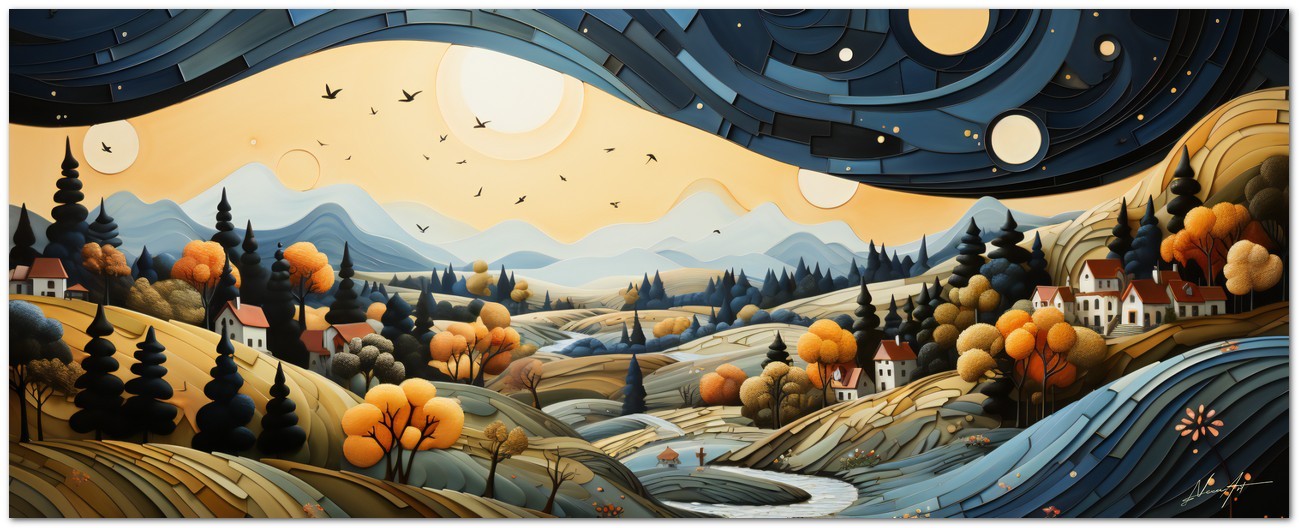 „Rifugio Sereno“ ist ein digitales Werk, das uns in eine Welt voller Gelassenheit und natürlicher Schönheit entführt. Diese künstlerische Kreation zeigt eine idyllische Landschaft mit einem kristallklaren See, umgeben von sanften Hügeln und Grüntönen. Das blaue Wasser des Sees, das die Sonnenstrahlen reflektiert, wird von leuchtenden Mohnblumen umrahmt, die der Szene einen Hauch intensiver Farbe verleihen. Im Vordergrund stehen auf dem Hügel malerische Häuser mit roten Dächern, die einen atemberaubenden Blick auf den friedlichen See darunter bieten und ein Gefühl von Ruhe und Gelassenheit ausstrahlen. Über „Serene Refuge“: Klassifizierung, Techniken und Stile