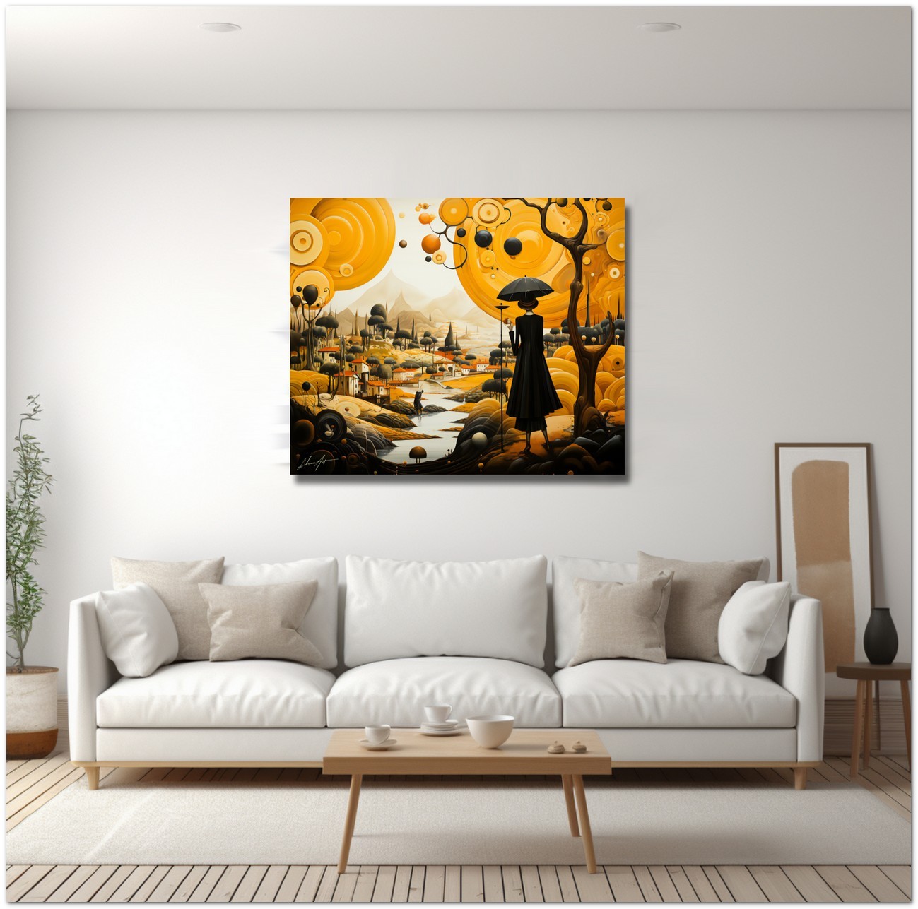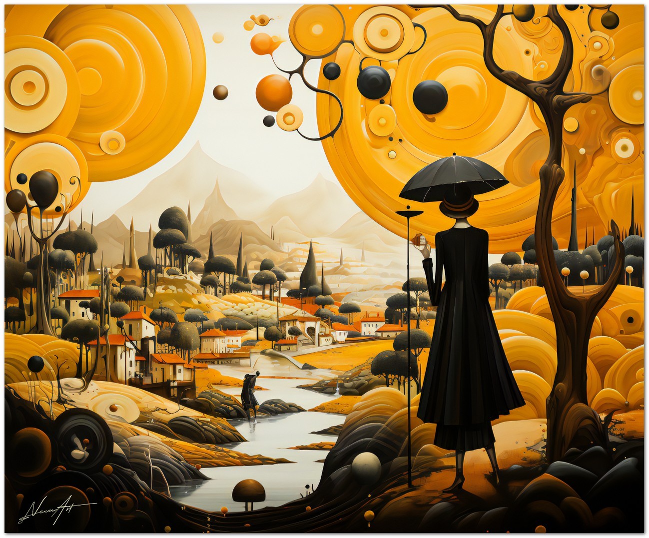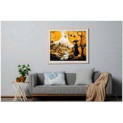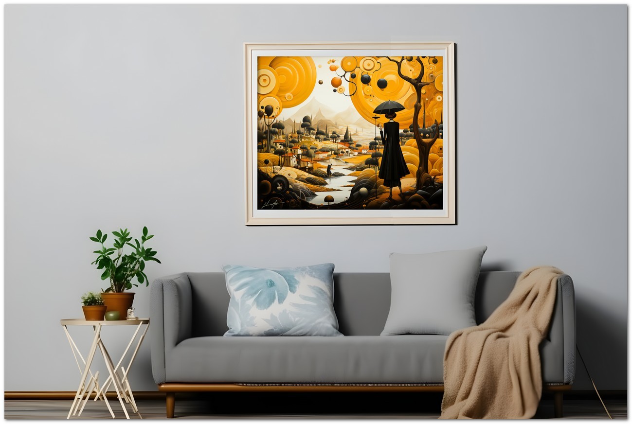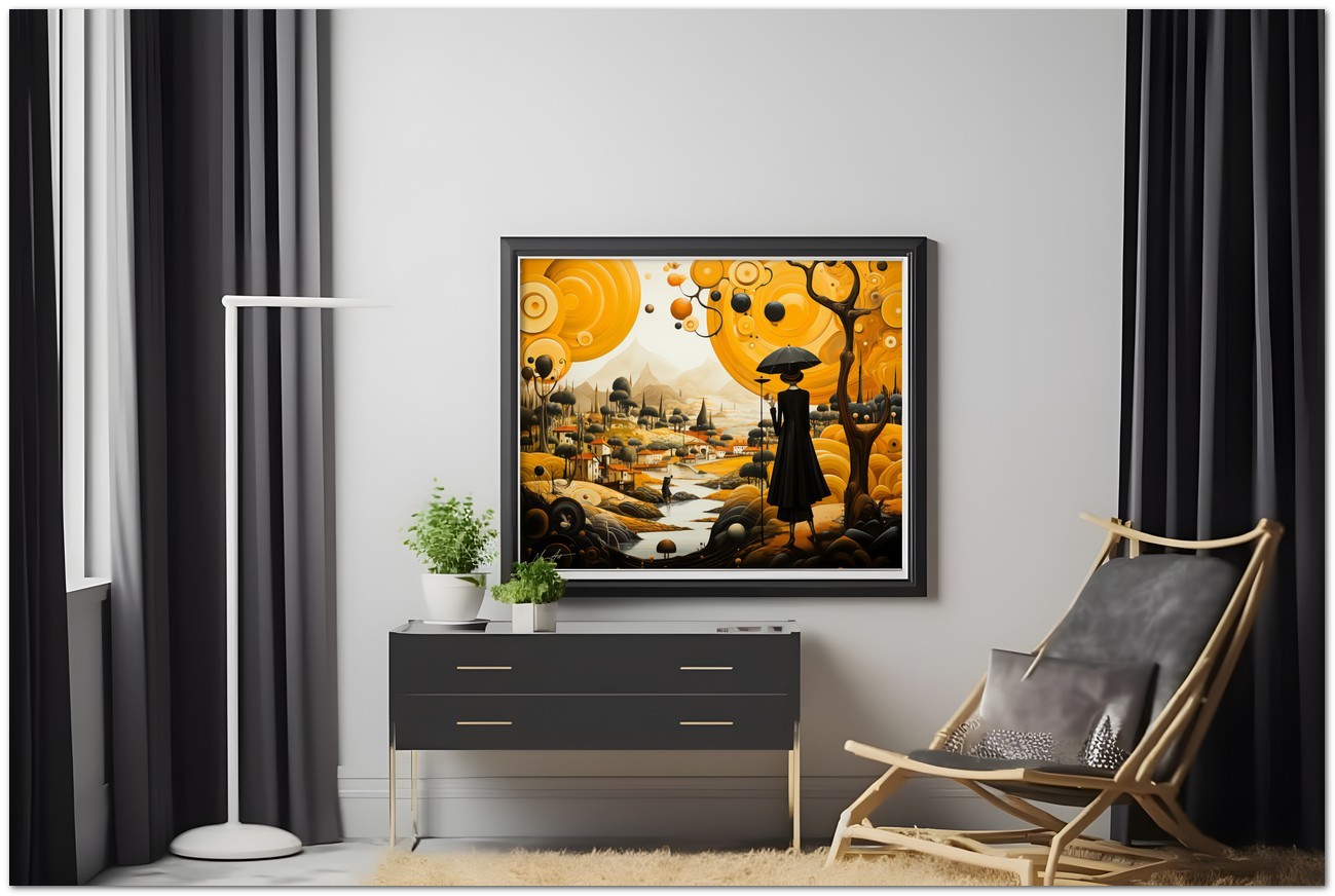 „Frau mit Regenschirm“ ist ein lebendiges digitales Gemälde, das sofort die Aufmerksamkeit des Betrachters auf sich zieht. In der Mitte ist die Figur einer Frau mit Regenschirm meisterhaft dargestellt, die vor einem Hintergrund aus leuchtenden Gelbtönen erscheint, die einen auffälligen Kontrast zum kräftigen Schwarz des Regenschirms bilden. Die farben- und formreiche Komposition vermittelt ein Gefühl von Eleganz und Geheimnis. Details zum Werk „Frau mit Regenschirm“: Einordnung, Techniken und Stile