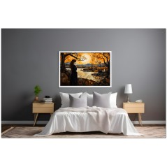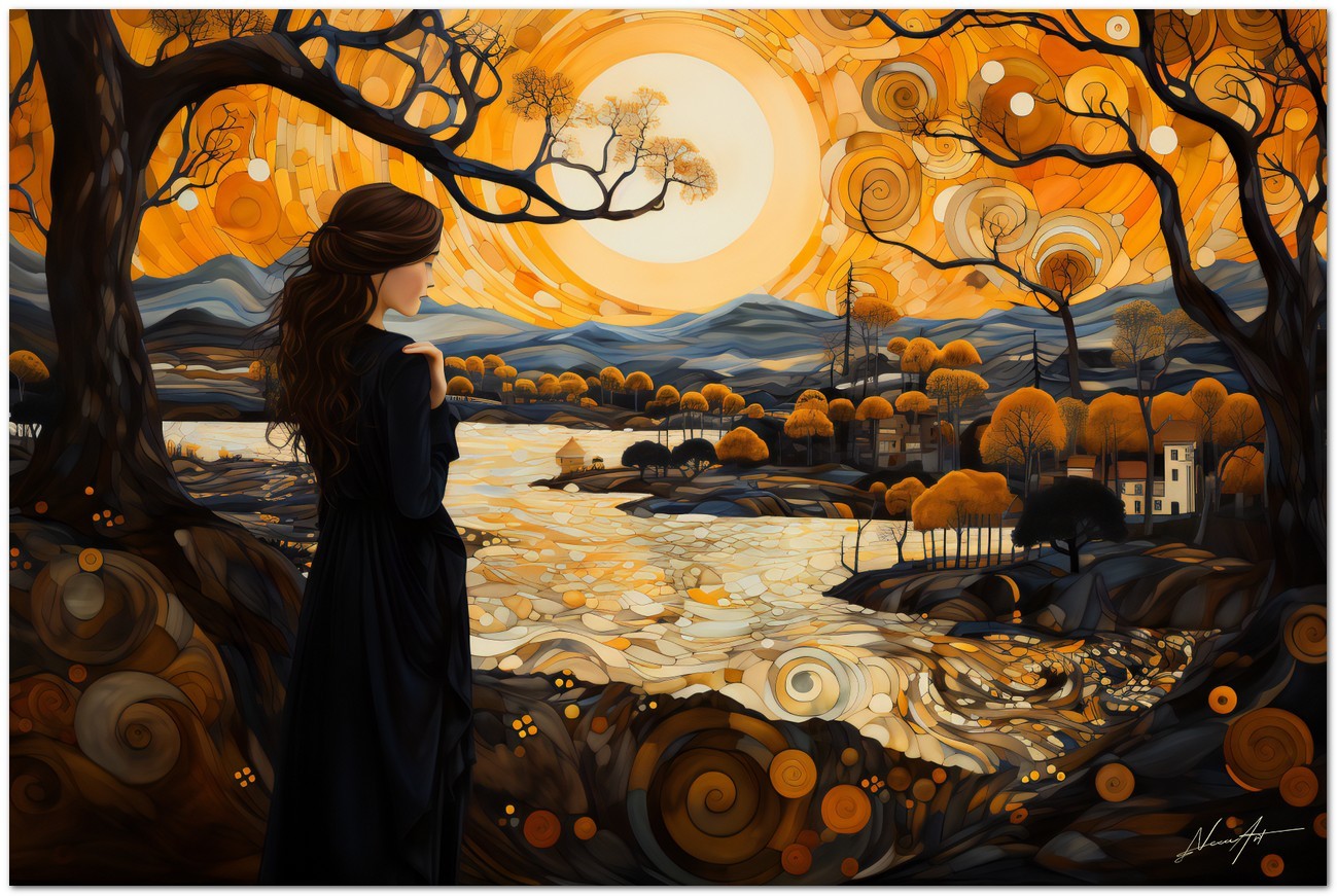„Contemplation at Sunset“ ist ein digitales Werk, das eine ruhige und nachdenkliche Szene darstellt. In der Mitte beobachtet eine Frau in einem schwarzen Kleid einen ruhigen Fluss, während die untergehende Sonne die Landschaft in ein warmes, einhüllendes Licht taucht. Seine Präsenz ruft ein Gefühl der Stille und Verbundenheit mit der Natur hervor, und die Szene wird durch die Darstellung majestätischer Bäume verstärkt, die dem Gemälde ein Gefühl von Erhabenheit und Schönheit verleihen. Details zum Werk „Contemplation at Sunset“: Klassifizierung, Techniken und Stile