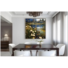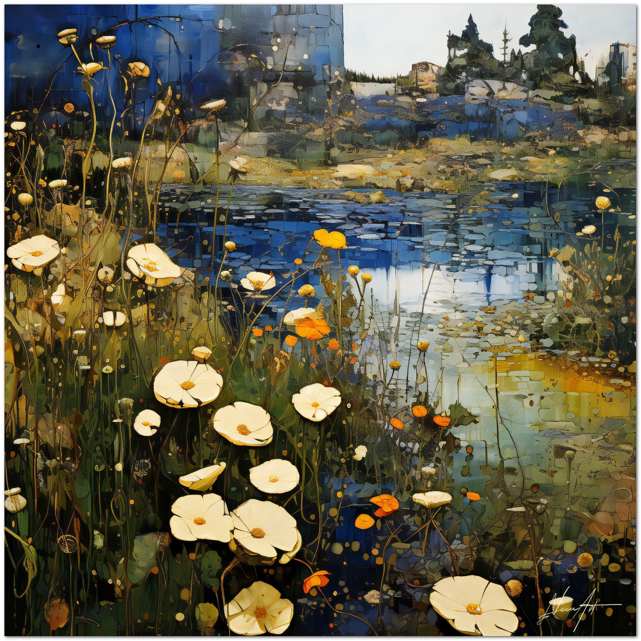 „At the Foot of the Castle“ ist ein digitales Werk, das uns in eine ruhige und natürliche Szene entführt, mit einem malerischen Teich in der Mitte, geschmückt mit einer Auswahl bunter Blumen, die zart auf seiner Oberfläche schweben. Im Hintergrund verleiht der Sockel einer Burg der Umgebung einen Hauch von Erhabenheit, während der blaue Himmel darüber Weite und Ruhe vermittelt. Die abstrakten Pinselstriche, die die Wolken darstellen, bilden einen faszinierenden Kontrast zu den Blumen darunter. Details zum Werk „Am Fuße der Burg“: Klassifizierung, Techniken und Stile