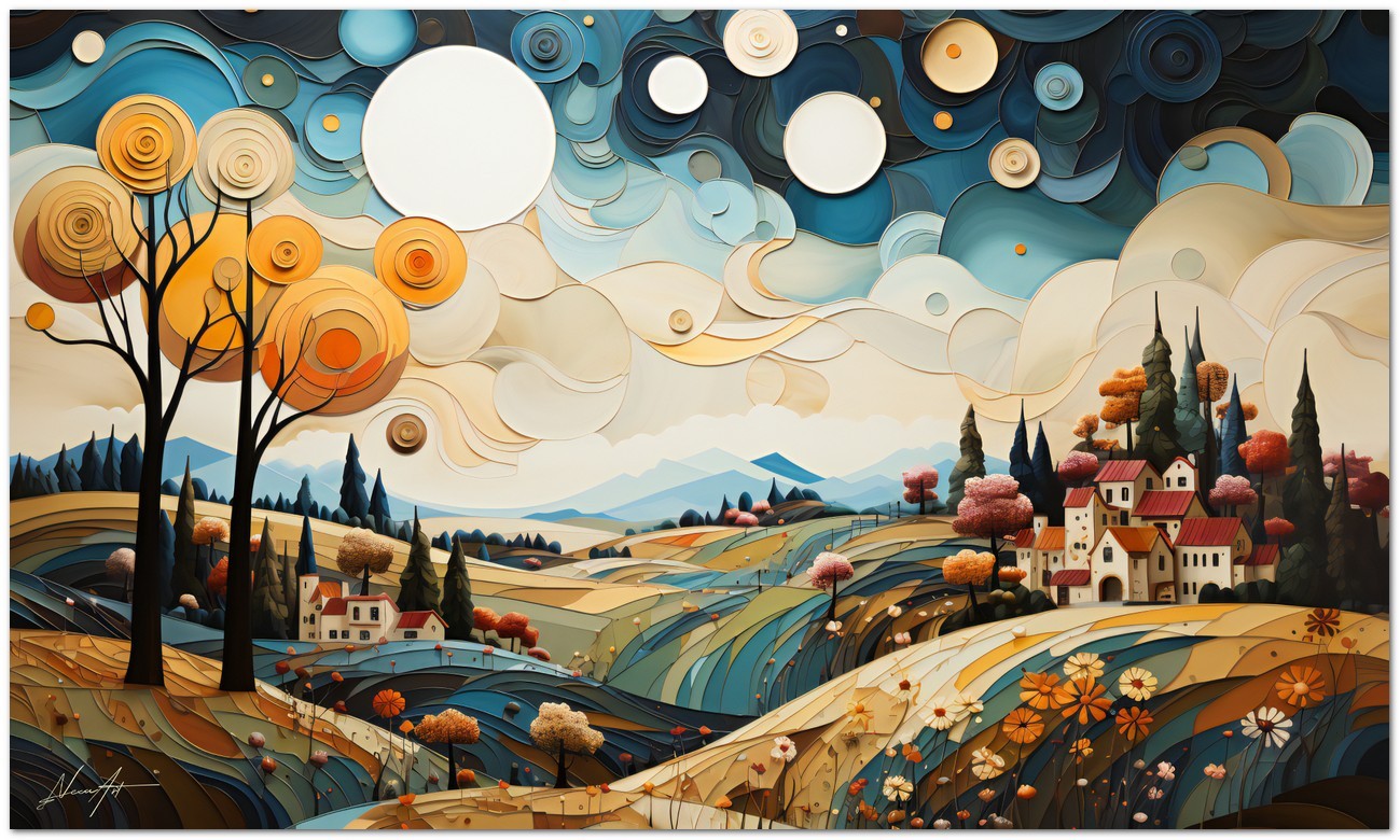 „Moonlight in Serene Landscape“ ist ein digitales Kunstwerk, das eine ruhige und bezaubernde Landschaft zeigt, in der leuchtend grüne Bäume majestätisch unter einem tiefblauen Himmel stehen. Das Gemälde ist mit zarten bunten Blumen verziert, die der friedlichen Umgebung Lebendigkeit verleihen. Ein Schlüsselelement des Werkes ist die Präsenz eines faszinierenden Mondes, dessen zartes Licht die idyllische Landschaft erhellt und eine Atmosphäre der Gelassenheit und natürlicher Schönheit schafft. Details zum Werk „Moonlight in the Serene Landscape“: Klassifizierung, Techniken und Stile