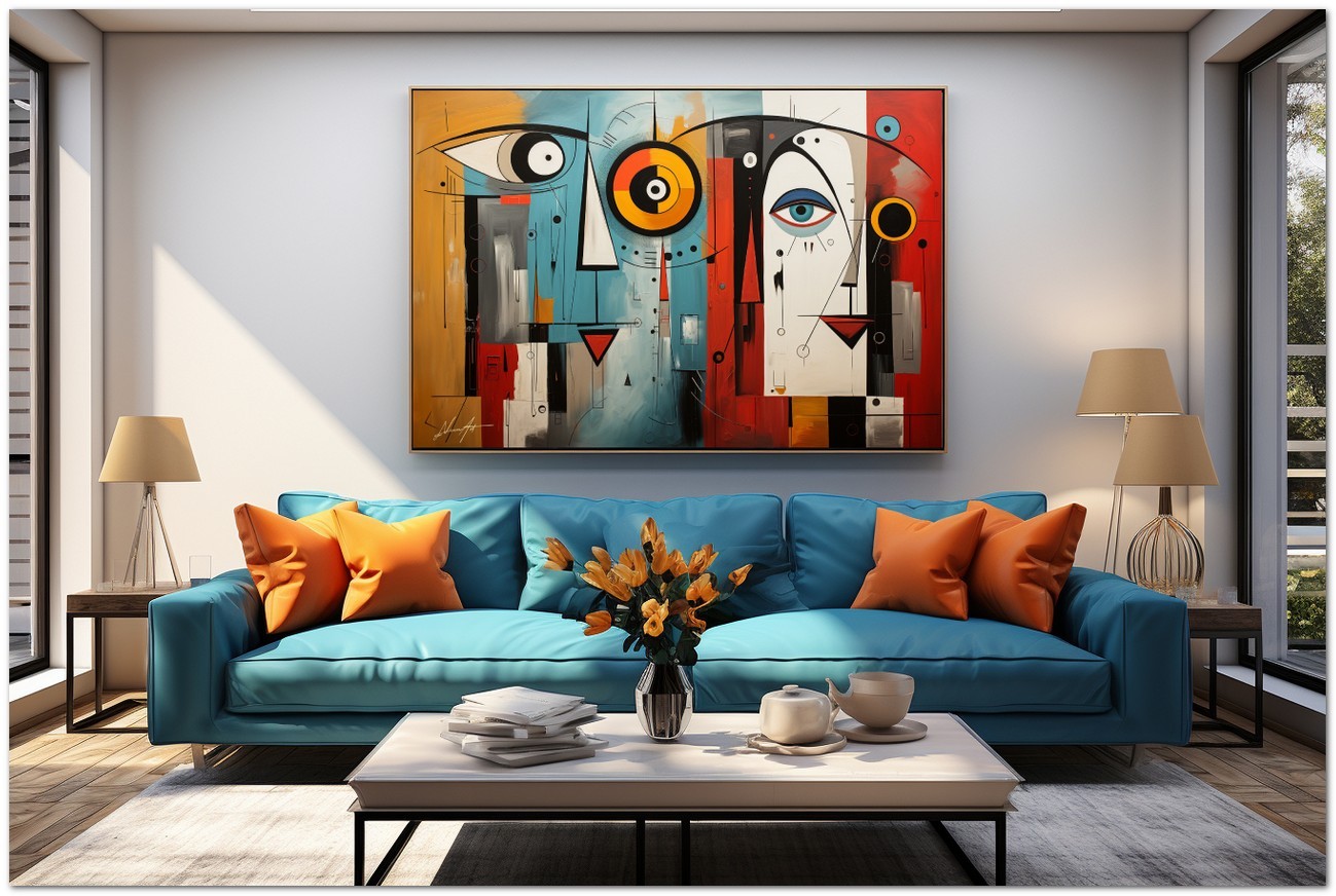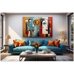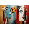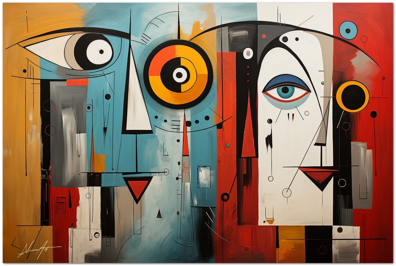 Ein digitales Kunstwerk, das die Komplexität der menschlichen Natur und des Kosmos anhand einer Reihe abstrakter Bilder und Symbole erforscht. Im Zentrum des Werkes stehen ein Mann und eine Frau im abstrakten Stil, umgeben von vielfältigen künstlerischen Elementen. Über diese Arbeit: Klassifizierung, Techniken und Stile