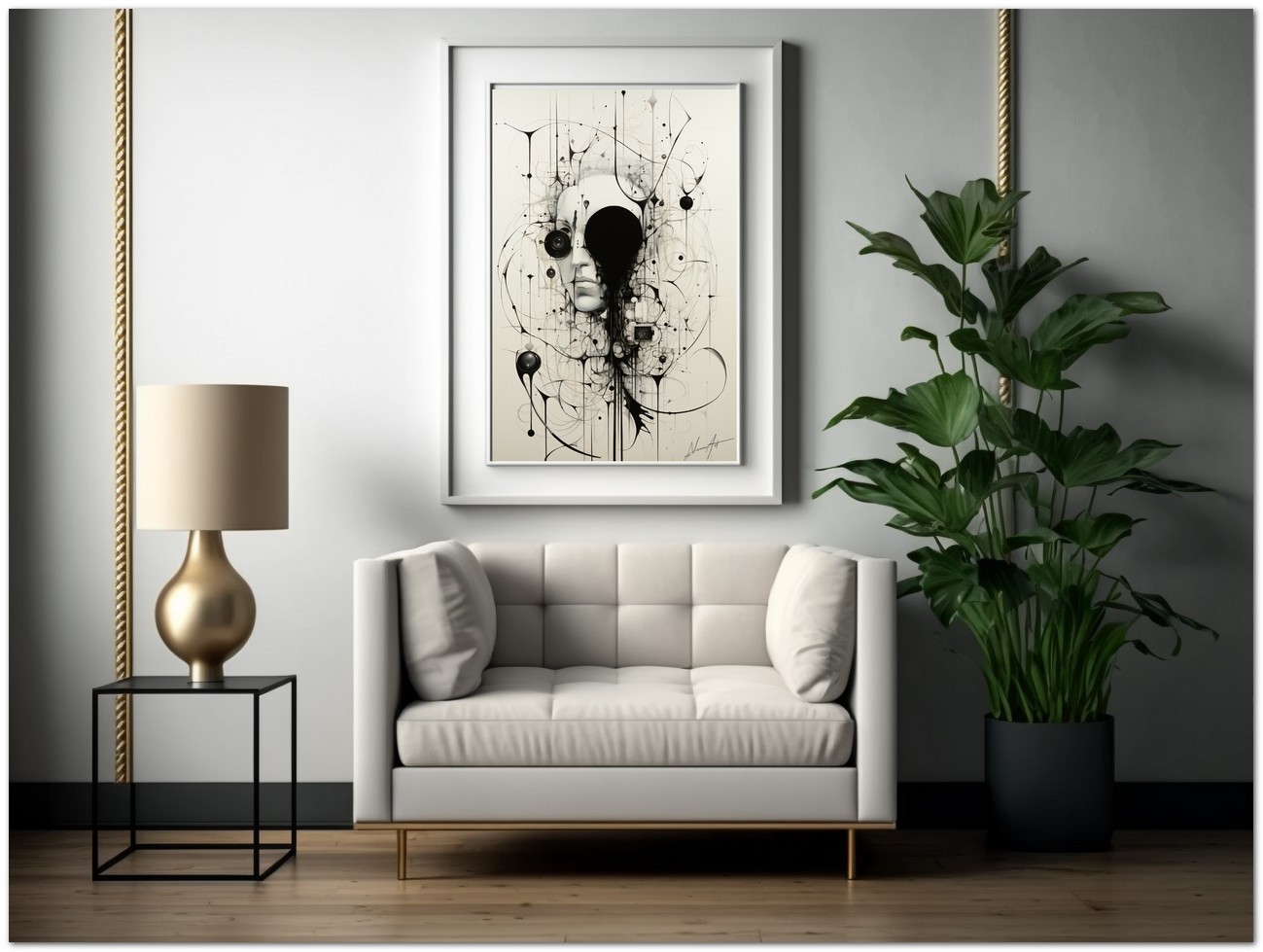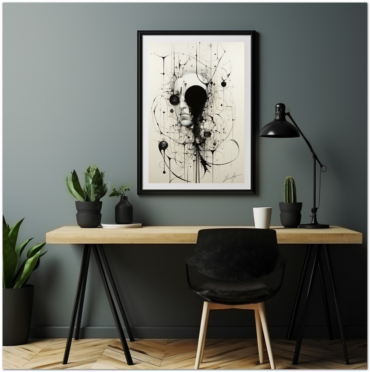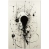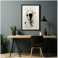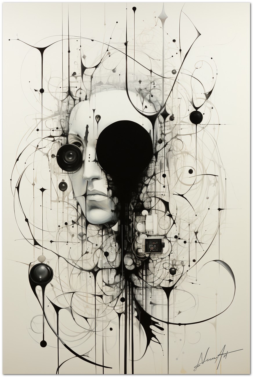 Das Werk präsentiert eine Schwarz-Weiß-Zeichnung, die ein abstraktes, dekonstruiertes Gesicht darstellt, das den gesamten Rahmen einnimmt und es schafft, mit ein paar rastlosen Strichen menschliche Merkmale einzufangen. Das Werk verbindet Elemente detaillierter Porträtmalerei mit abstraktem Design und schafft so eine harmonische Stilverschmelzung