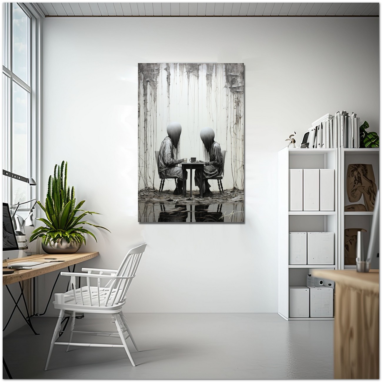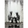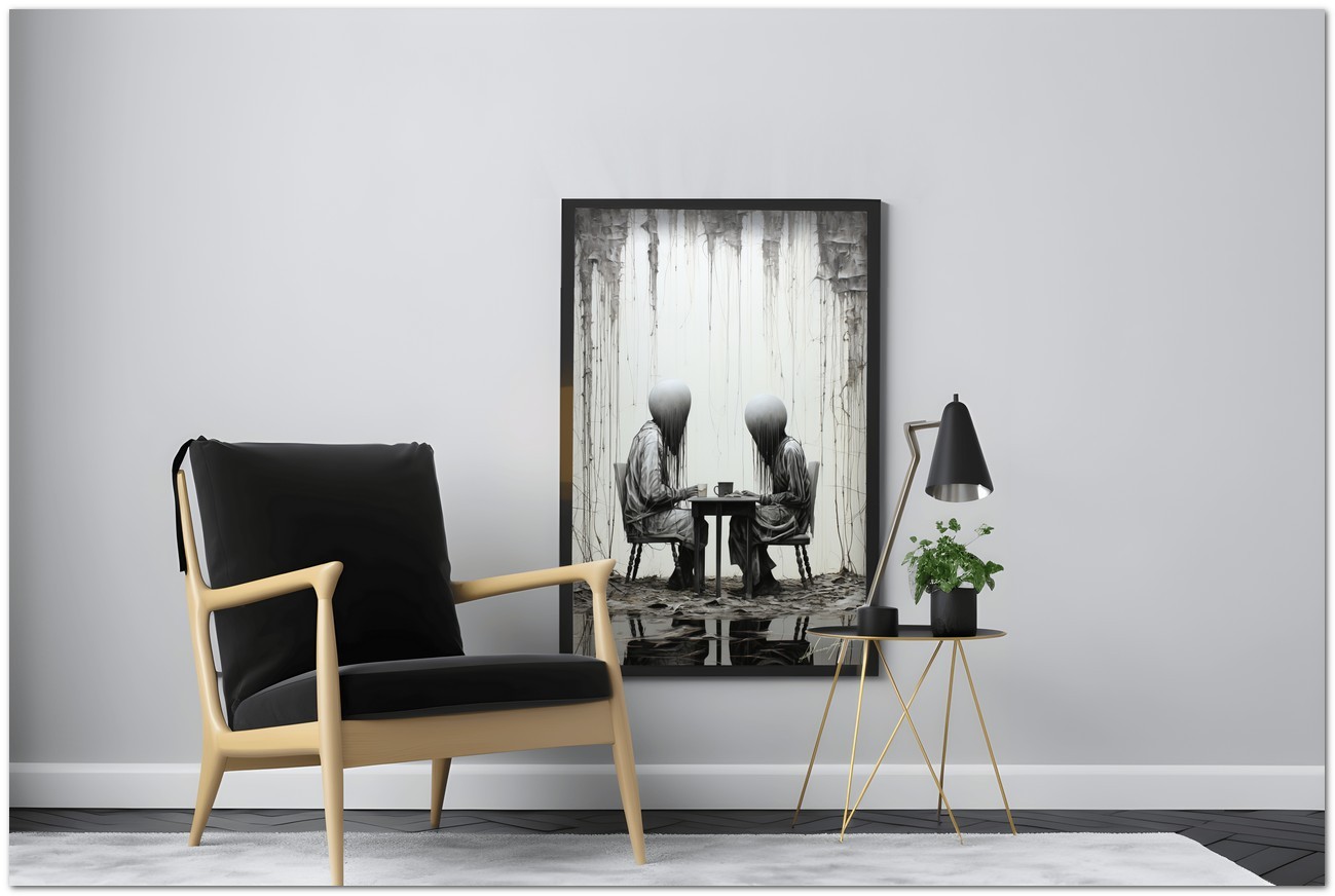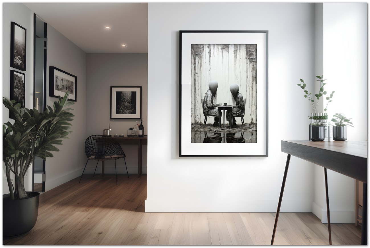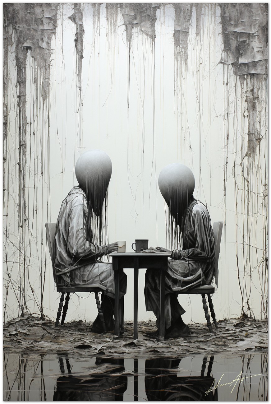 Das Werk zeigt eine faszinierende Szene mit zwei Personen, die an einem Tisch sitzen und in ihre eigenen Gedanken oder vielleicht in ein stilles Gespräch versunken sind. Die Wahl von Schwarz und Weiß und der Stil, mit dem die Motive dargestellt werden, verleihen dem Werk eine verstörende und intime Note zugleich. Aufgrund der detaillierten und getreuen Darstellung natürlicher Elemente kann das Werk mit dem Bildstil des Realismus in Verbindung gebracht werden. Über diese Arbeit: Klassifizierung, Techniken und Stile