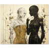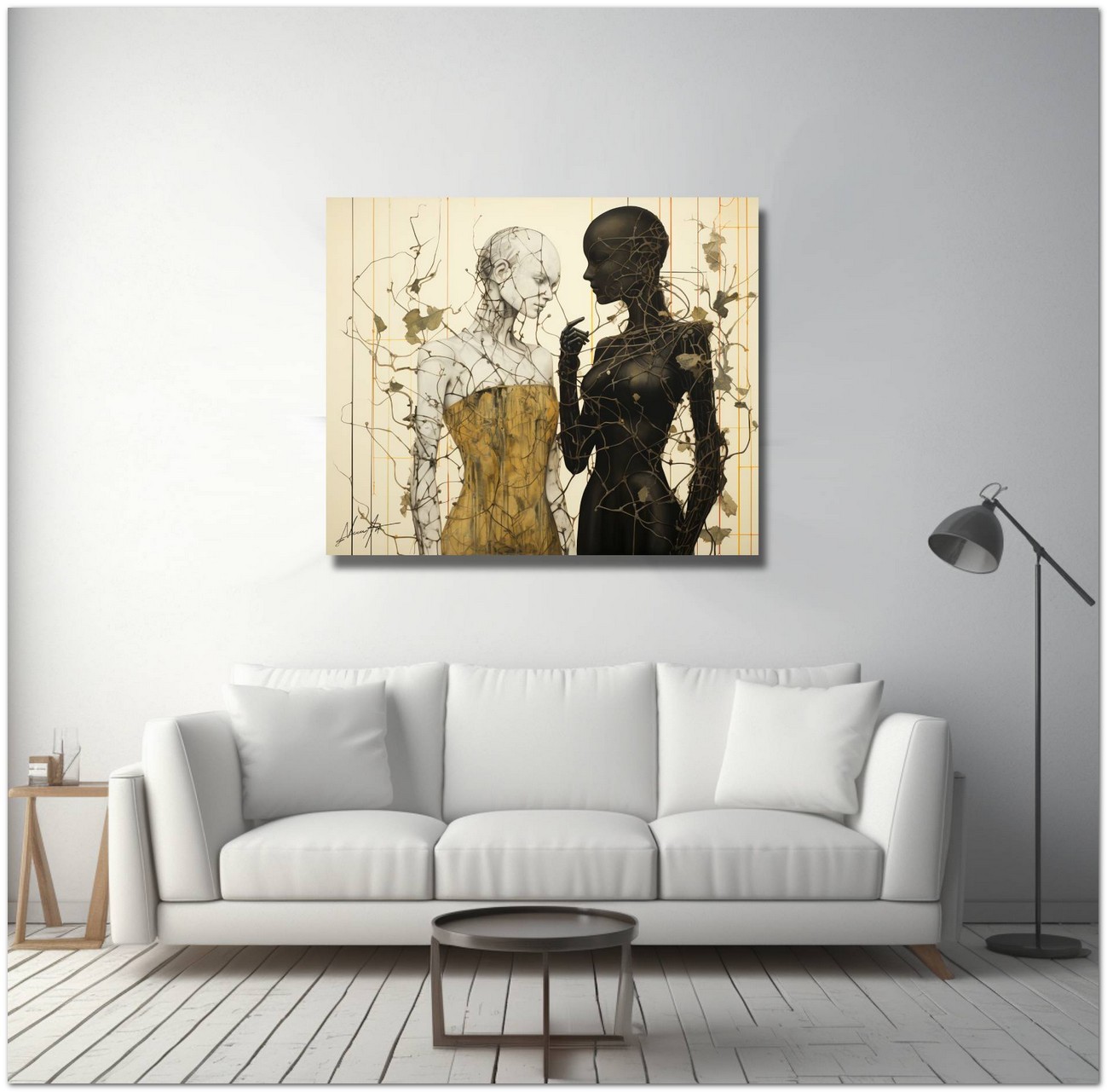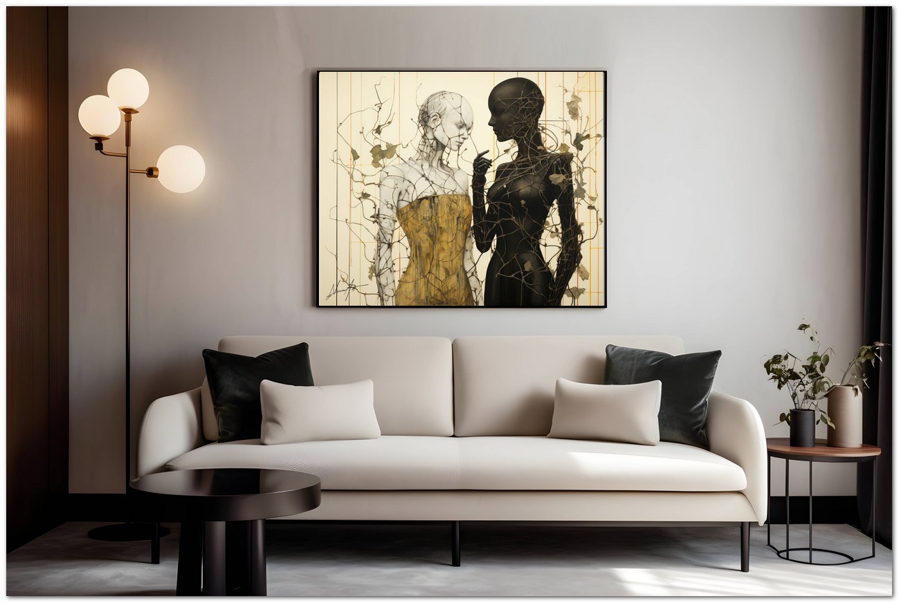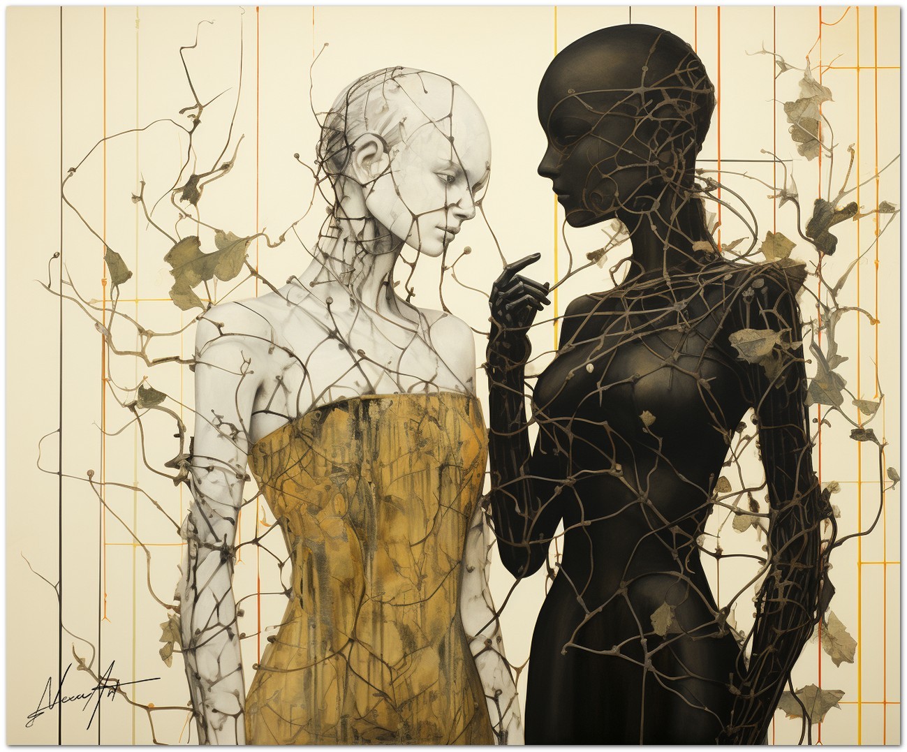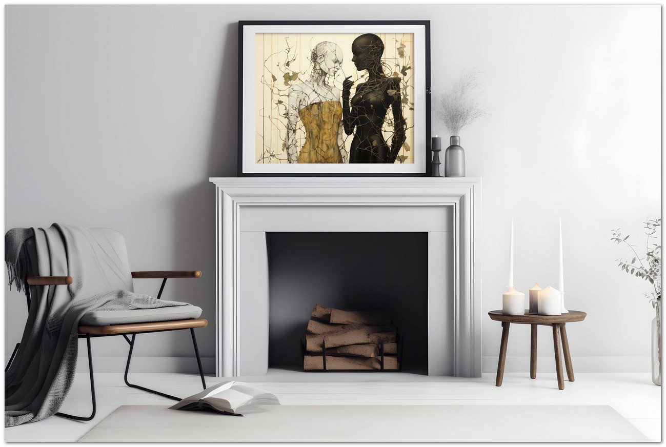 Das Werk ist ein faszinierendes Beispiel digitaler Kunst, die die Verschmelzung verschiedener Elemente und Themen darstellt. Im Zentrum der Szene stehen zwei weibliche Figuren, definiert, aber abstrakt, Seite an Seite, umwickelt von Kletterranken. Diese sind wie ein Netz, das versucht, sie zu trennen, aber als Beispiel für Harmonie und Widerstandsfähigkeit verhindern diese Brombeersträucher nicht ihre Nähe. Aufgrund der detaillierten und getreuen Darstellung natürlicher Elemente kann das Werk mit dem Bildstil des Realismus in Verbindung gebracht werden. Über diese Arbeit: Klassifizierung, Techniken und Stile