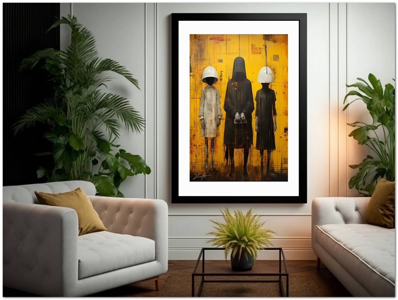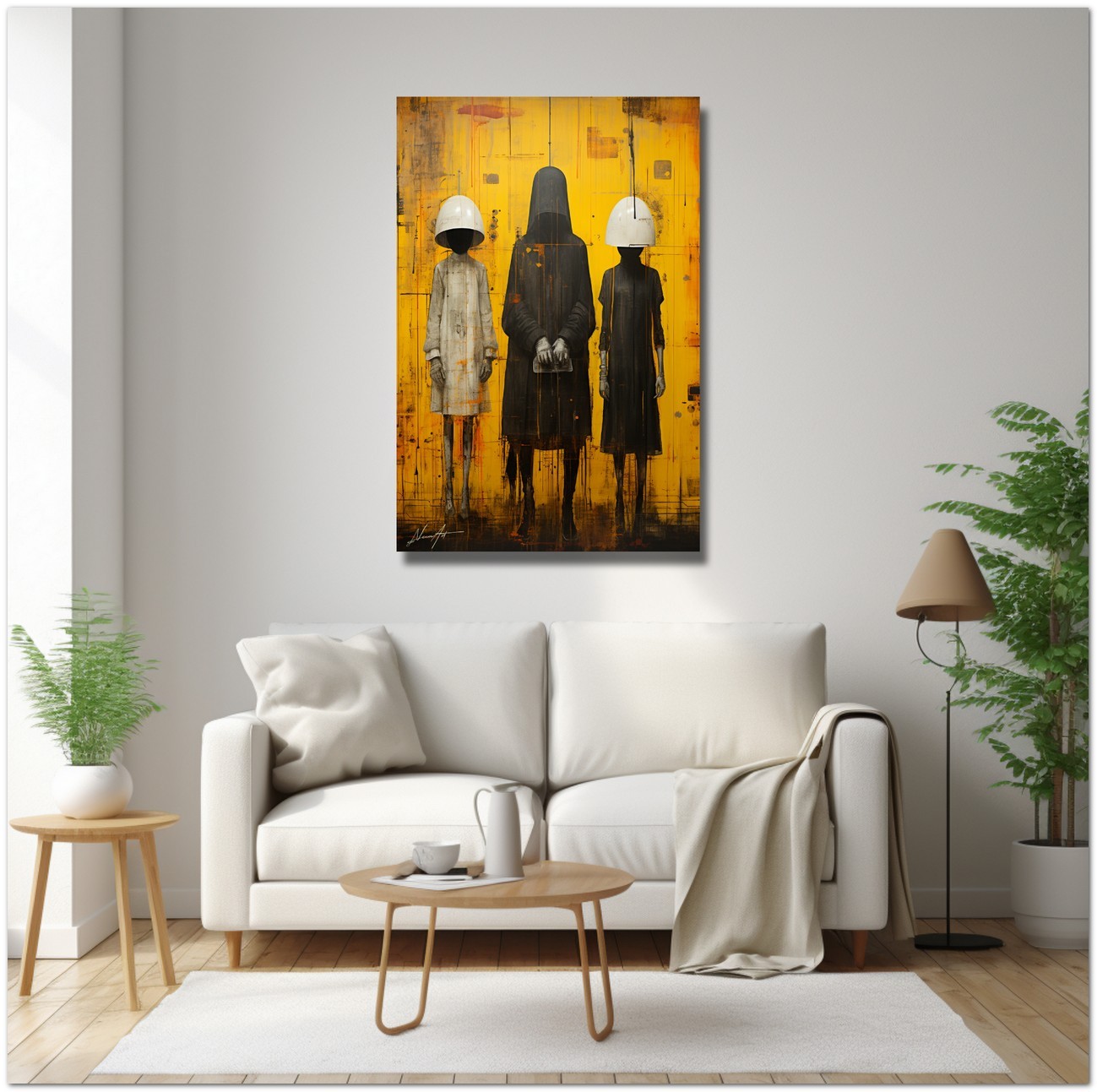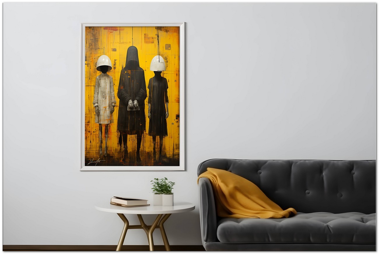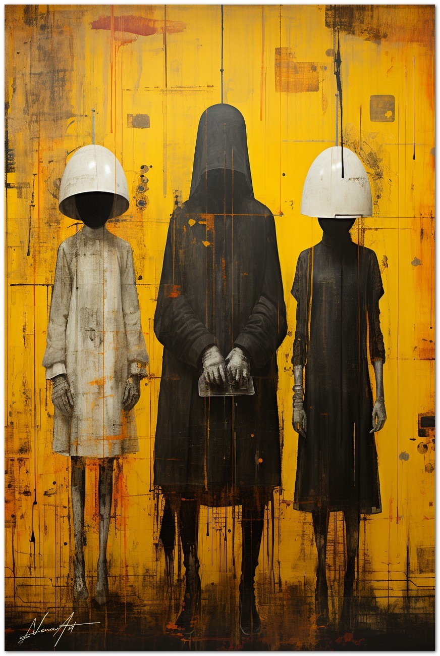 Das Werk stellt eine faszinierende Szene dar, die von Menschen bevölkert ist, die seltsame Masken tragen. Sie versammeln sich zu einem bezaubernden Tableau vor einem leuchtend gelben Hintergrund. Die Masken verschmelzen mit ihren Körpern, sehen aus wie ihre Anführer und bilden ein verstörendes Triptychon. Aufgrund der detaillierten und getreuen Darstellung natürlicher Elemente kann das Werk mit dem Bildstil des Realismus in Verbindung gebracht werden. Über diese Arbeit: Klassifizierung, Techniken und Stile