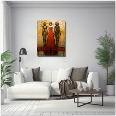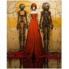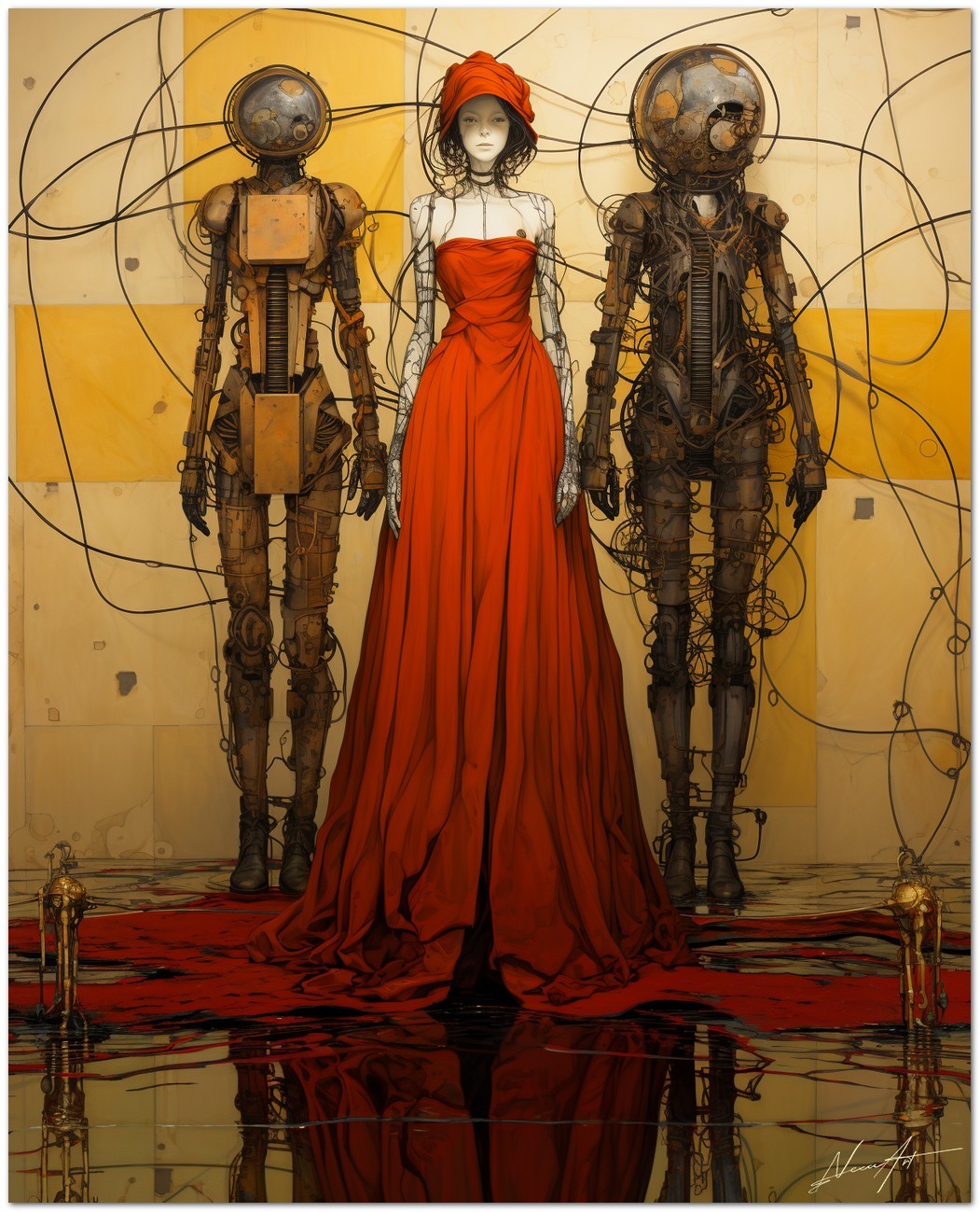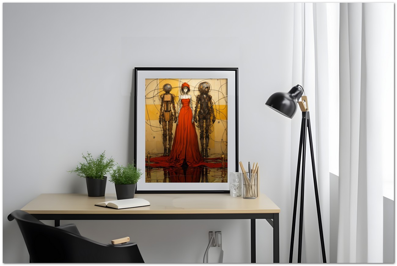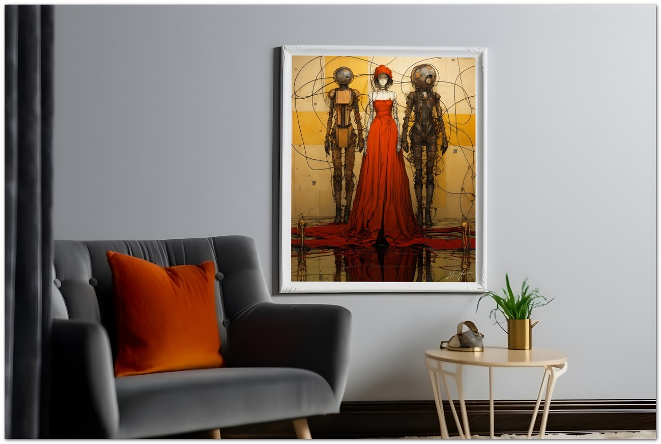 Dieses einzigartige digitale Kunstwerk präsentiert eine faszinierende Begegnung zwischen menschlicher Eleganz und Innovation. Eine Frau in fließenden roten Kleidern steht neben detaillierten mechanischen Wesen, die an Roboter erinnern und so einen visuellen Kontrast zwischen weiblicher Raffinesse und mechanischer Modernität schaffen. Aufgrund der detaillierten und getreuen Darstellung natürlicher Elemente kann das Werk mit dem Bildstil des Realismus in Verbindung gebracht werden. Über diese Arbeit: Klassifizierung, Techniken und Stile