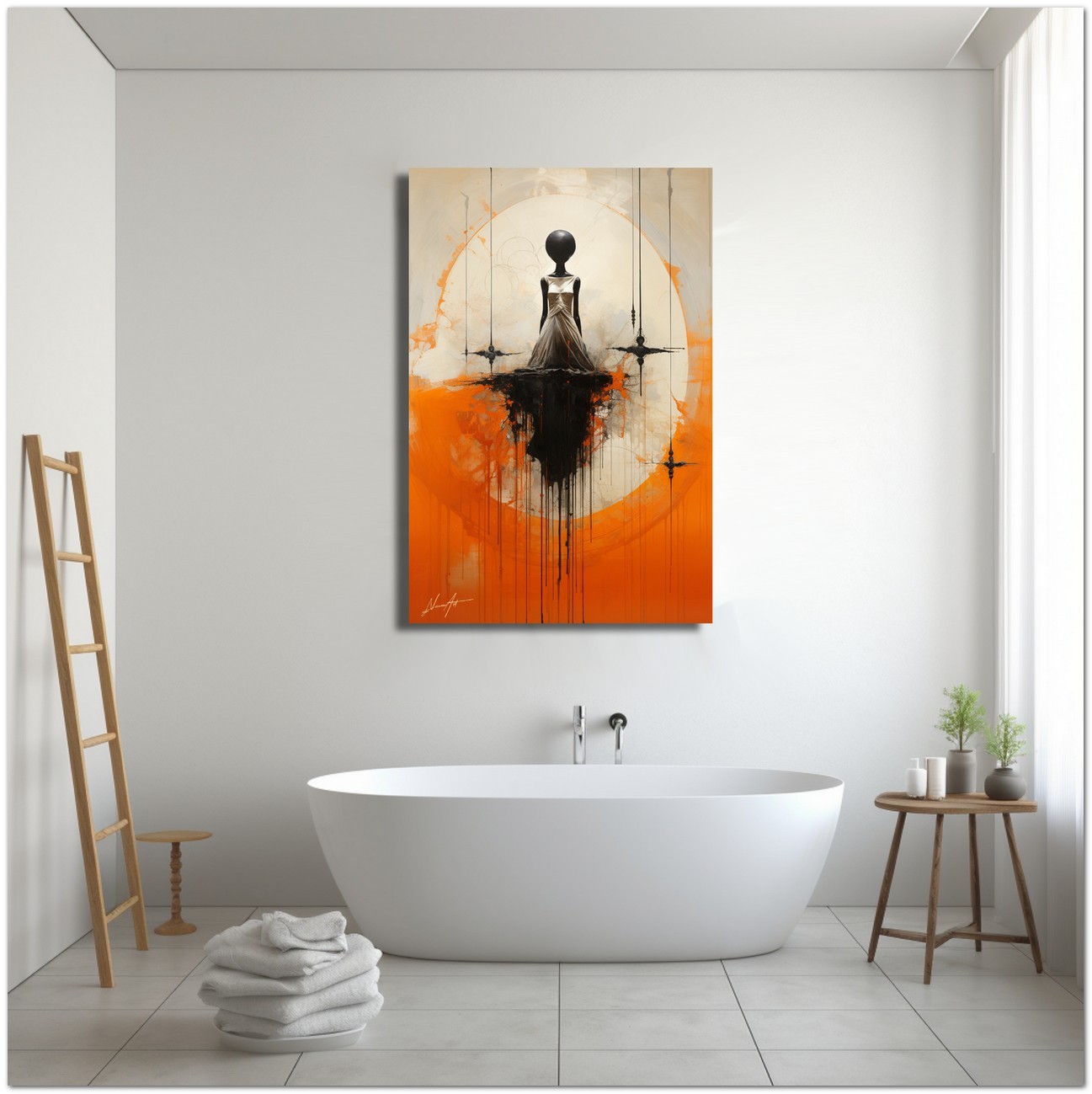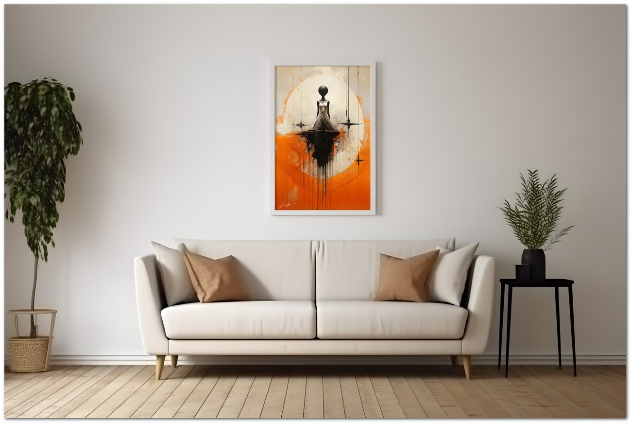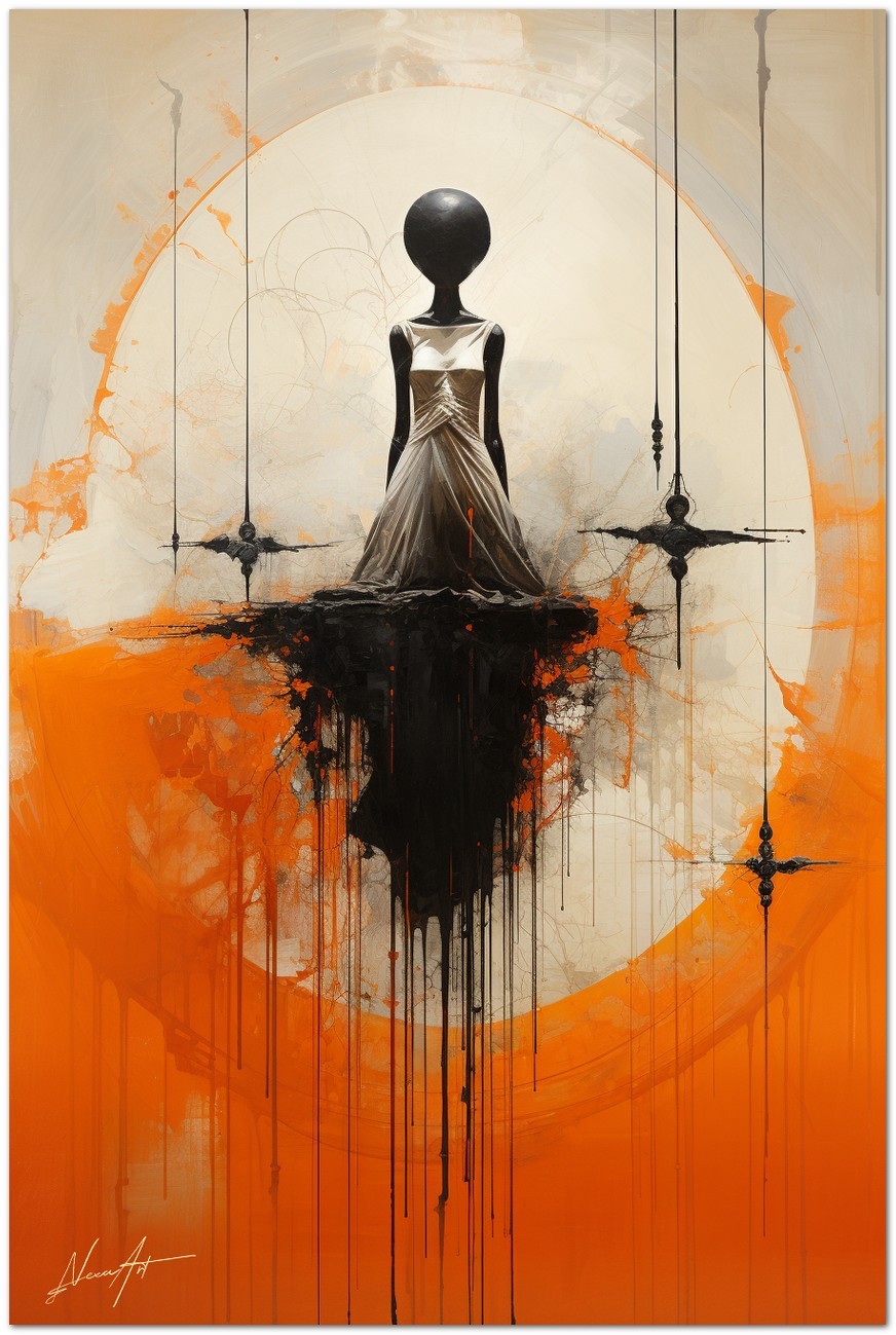 Das Werk zeigt eine Figur irgendwo zwischen weiblich und androgyn, mehr Mannequin als Mensch, geschmückt mit einem eleganten weißen Kleid, das die Aufmerksamkeit des Betrachters auf sich zieht, positioniert vor einem leuchtend orangefarbenen Hintergrund. Der abstrakte Charakter der Arbeit lädt zur Interpretation und Reflexion ein. Aufgrund der detaillierten und getreuen Darstellung natürlicher Elemente kann das Werk mit dem Bildstil des Realismus in Verbindung gebracht werden. Über diese Arbeit: Klassifizierung, Techniken und Stile