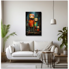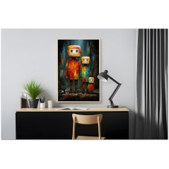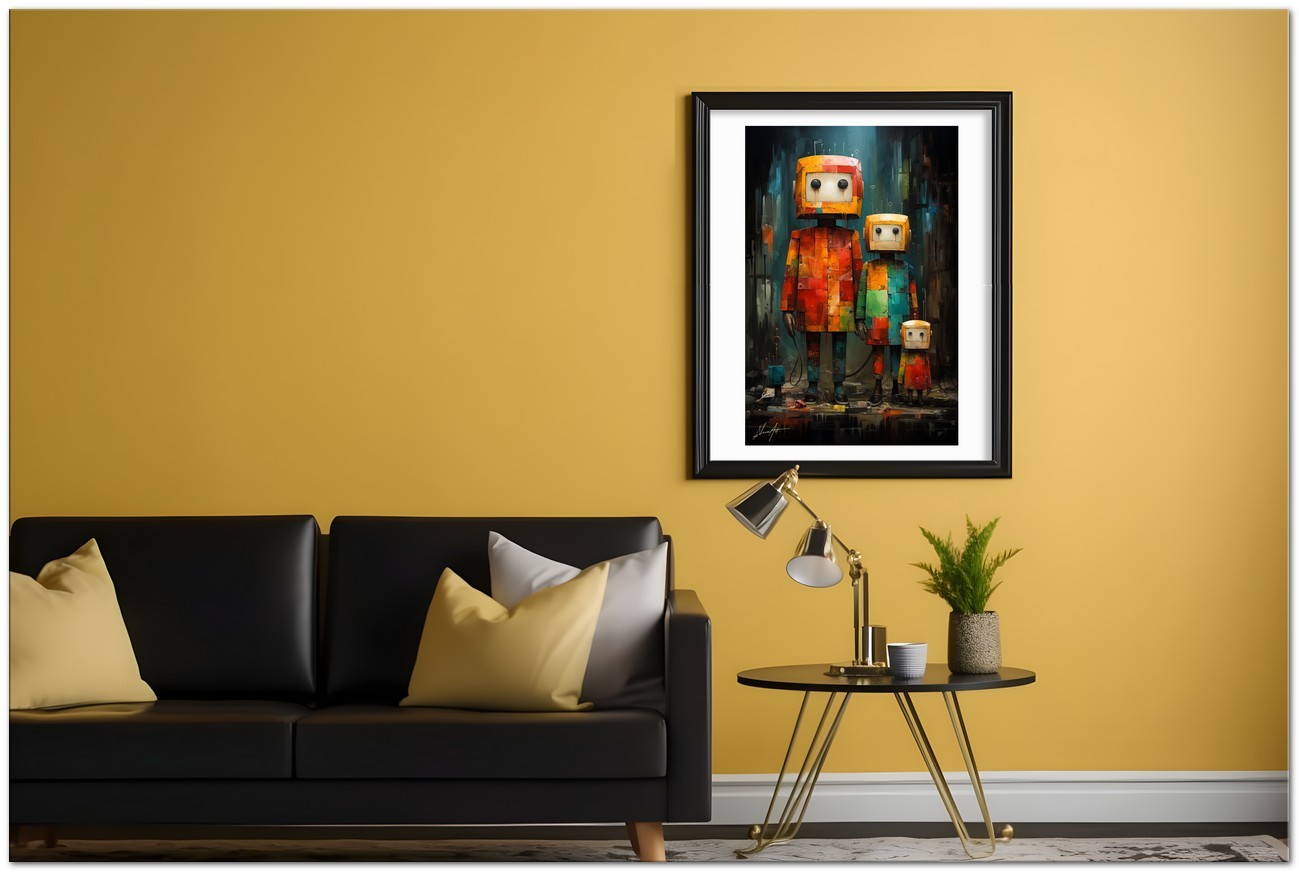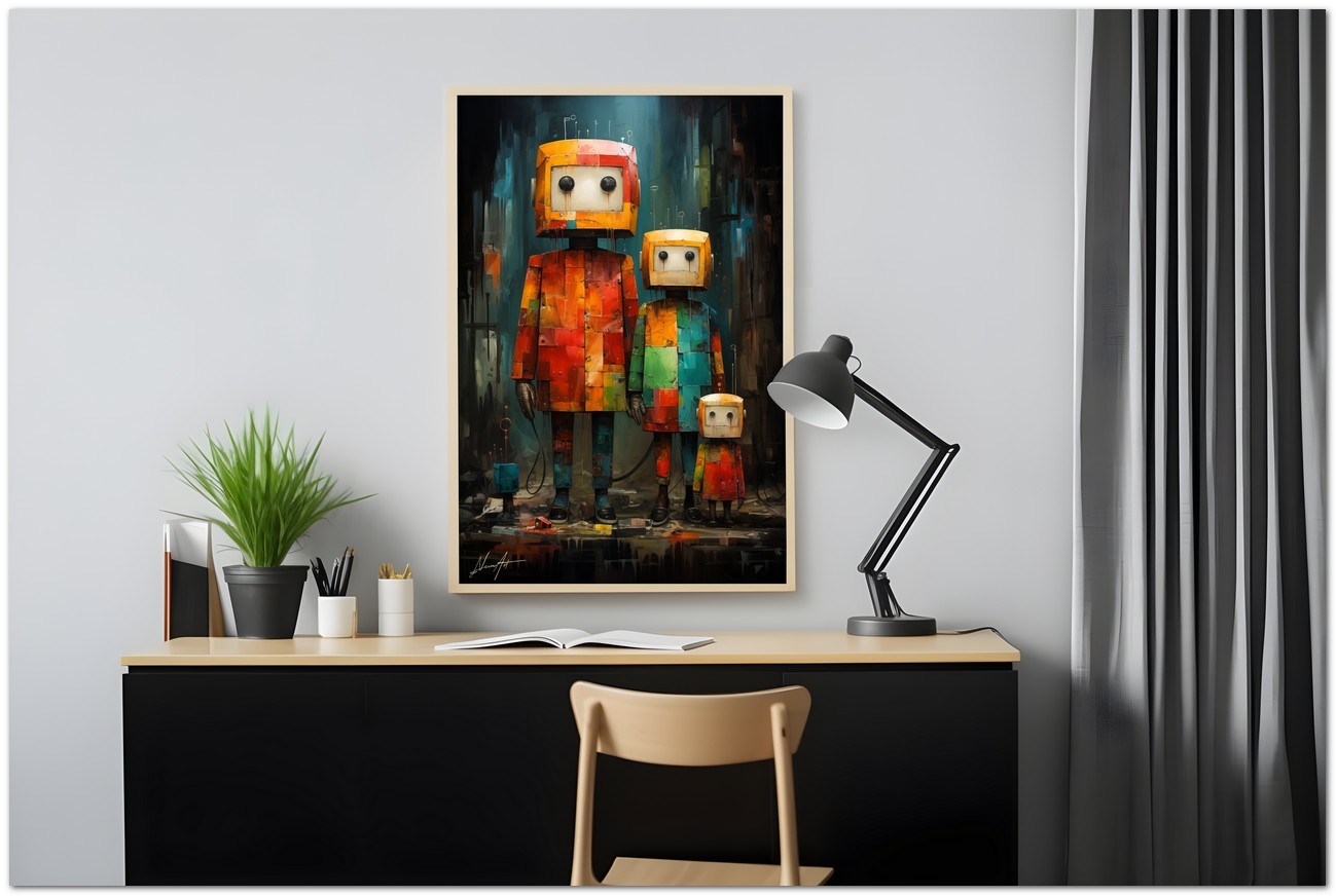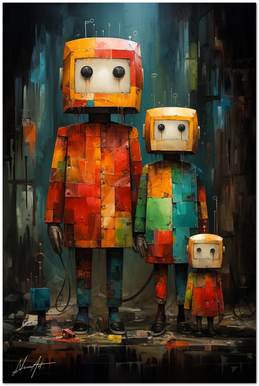 Das Werk stellt eine Familie von Robotern dar, jeder mit unterschiedlichen Eigenschaften und Charme. Die in kräftigen, leuchtenden Farben bemalten Roboter stehen im Mittelpunkt der Arbeit. In der Mitte strahlt ein Roboter mit großen, ausdrucksstarken Augen Unschuld und Neugier aus. Neben ihm bildet ein weiterer Roboter ein Paar und symbolisiert damit die Solidarität zwischen ihnen. Auf der rechten Seite drückt ein klassisch gestalteter Roboter Staunen aus