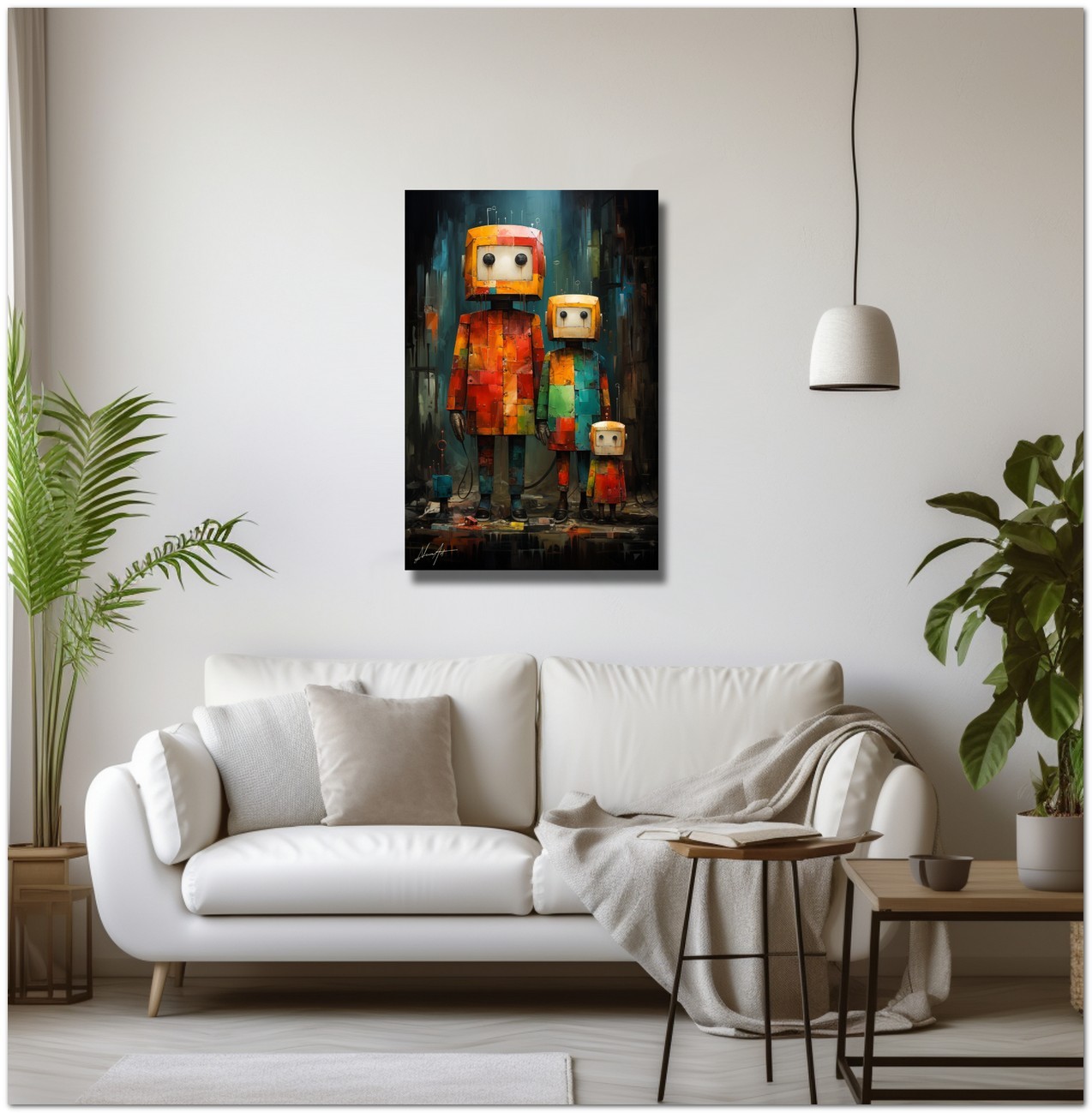 „Famiglia Robotica“ wird mit Fine Art Giclée-Drucktechnologie auf hochwertige Canvas-Leinwand reproduziert, was eine außergewöhnliche Farbwiedergabe und eine Haltbarkeit auf Museumsniveau garantiert.