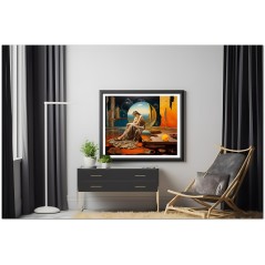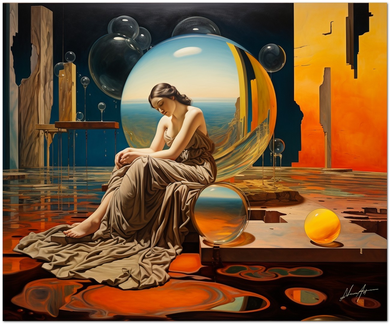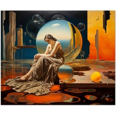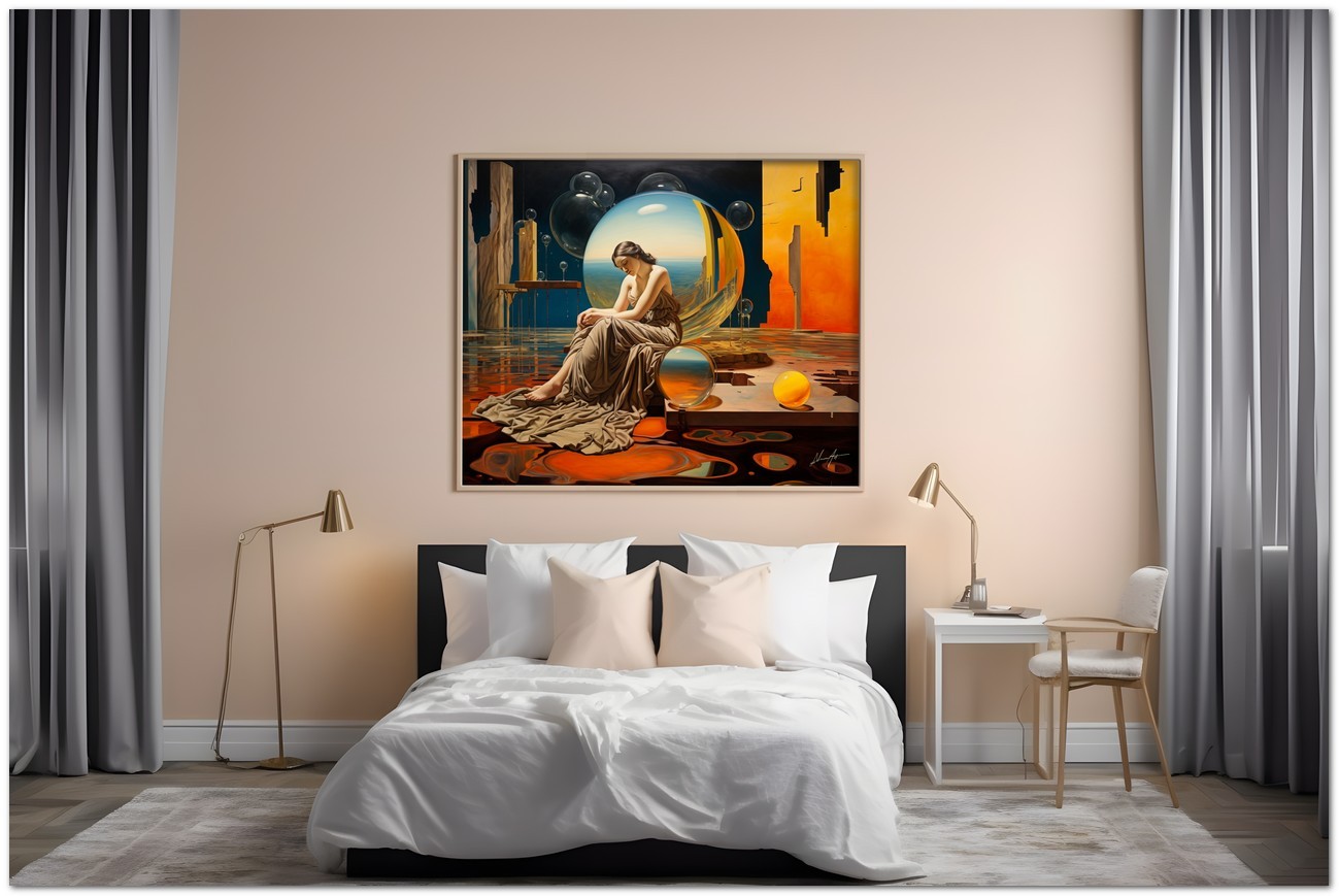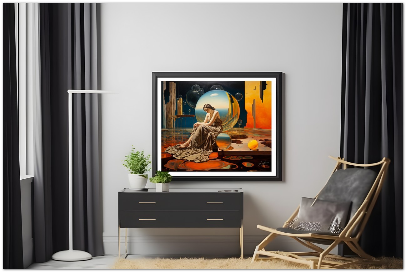 Das Werk zeigt eine faszinierende Frau, die im Zentrum einer Himmelssphäre positioniert ist, was auf eine kosmische Verbindung schließen lässt. Hypnotische Elemente umgeben es und schaffen eine traumhafte Atmosphäre. In einer Ecke ruht eine gelbe Glaskugel auf einer weiten Wüstenlandschaft, während ein mit einer Glaskugel verziertes Fenster in der Luft zu schweben scheint. Die Frau, die vor dieser Kugel sitzt, nimmt eine nachdenkliche Haltung ein und interagiert mit dem Rätsel vor ihr. Aufgrund der detaillierten und getreuen Darstellung natürlicher Elemente kann das Werk mit dem Bildstil des Realismus in Verbindung gebracht werden. Über diese Arbeit: Klassifizierung, Techniken und Stile