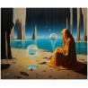 Das Gemälde zeigt eine Frau, die auf einem Stuhl sitzt und in eine traumhafte Umgebung eintaucht. Im Hintergrund sehen Sie eine friedliche maritime Szene mit sanften Wellen, die an die Küste schlagen. Der Blick der Frau ist auf eine Glaskugel gerichtet, die auf einem nahegelegenen Tisch steht. Die Kugel fängt mit ihren Blau- und Gelbtönen das Licht bezaubernd ein. Aufgrund der detaillierten und getreuen Darstellung natürlicher Elemente kann das Werk mit dem Bildstil des Realismus in Verbindung gebracht werden. Über diese Arbeit: Klassifizierung, Techniken und Stile