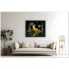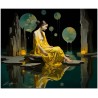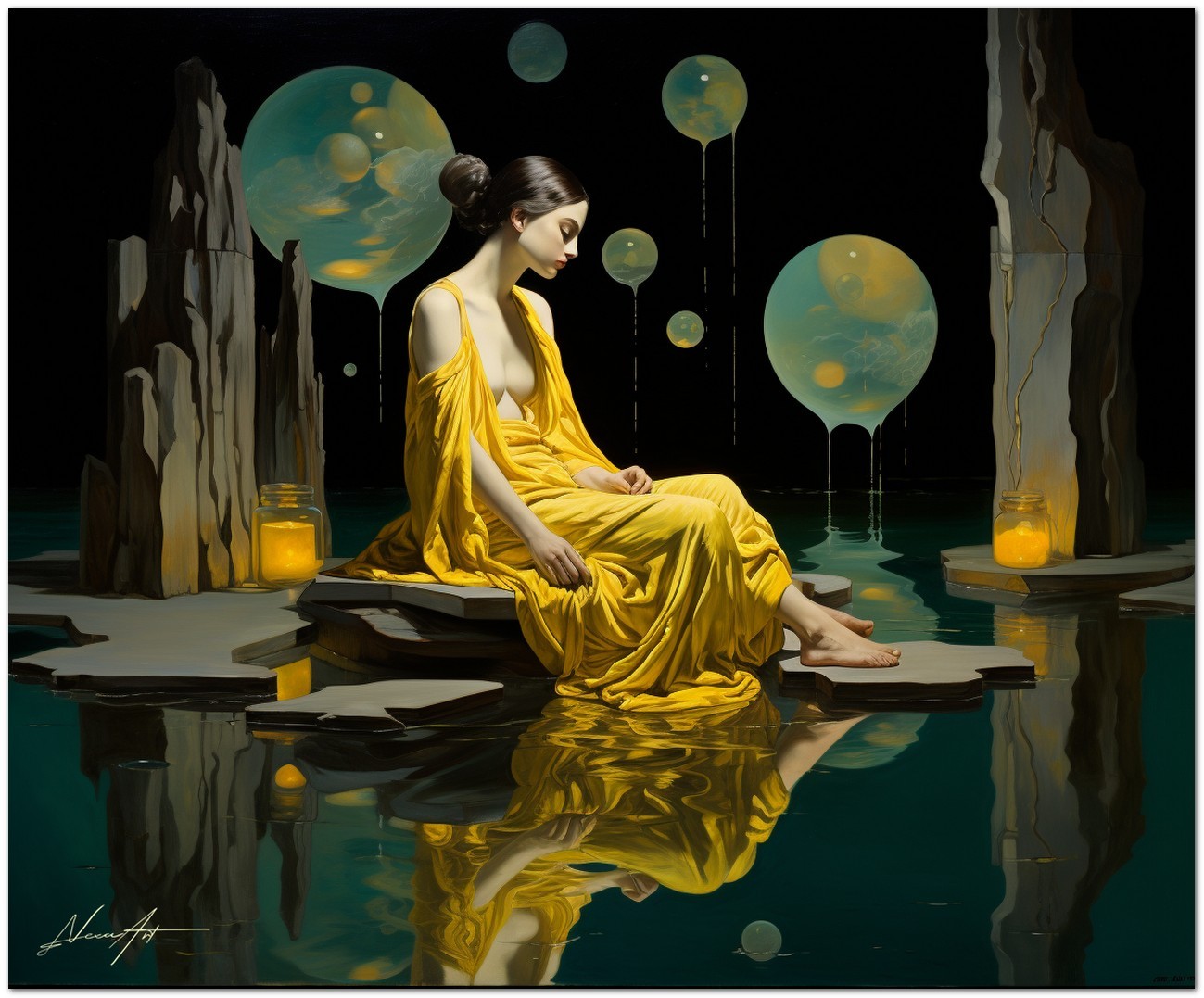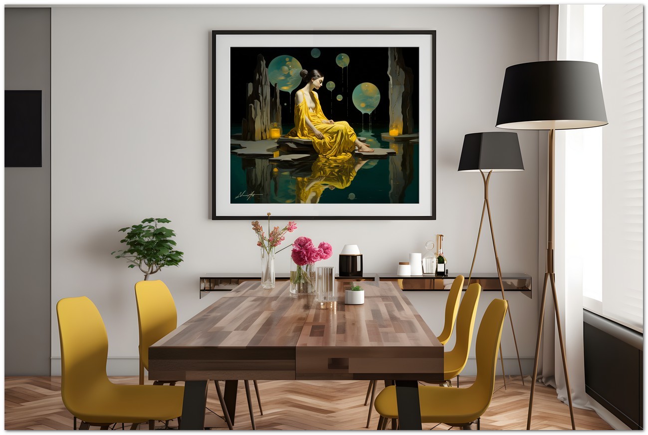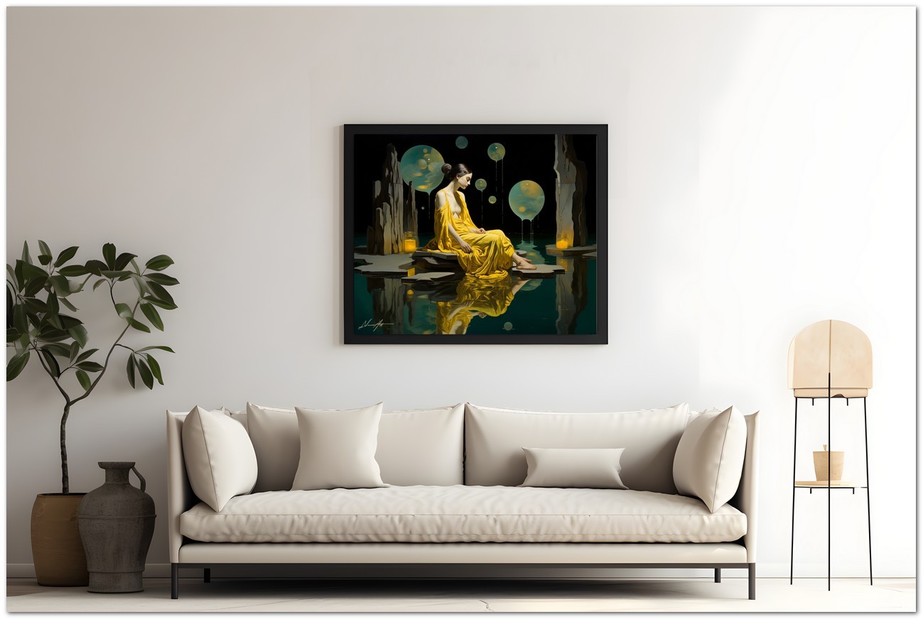 Das Werk zeigt eine bezaubernde Szene mit einer Frau in einem leuchtend gelben Kleid, die friedlich auf einem glatten Felsen sitzt und den Mittelpunkt des Gemäldes darstellt. Die Frau blickt gelassen in die Ferne und strahlt ein Gefühl der Ruhe aus. Im Vordergrund schwebt eine gelbe Kugel zart über einem Gewässer und schafft eine ätherische, traumhafte Atmosphäre. Aufgrund der detaillierten und getreuen Darstellung natürlicher Elemente kann das Werk mit dem Bildstil des Realismus in Verbindung gebracht werden. Über diese Arbeit: Klassifizierung, Techniken und Stile