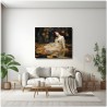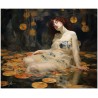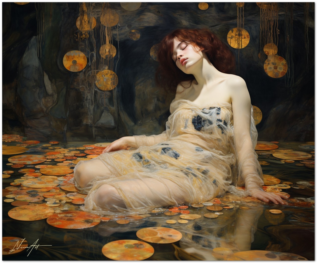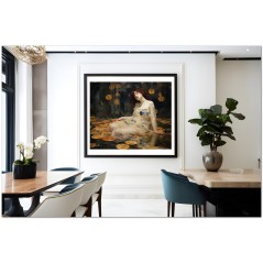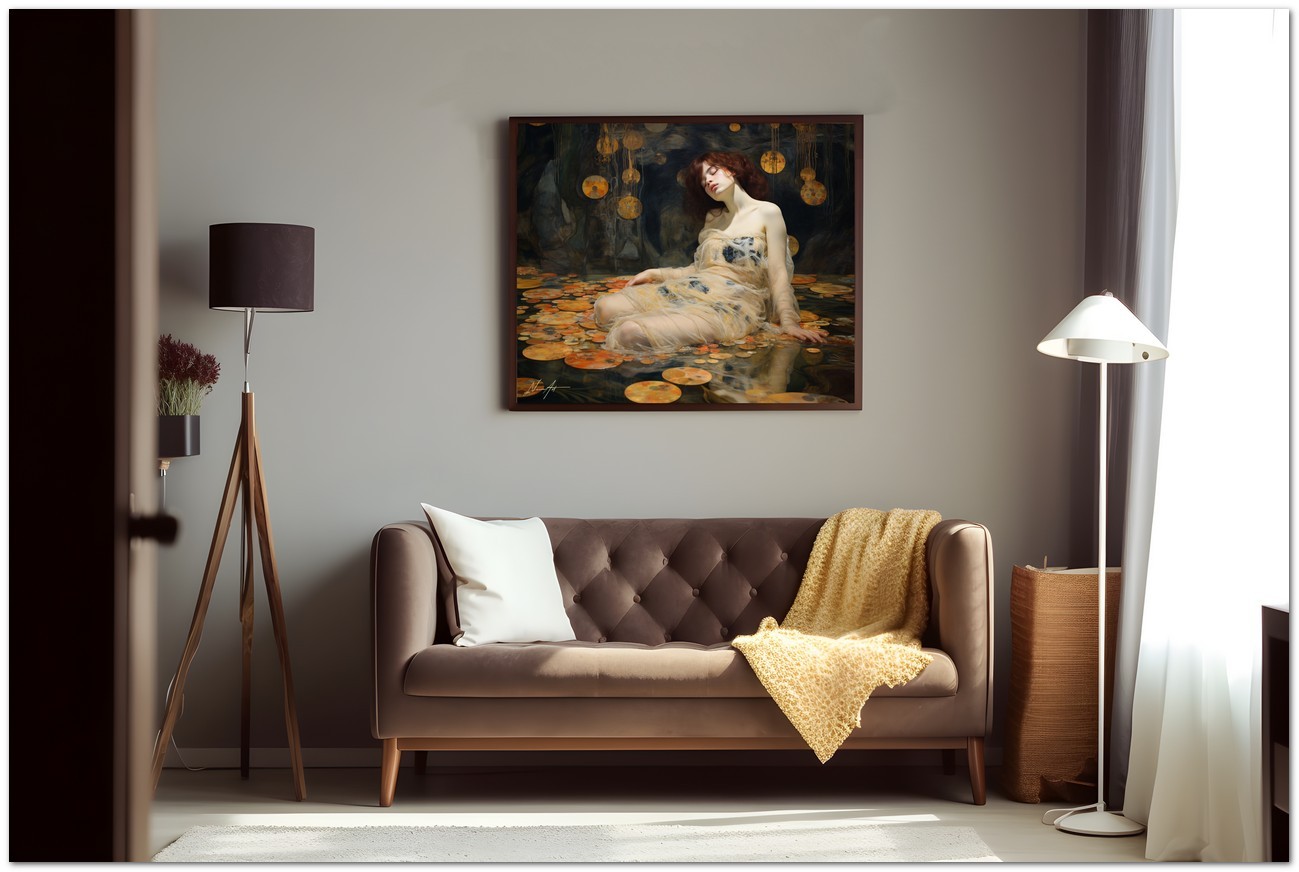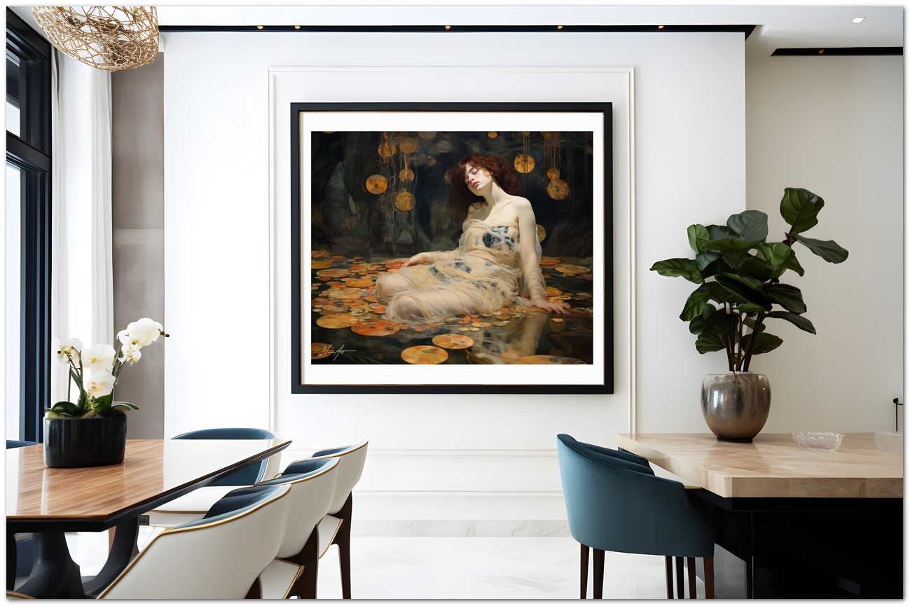 Das Werk zeigt eine glamouröse Frau in einem fließenden weißen Kleid, die anmutig auf einer riesigen Lotusblume posiert. Dieses ätherische Porträt wird von einem Gemälde umrahmt, das die Frau zeigt, wie sie in einer mystischen Höhle liegt und vom sanften Licht einer jenseitigen Atmosphäre beleuchtet wird. Aufgrund der detaillierten und getreuen Darstellung natürlicher Elemente kann das Werk mit dem Bildstil des Realismus in Verbindung gebracht werden. Über diese Arbeit: Klassifizierung, Techniken und Stile