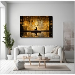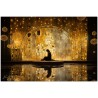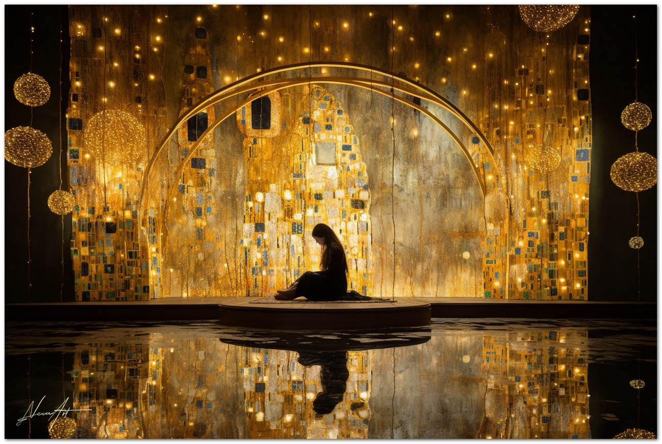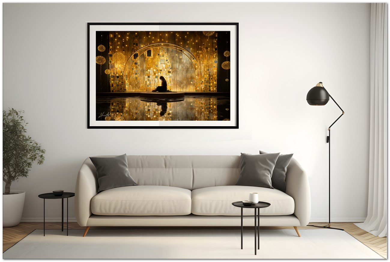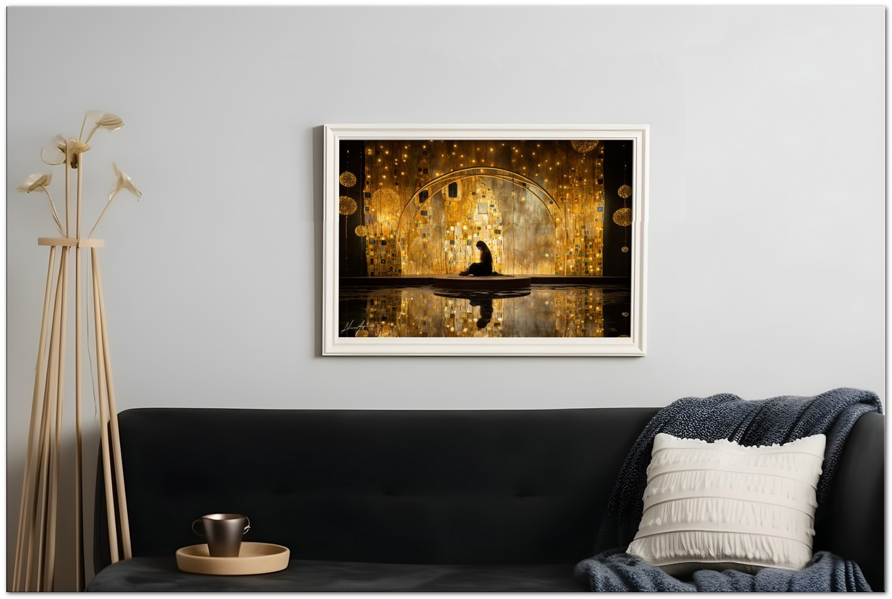 Beim Betreten einer ätherischen Traumlandschaft wird der Betrachter vom Anblick einer Frau begrüßt, die zart auf einer Holzplattform sitzt. Es sitzt anmutig vor einer prächtigen goldenen Wand, die einen warmen und einladenden Glanz ausstrahlt. Die Wand, die sich durch die gesamte Komposition zieht, strahlt eine Aura von Opulenz und Geheimnis aus. Aufgrund der detaillierten und getreuen Darstellung natürlicher Elemente kann das Werk mit dem Bildstil des Realismus in Verbindung gebracht werden. Über diese Arbeit: Klassifizierung, Techniken und Stile
