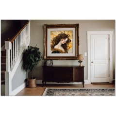 Das Werk zeigt eine Frau von außergewöhnlicher Schönheit mit langen lockigen Haaren. Die gesamte Leinwand wird von seiner Präsenz dominiert, die durch die leuchtenden Farben und detaillierten Pinselstriche noch faszinierender wird. Das Gesicht der Frau, insbesondere ihre Lippen und Augen, stehen im Mittelpunkt der Komposition. Aufgrund der detaillierten und getreuen Darstellung natürlicher Elemente kann das Werk mit dem Bildstil des Realismus in Verbindung gebracht werden. Über diese Arbeit: Klassifizierung, Techniken und Stile