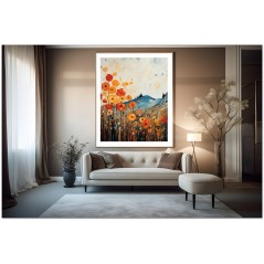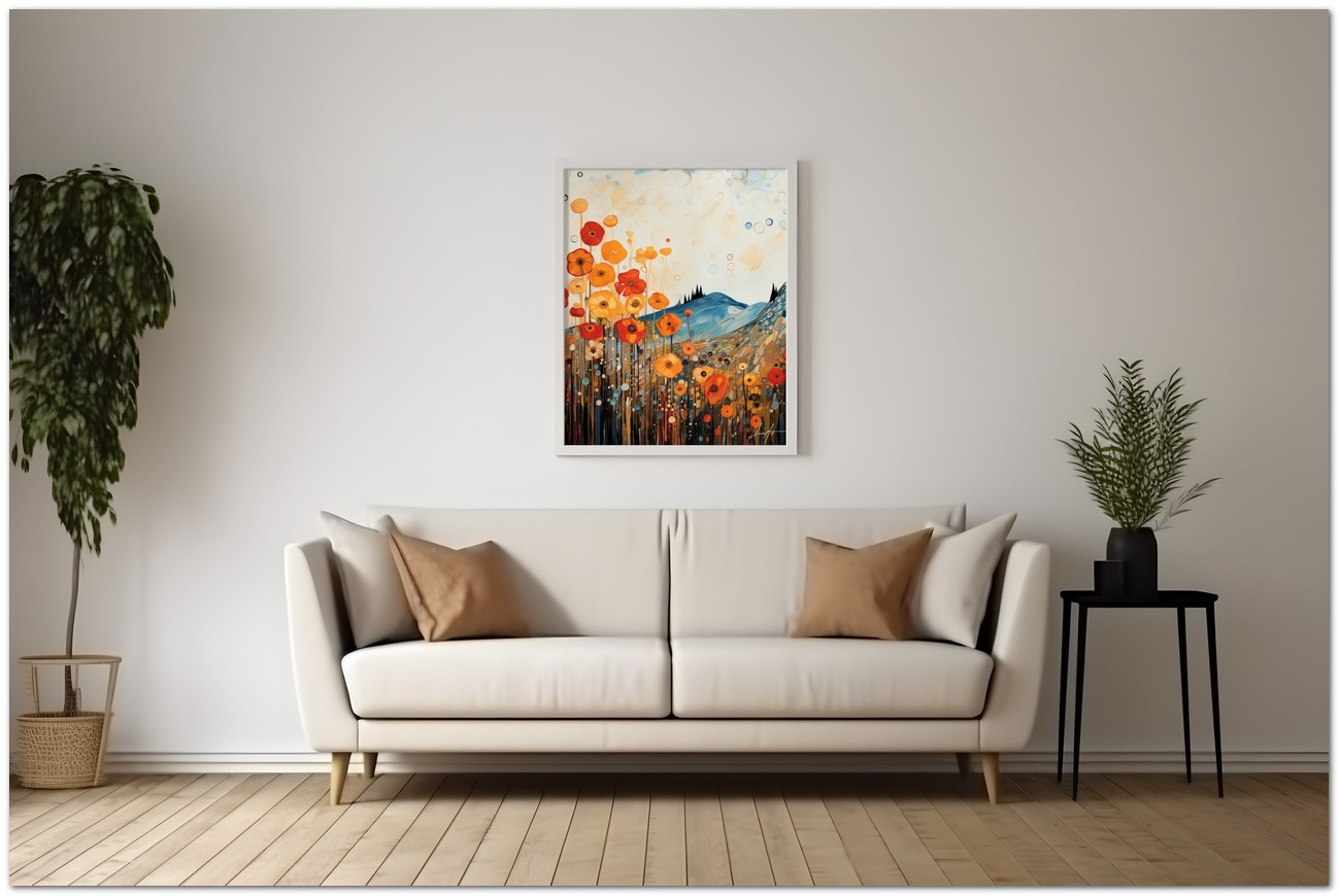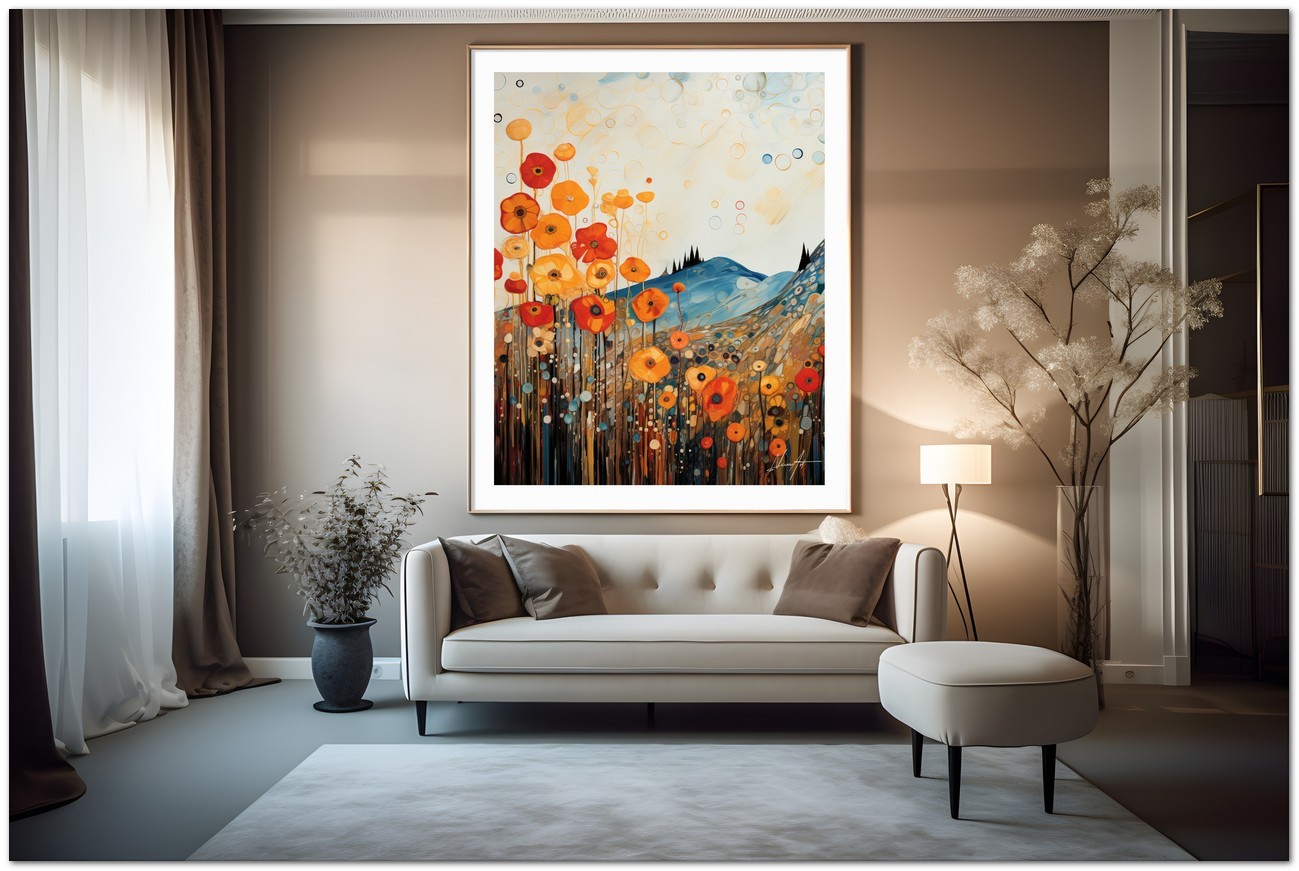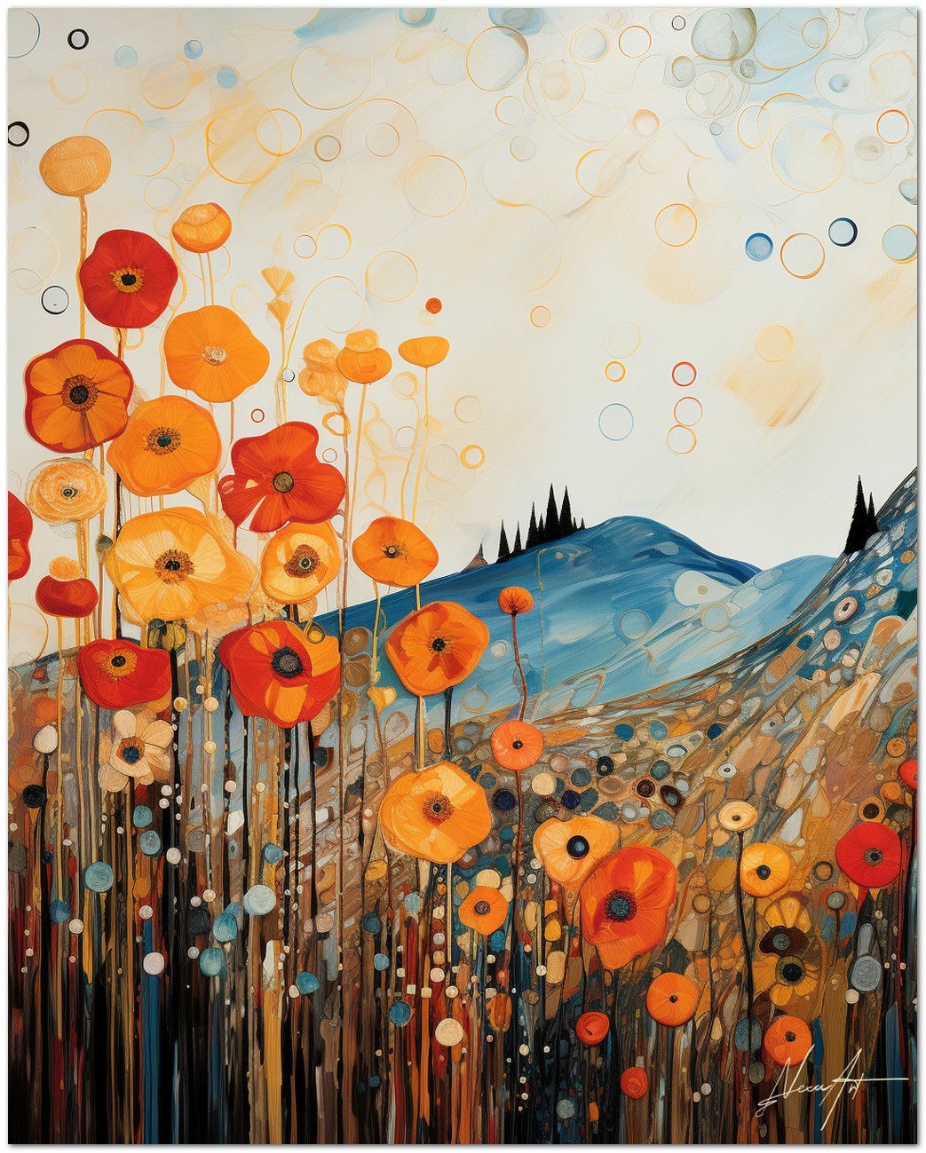 Ein faszinierendes Gemälde ist in lebendige Farbtöne getaucht und fängt die Essenz eines schimmernden Blumenfeldes ein. Der Blick des Betrachters wird sofort von den orangefarbenen Mohnblumen angezogen, die die Komposition dominieren und sich wie ein fließender Farbfluss über die Leinwand erstrecken. Diese strahlenden Blumen sind vor einem blauen Himmel dargestellt und erzeugen einen auffälligen Kontrast, der ihre Lebendigkeit verstärkt. Aufgrund der detaillierten und getreuen Darstellung natürlicher Elemente kann das Werk mit dem Bildstil des Realismus in Verbindung gebracht werden. Über diese Arbeit: Klassifizierung, Techniken und Stile