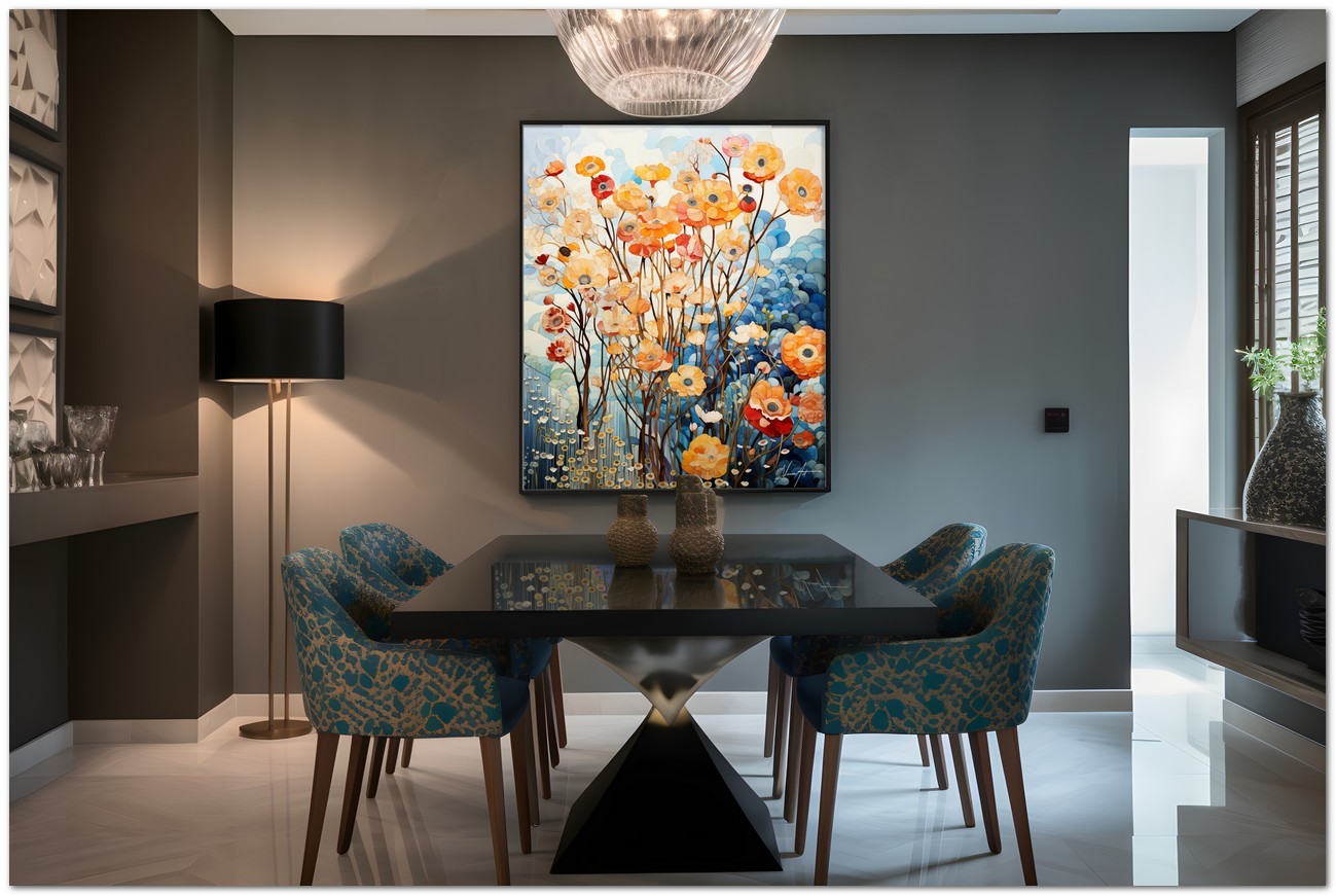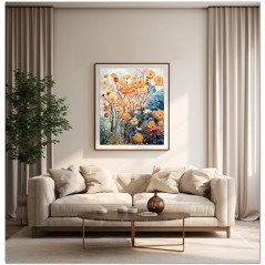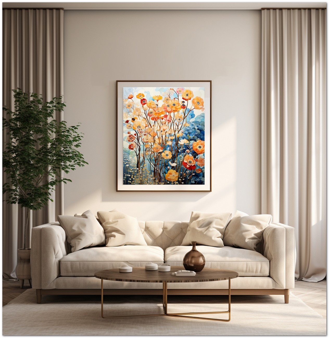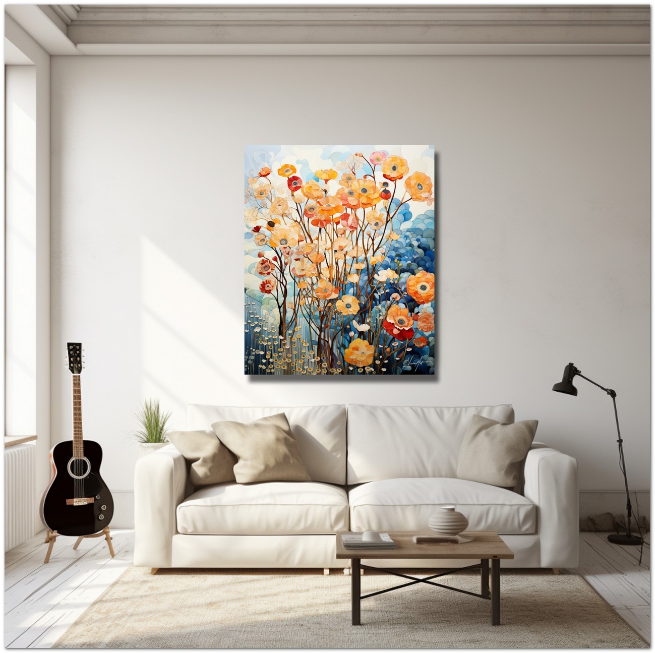 Ein komplizierter Garten aus hellen, farbenfrohen Blumen erhebt sich majestätisch, umgeben von wolkigen Formen und zarten Farbtönen. Jede Blume scheint eine Geschichte zu erzählen, wobei sich die Blütenblätter in Orange-, Gelb- und Rottönen entwickeln, während die wellenförmigen Formen im Hintergrund ein Gefühl von Frieden und Ruhe hervorrufen. Aufmerksamkeit und lädt den Betrachter ein, sich in der Schönheit der Natur zu verlieren. Aufgrund der detaillierten und getreuen Darstellung natürlicher Elemente kann das Werk mit dem Bildstil des Realismus in Verbindung gebracht werden. Über diese Arbeit: Klassifizierung, Techniken und Stile