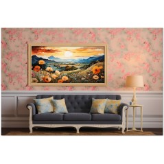 Eine idyllische Darstellung einer Berglandschaft bei Sonnenuntergang, in der feurige Wolken eine blasse Sonne umhüllen. Riesige goldene Felder vermischen sich mit majestätischen Bergen, während leuchtender Mohn und andere Wildpflanzen den Vordergrund schmücken und für einen spektakulären visuellen Kontrast sorgen. Aufgrund der detaillierten und getreuen Darstellung natürlicher Elemente kann das Werk mit dem Bildstil des Realismus in Verbindung gebracht werden. Über diese Arbeit: Klassifizierung, Techniken und Stile