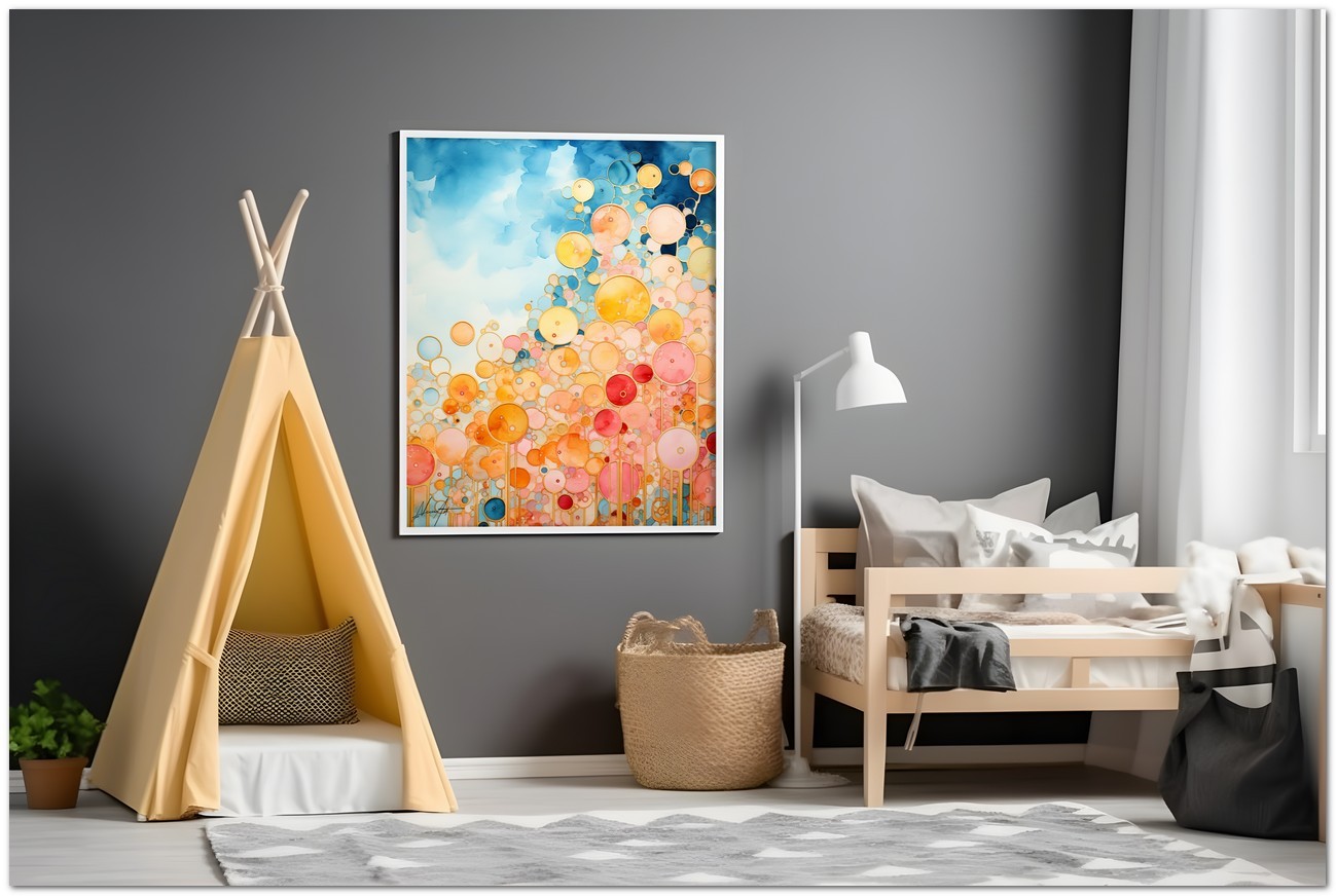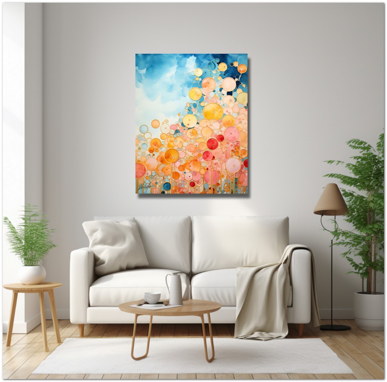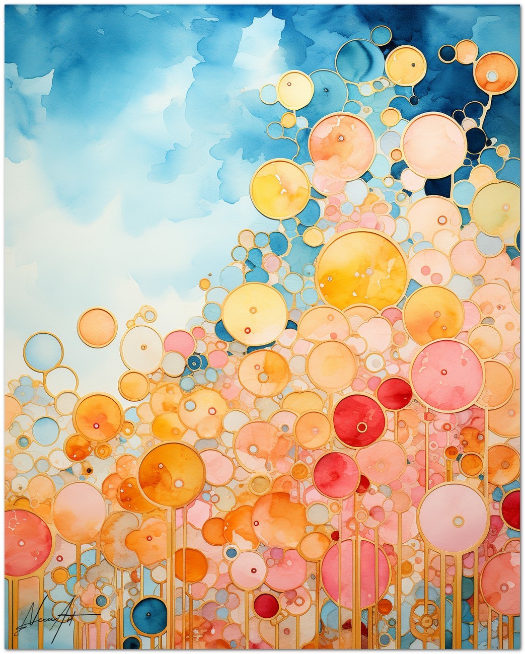 Eine Kaskade aus Kugeln und Blasen in verschiedenen Farbtönen erhebt sich aus einem Boden mit warmen Farbtönen und trifft auf einen lebhaften und turbulenten türkisfarbenen Himmel. Die Komposition lädt den Betrachter auf eine Reise durch Farbkontraste und visuelle Dynamiken ein. Aufgrund der detaillierten und getreuen Darstellung natürlicher Elemente kann das Werk mit dem Bildstil des Realismus in Verbindung gebracht werden. Über diese Arbeit: Klassifizierung, Techniken und Stile
