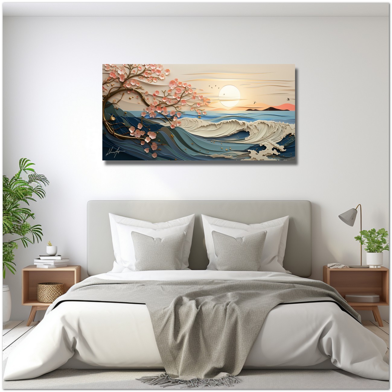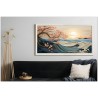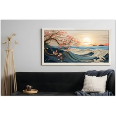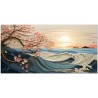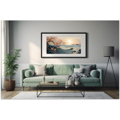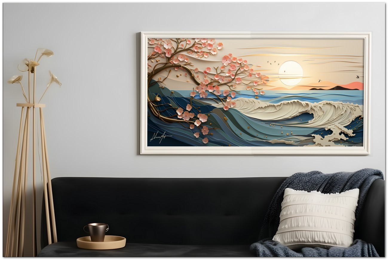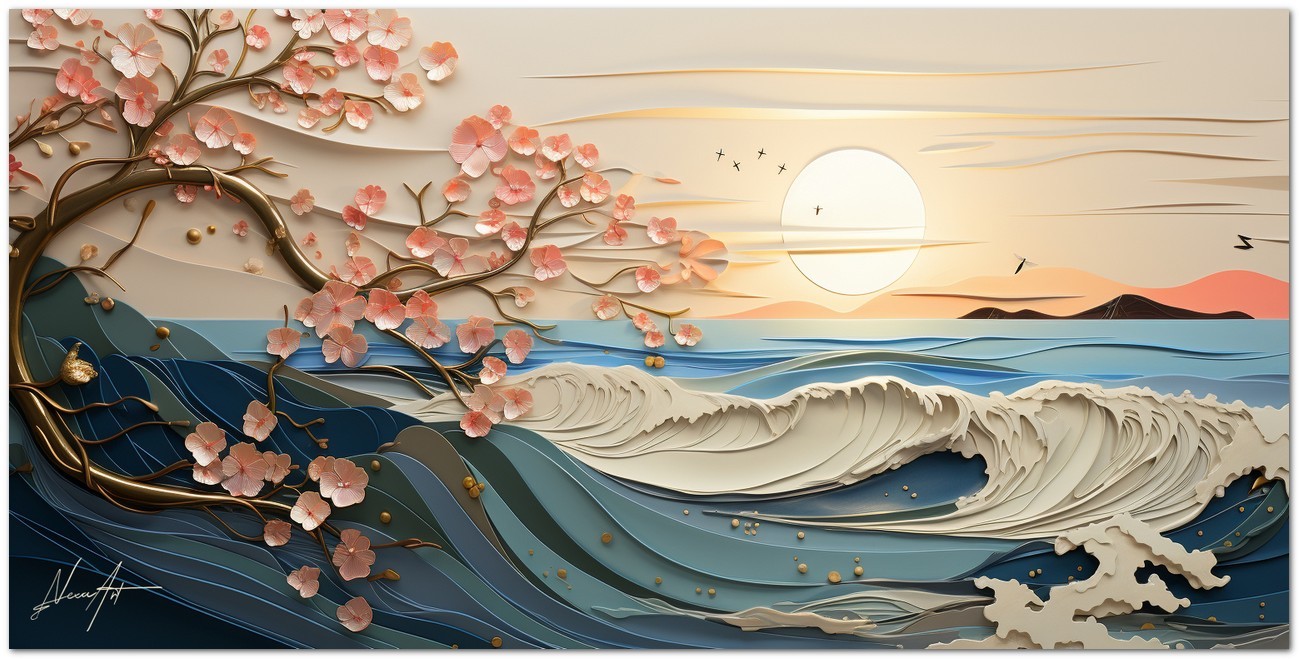 Die Kraft einer blauen Welle bricht im zarten Licht des Sonnenuntergangs, während rosa blühende Zweige elegant über das Meer ragen und einen Kontrast aus Stärke und Zerbrechlichkeit erzeugen. Vögel fliegen frei am Himmel und betonen die Ruhe der Landschaft. Aufgrund der detaillierten und getreuen Darstellung natürlicher Elemente kann das Werk mit dem Bildstil des Realismus in Verbindung gebracht werden. Über diese Arbeit: Klassifizierung, Techniken und Stile