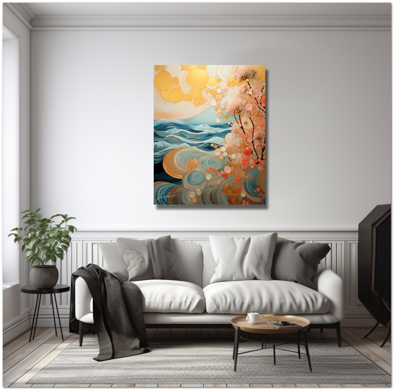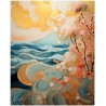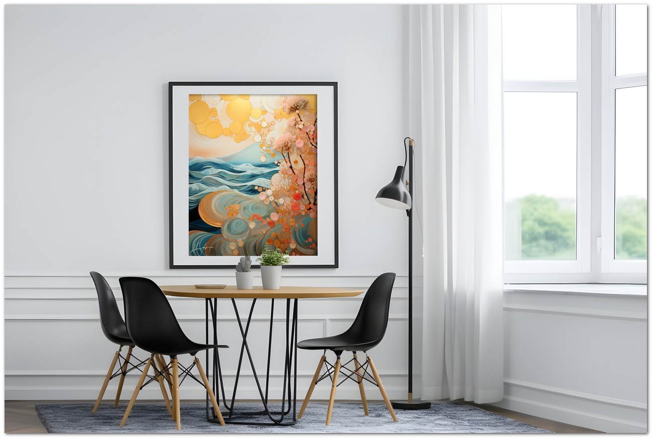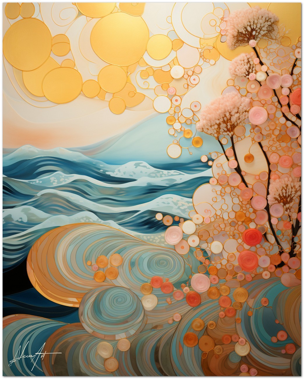 Das Werk zeigt stilisierte Wellen, die sich harmonisch entfalten, während blühende Bäume anmutig hervortreten und einen Kontrast zu schwebenden goldenen Kugeln bilden. Diese goldenen geometrischen Formen scheinen wie Blasen zu schweben und verleihen der Szene einen Hauch von Magie und Wunder. Aufgrund der detaillierten und getreuen Darstellung natürlicher Elemente kann das Werk mit dem Bildstil des Realismus in Verbindung gebracht werden. Über diese Arbeit: Klassifizierung, Techniken und Stile