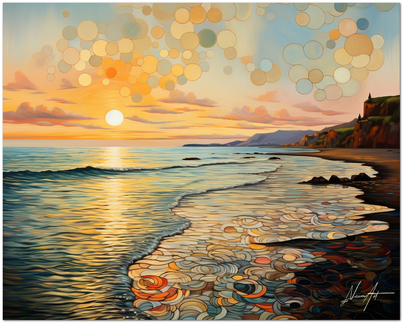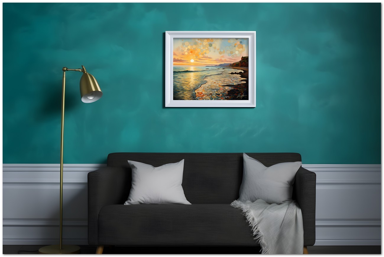Das Werk fängt einen ruhigen Moment bei Sonnenuntergang ein, in dem die Sonne ein goldenes Licht über das ruhige Meer wirft und einen leuchtenden Pfad schafft, der zum Horizont führt. Abstrakte Blasen schweben am Himmel und sorgen für ein Element der Fantasie und des Staunens. Aufgrund der detaillierten und getreuen Darstellung natürlicher Elemente kann das Werk mit dem Bildstil des Realismus in Verbindung gebracht werden. Über diese Arbeit: Klassifizierung, Techniken und Stile