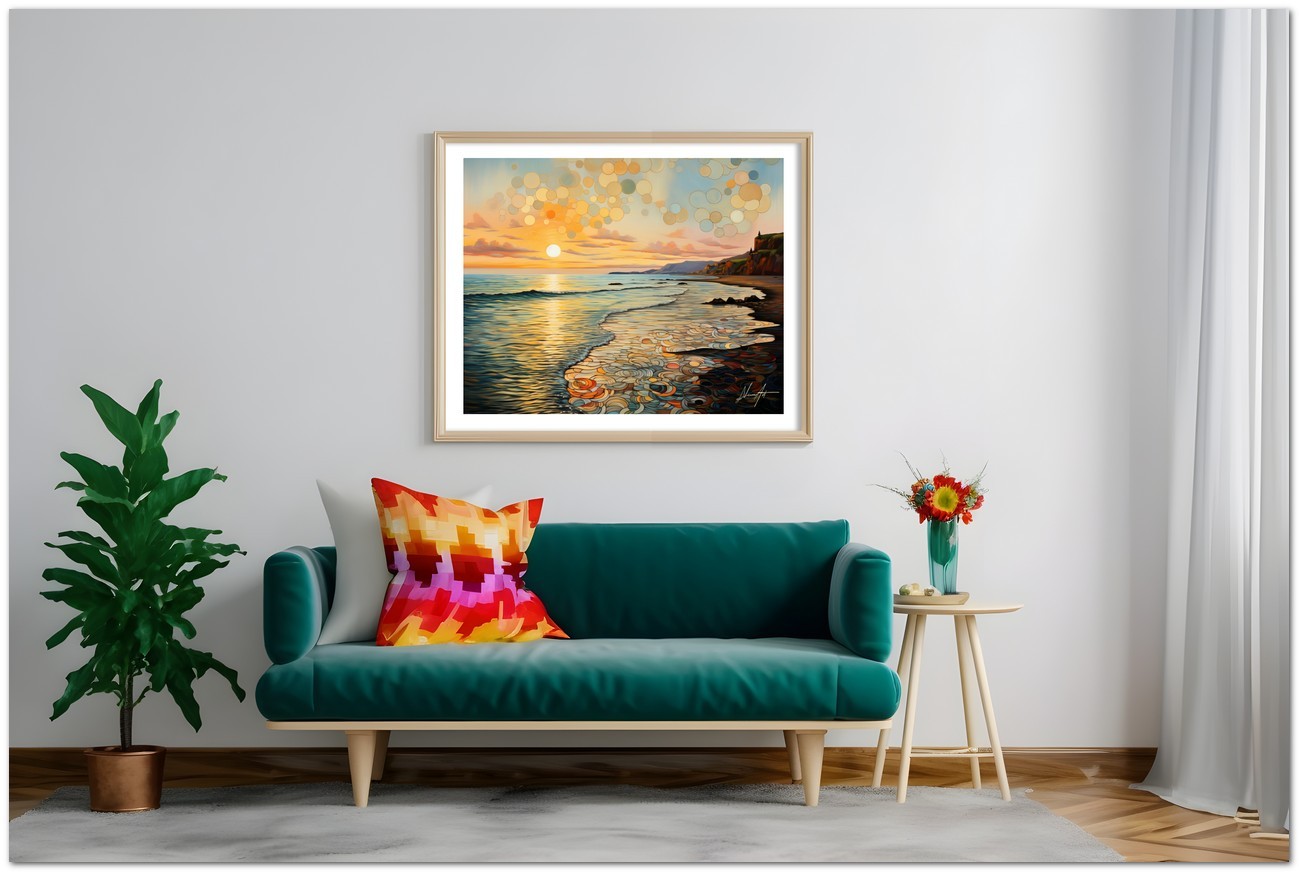 „Luci al Tramonto“ wird mit Fine Art Giclée-Drucktechnologie auf hochwertige Canvas-Leinwand reproduziert, was eine außergewöhnliche Farbwiedergabe und eine Haltbarkeit auf Museumsniveau garantiert.