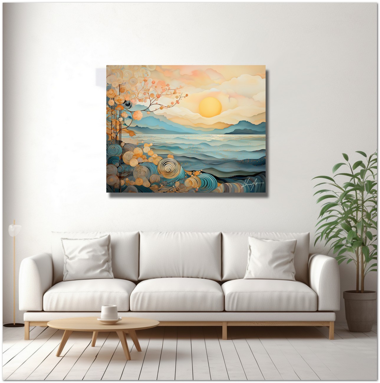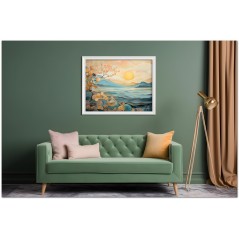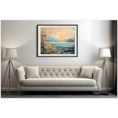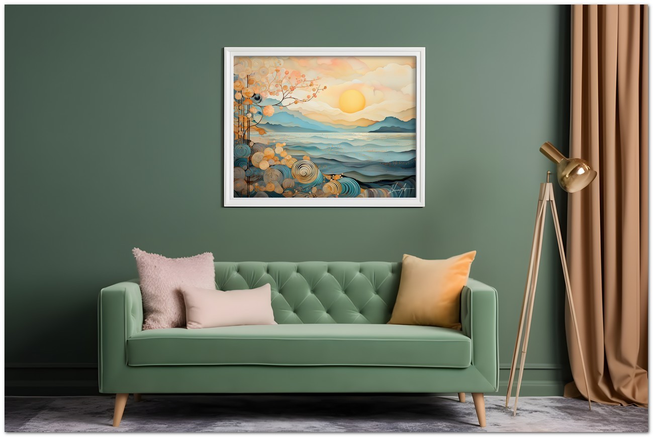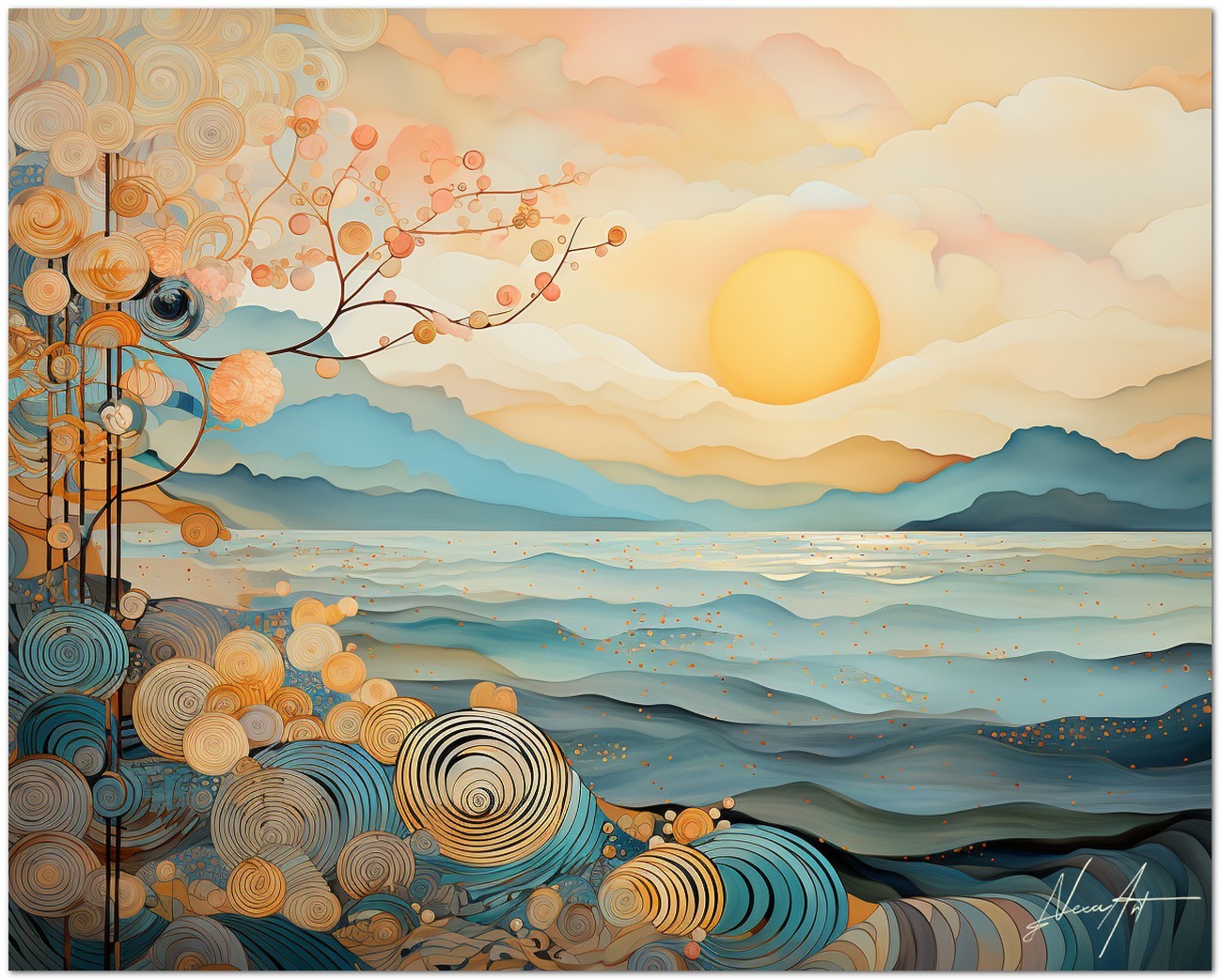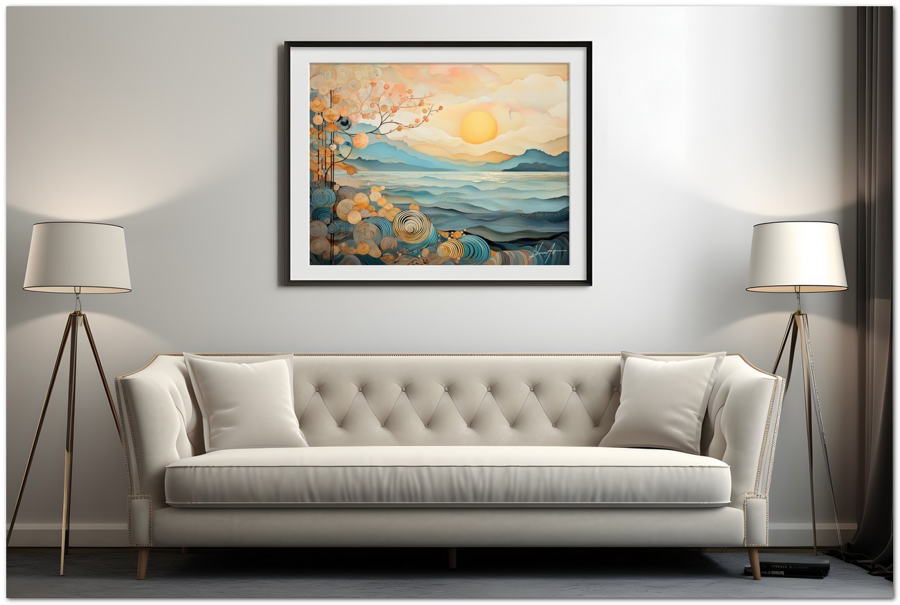 In dieser digitalen Kreation verschmilzt die Ruhe eines Sonnenaufgangs mit komplizierten Spiralmustern, die zwischen Realität und Fantasie zu schweben scheinen. Eine helle Sonne strahlt ihre Wärme über eine Küstenlandschaft, während komplizierte Muster aus Spiralen und floralen Details entstehen, als wären sie ein integraler Bestandteil der Natur selbst. Aufgrund der detaillierten und getreuen Darstellung natürlicher Elemente kann das Werk mit dem Bildstil des Realismus in Verbindung gebracht werden. Über diese Arbeit: Klassifizierung, Techniken und Stile