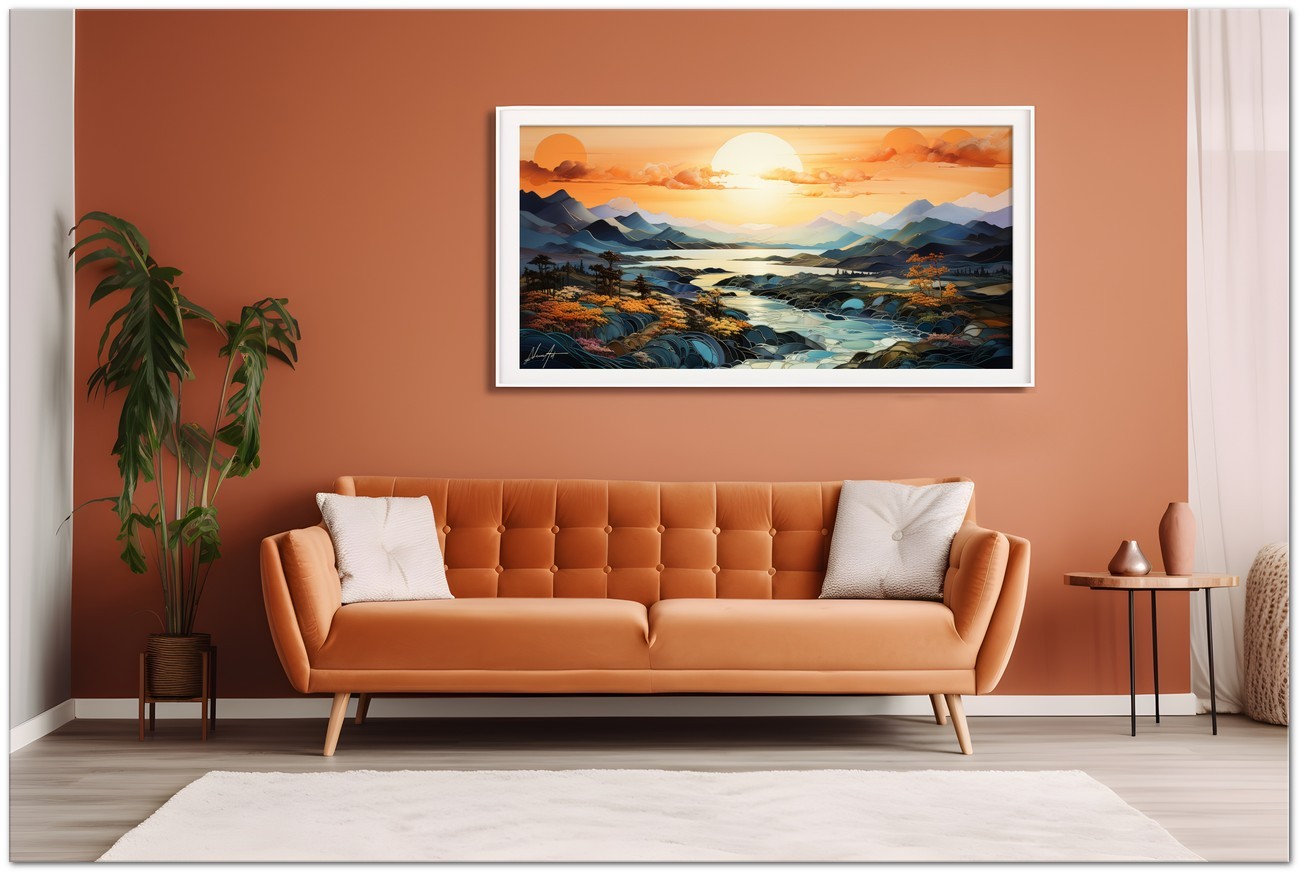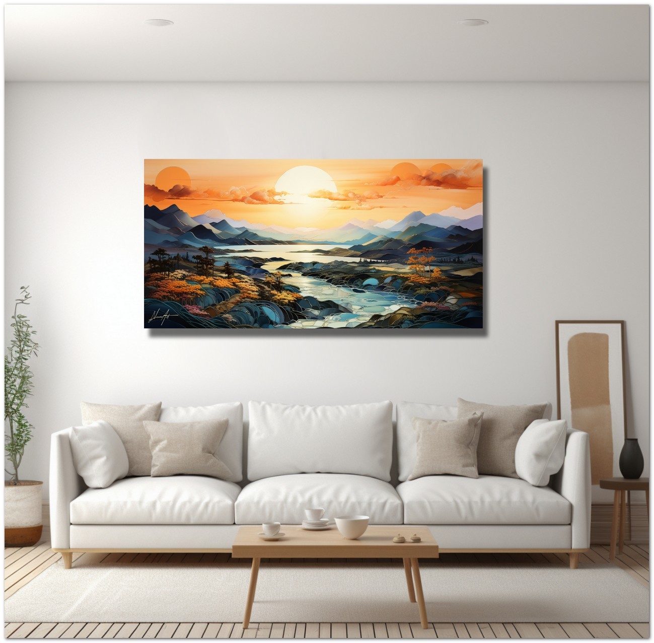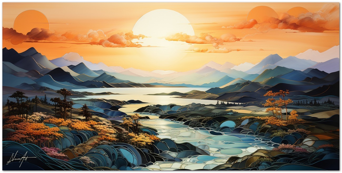 Dieses digitale Werk fängt eine Berglandschaft bei Sonnenuntergang ein, in der die warmen Farbtöne des Himmels mit den Schatten der Berge und Täler verschmelzen. Majestätische Bäume stechen in der Landschaft hervor und ihre leuchtenden Blüten bilden einen Kontrast zum dunklen Blau des hügeligen Landes. Über diese Arbeit: Klassifizierung, Techniken und Stile