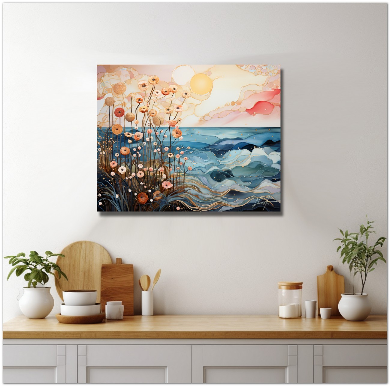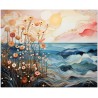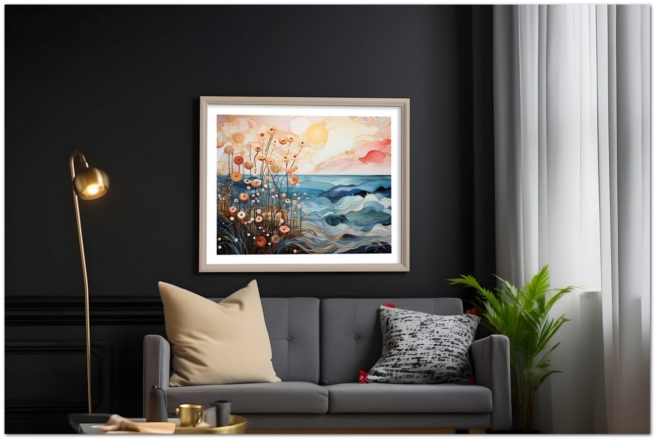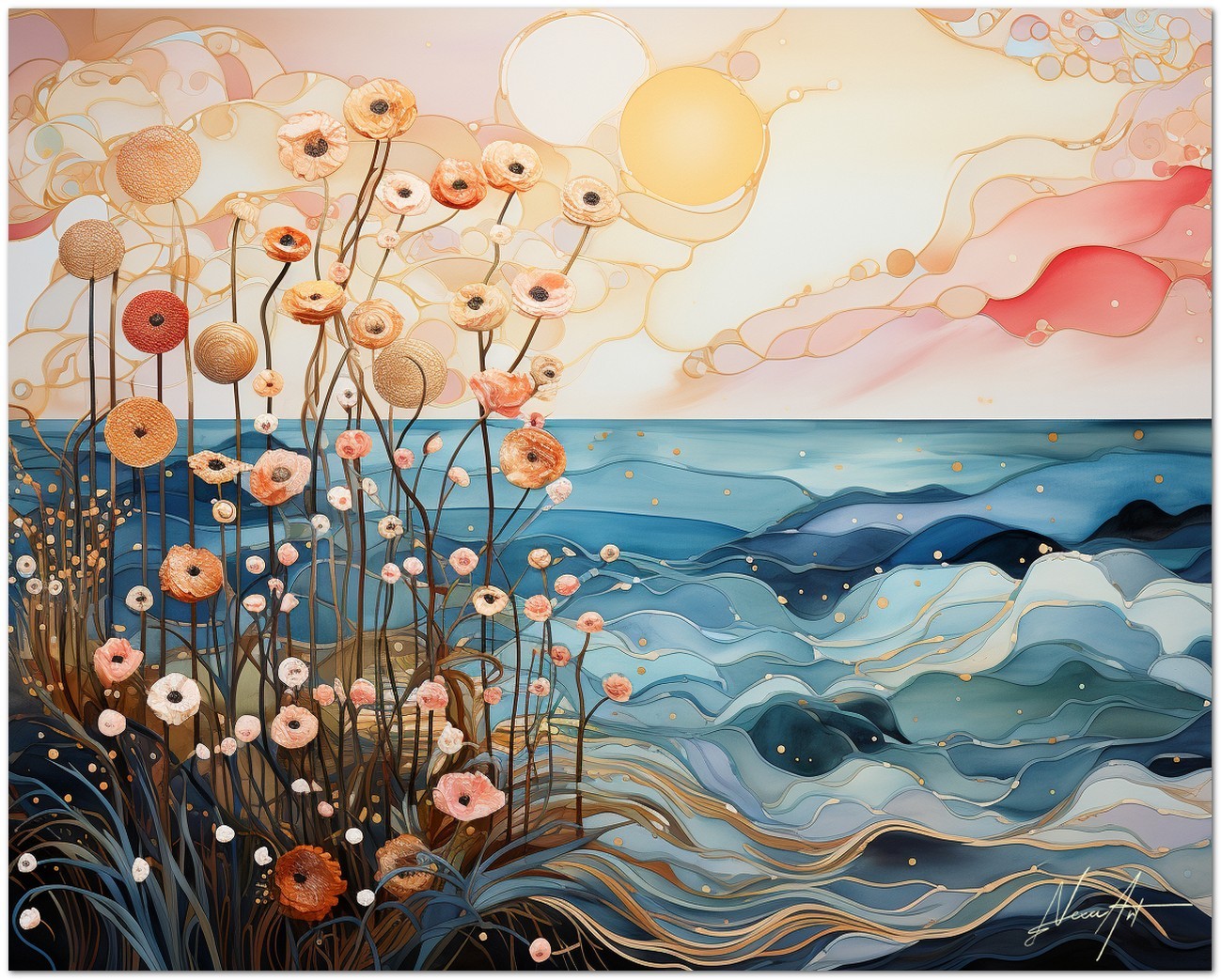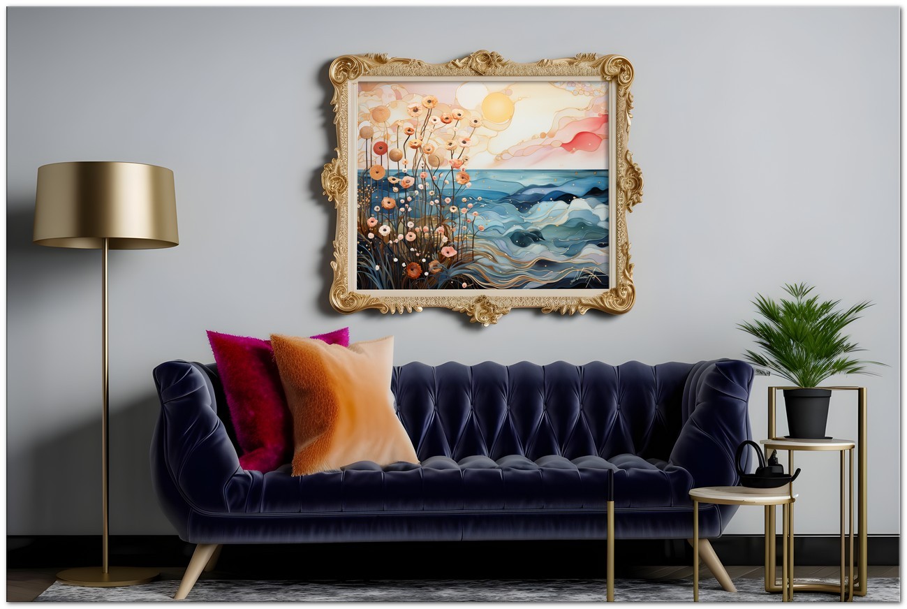 Diese digitale künstlerische Komposition stellt ein Feld stilisierter Blumen vor einer Meereslandschaft unter der sanften Wärme einer aufgehenden Sonne dar. Das Zusammenspiel zwischen zarten erdigen Blütenblättern und den lebendigen Tönen des Polarlichts erzeugt einen visuellen Tanz aus Licht und Natur. Die mit fließenden Strichen und intensiven Farben gemalten Wellen stehen im Kontrast zur Leichtigkeit und Anmut der Blumen und bieten ein Schauspiel der Gelassenheit und Wiedergeburt. Kreativer Prozess und Innovation