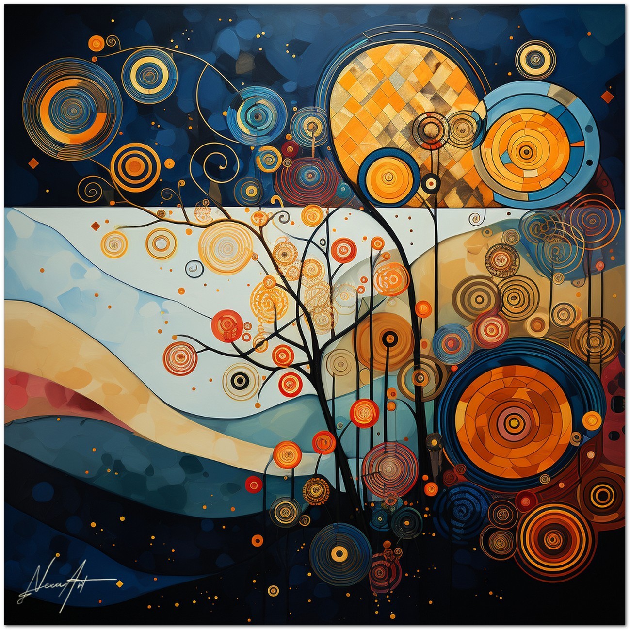 Das Werk von Eco di Forme fesselt den Betrachter mit einer Explosion kreisförmiger Formen und fließender Kurven, die in einem einnehmenden visuellen Rhythmus über die Leinwand zu tanzen scheinen. Diese Komposition, die warme und kalte Töne vermischt, erzeugt eine Dynamik aus Kontrast und Harmonie. Das Stück kann als künstlerische Interpretation visueller Musik interpretiert werden, bei der jeder Kreis eine Note und jede Zeile eine Melodie darstellt, die sich zu einer Symphonie der Formen verflechtet. Kreativer Prozess und Innovation