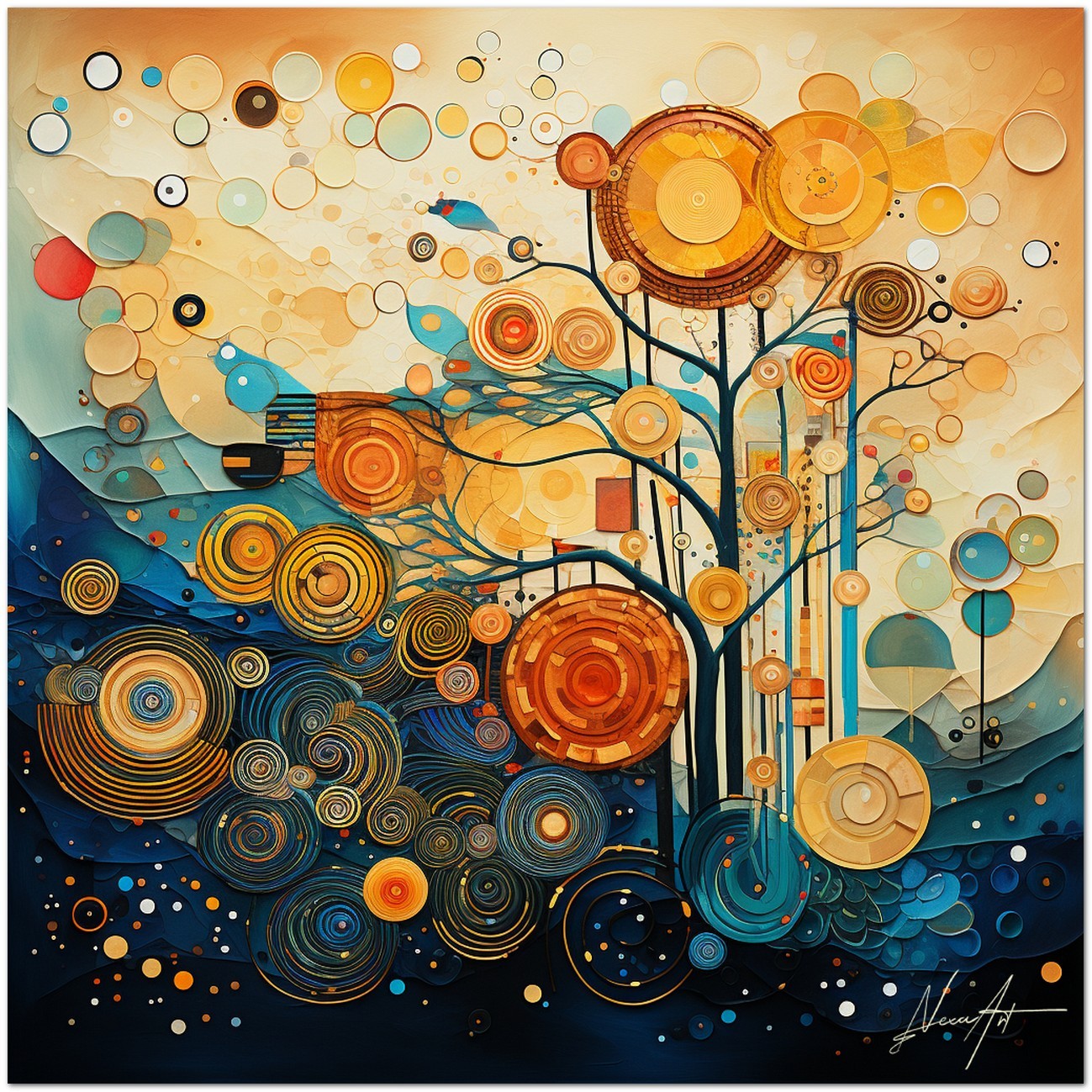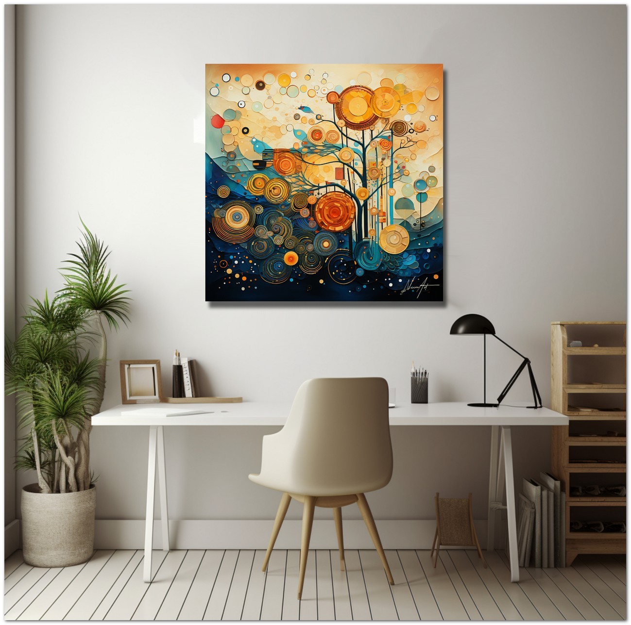 Dieses Werk von Solar Whispers zeichnet sich durch seine visuelle Dynamik aus, mit einer Fülle von Sonnenscheiben, die vor einem Hintergrund in tiefen Blau- und warmen Cremetönen schweben. Diese Spiralmotive, die sich in verschiedenen Größen und Schattierungen entfalten, rufen eine himmlische Sprache hervor. Schwarze lineare Elemente heben sich wie Silhouetten von diesem lebendigen Firmament ab und suggerieren einen Wald aus rätselhaften Symbolen in einem Lichtfeld. Der Kontrast zwischen der Wärme der sonnigen Töne und der Kühle des Marineblaus darunter schafft eine Atmosphäre der Kontemplation und des Staunens. Kreativer Prozess und Innovation