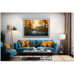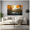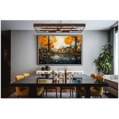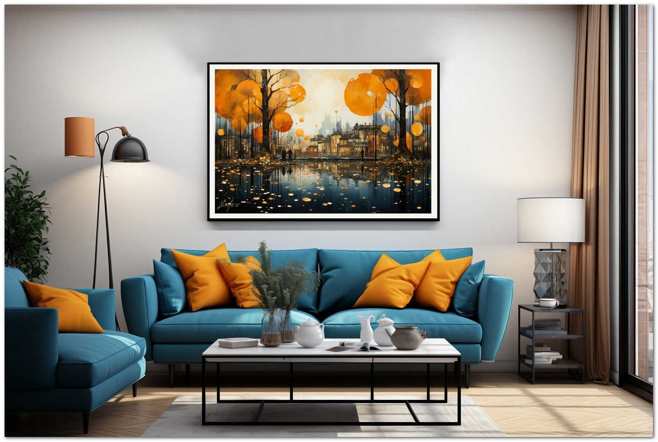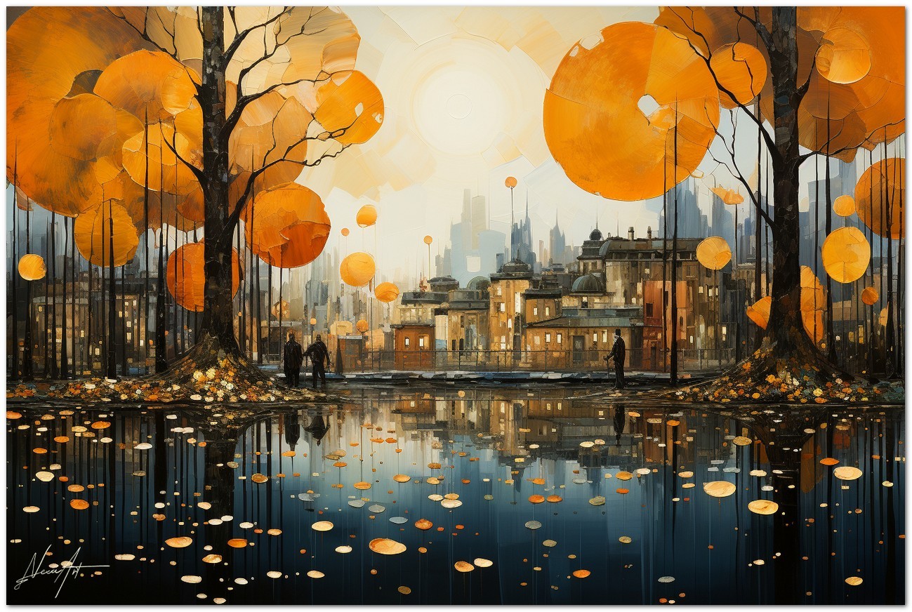 Diese künstlerische Komposition lässt den Betrachter in eine städtische Szene eintauchen, die in ein unwirkliches Licht getaucht ist und in der sich goldene Bäume vom dämmernden Himmel abheben. Die in leuchtende, schwebende Kugeln verwandelten Blätter spiegeln sich im Wasser und bilden einen leuchtenden Teppich, der Natur und Zivilisation verbindet. Kreativer Prozess und Innovation