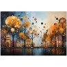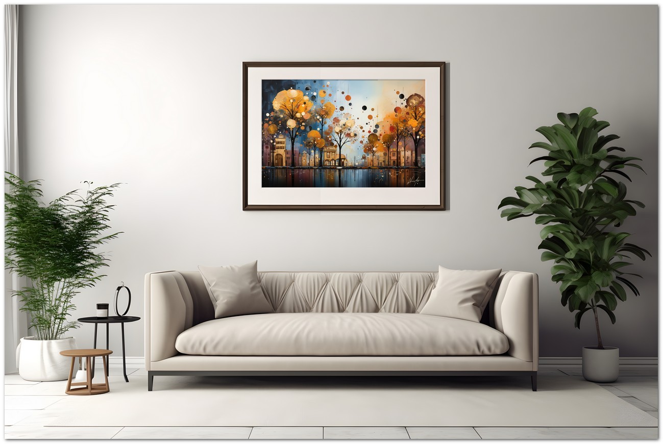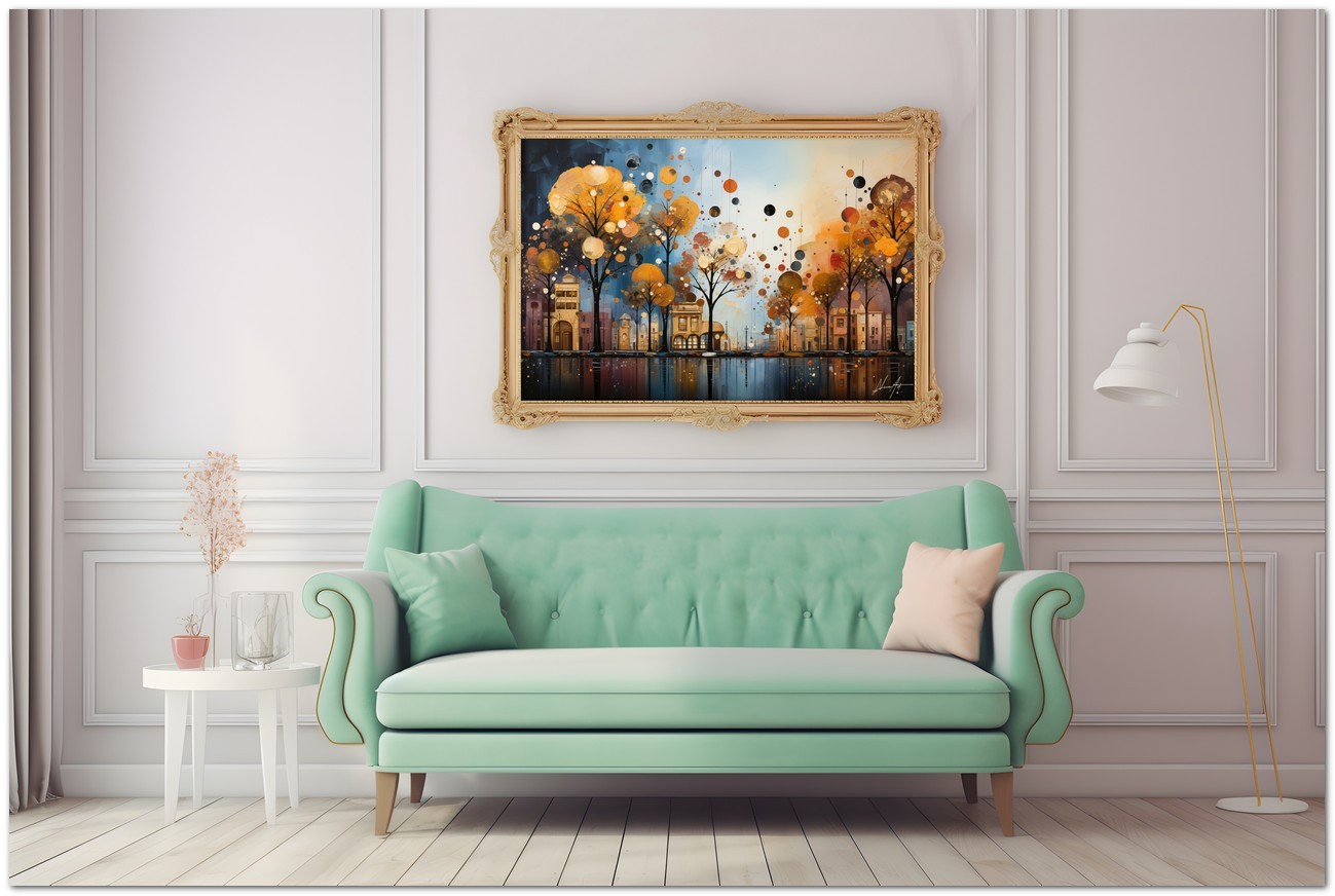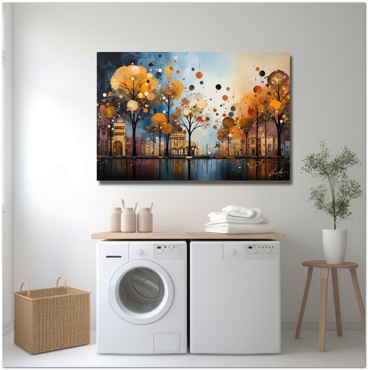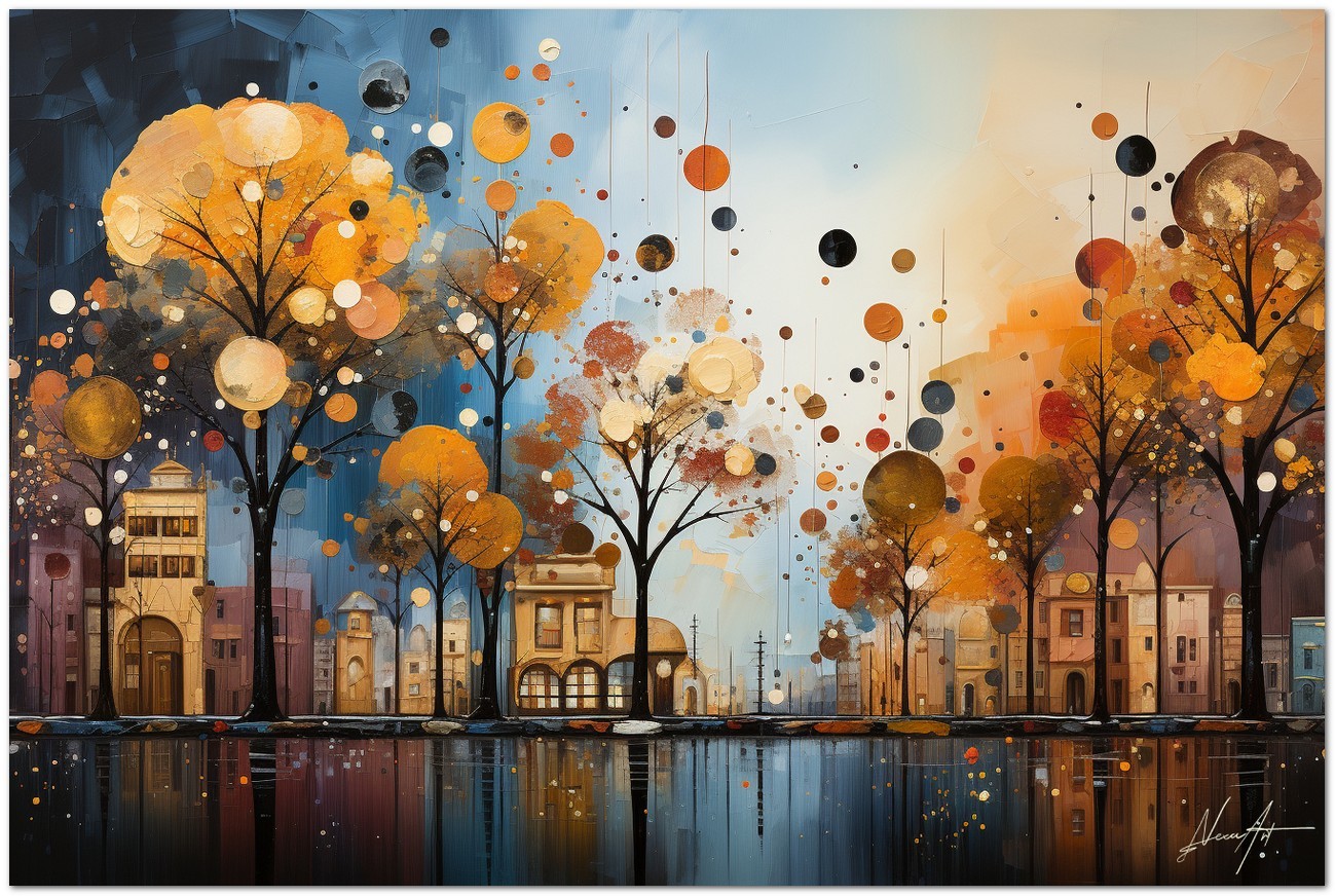In diesem Gemälde erwacht die Stadt unter der Wärme eines goldenen Lichts, das die Bäume in schimmernde Wächter des Laufs der Zeit verwandelt. Die von ihren Baldachinen fallenden Kugeln erzeugen die Illusion von Sternschnuppen oder Blättern, die sich in Lichtmomente verwandeln. Kreativer Prozess und Innovation