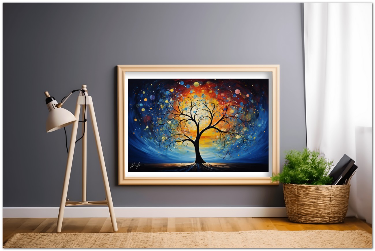 Diese digitale Kreation „The Universe has Roots“ zeigt einen majestätischen Baum im Zentrum einer traumhaften Landschaft, in der das Zusammenspiel von Licht und Dunkelheit durch eine Vielzahl farbiger Kugeln dargestellt wird, die wie Seifenblasen in der Luft zu schweben scheinen. Die Farbtöne von warmem Orange bis hin zu kaltem Nachtblau erzeugen einen visuellen Kontrast, der den Übergang vom Tag zur Nacht symbolisiert. Die Wurzeln des Baumes reichen tief in die Dunkelheit und suggerieren eine Verbindung zum Unbekannten, während seine Äste gen Himmel ragen und die Lichter wie Sternschnuppen willkommen heißen. Kreativer Prozess und Innovation