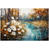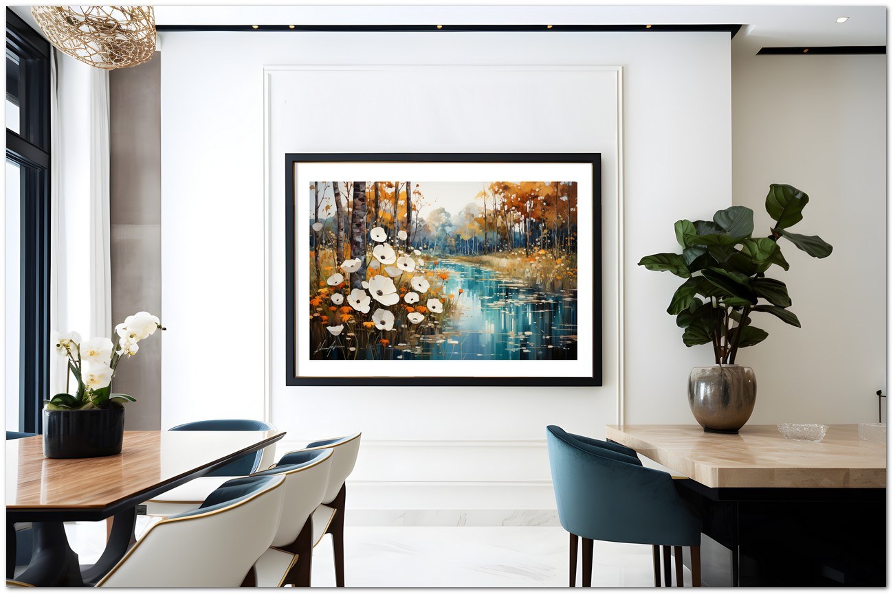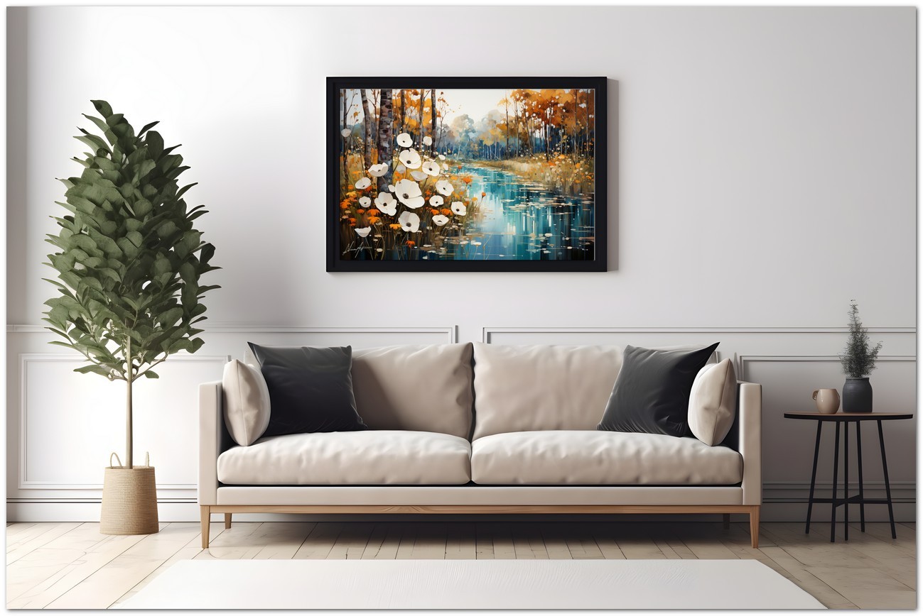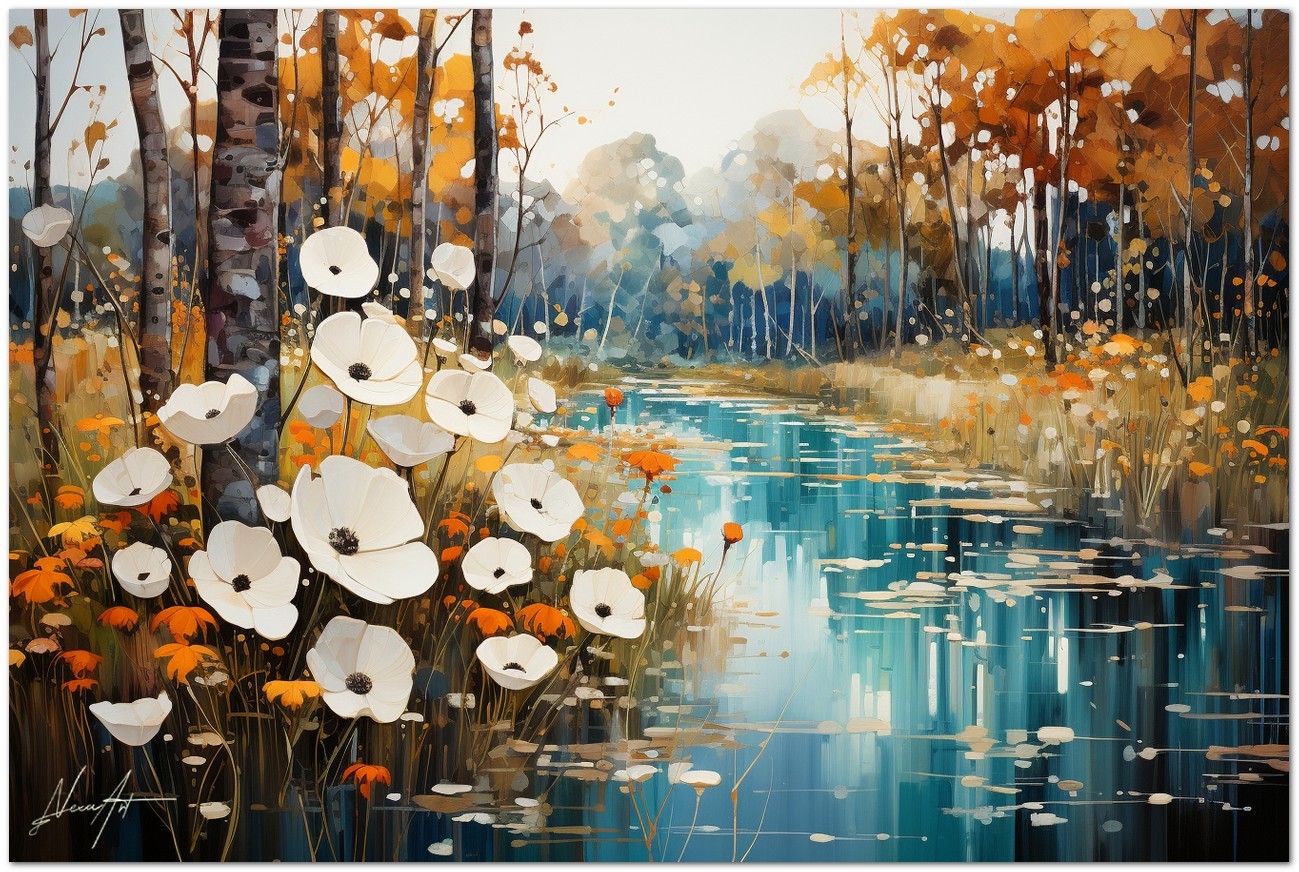 Das digitale Werk „Aquatic Whispers“ malt die friedliche Atmosphäre eines Hains, in dem Lotusblumen auf dem ruhigen Wasser schwimmen und ein fast mystisches Spiegelbild erzeugen. Der Kontrast der weißen Blütenkrone vor dem leuchtenden Hintergrund aus Orange- und Blautönen erinnert an den friedlichen Übergang vom Herbst zum Winter. Das Spiel von Licht und Farbe erweckt die Landschaft zum Leben, während die zarte Platzierung der Blumen an einen in der Zeit schwebenden Tanz erinnert. Kreativer Prozess und Innovation