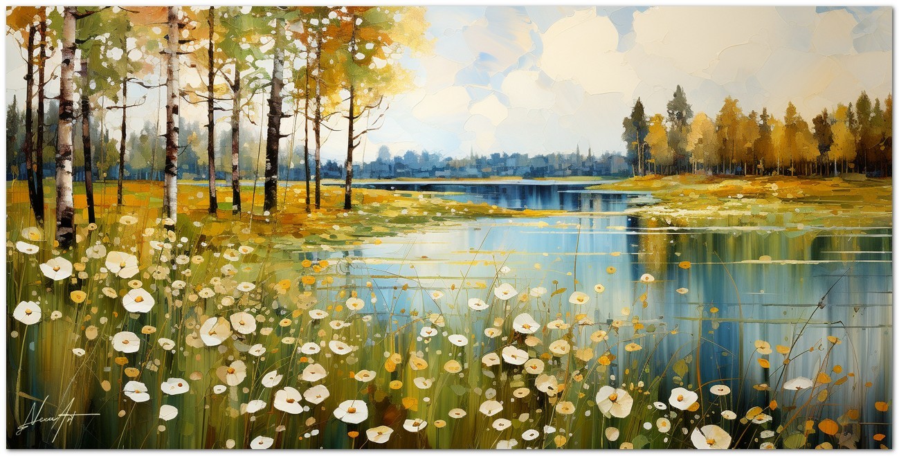 Dieses digitale Werk von Autumn Murmur fängt die Quintessenz einer idyllischen Herbstlandschaft ein. Das Feld der Lotusblumen mit ihren weißen Blütenblättern ragt kraftvoll aus dem ruhigen See hervor, während die Bäume sanft in eine Palette von Gelb- und Ockertönen übergehen und einen lebhaften Kontrast zum ruhigen Blau des Himmels bilden. Die Komposition ruft ein Gefühl der Stille und Kontemplation hervor und lädt den Betrachter zu einem nachdenklichen Spaziergang zwischen den Spiegelungen des Wassers und dem Teppich aus gefallenen Blättern ein. Kreativer Prozess und Innovation