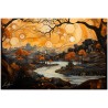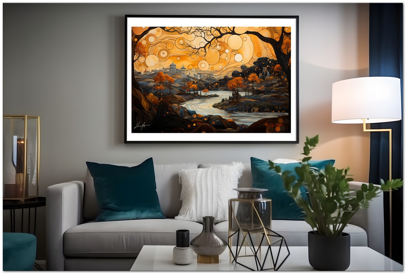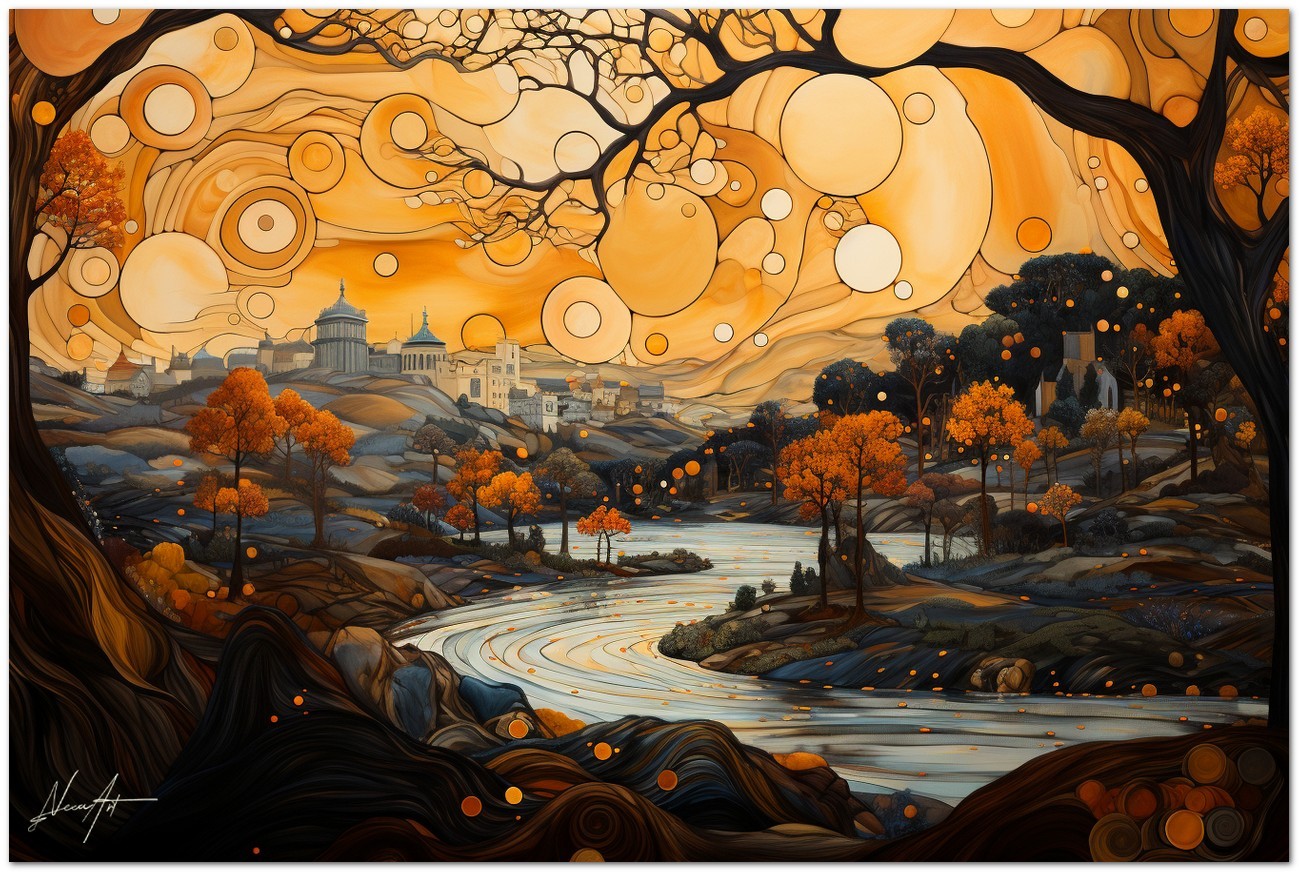 Die Arbeit Sunset on Enchanted Hills ist eine künstlerische Vision eines umhüllenden Sonnenuntergangs über einer idyllischen Landschaft. Der verwendete Stil ist vom Jugendstil mit einem Hauch digitaler Moderne inspiriert und zeichnet sich durch fließende Linien und organische Formen aus, die mit geometrischer Präzision ineinander greifen. Bäume in warmen Herbstfarben stehen vor einem Himmel, der durch ein Mosaik aus leuchtenden Kugeln und Ringen lebendig wird und der Szene eine magische und verträumte Atmosphäre verleiht. Kreativer Prozess und Innovation