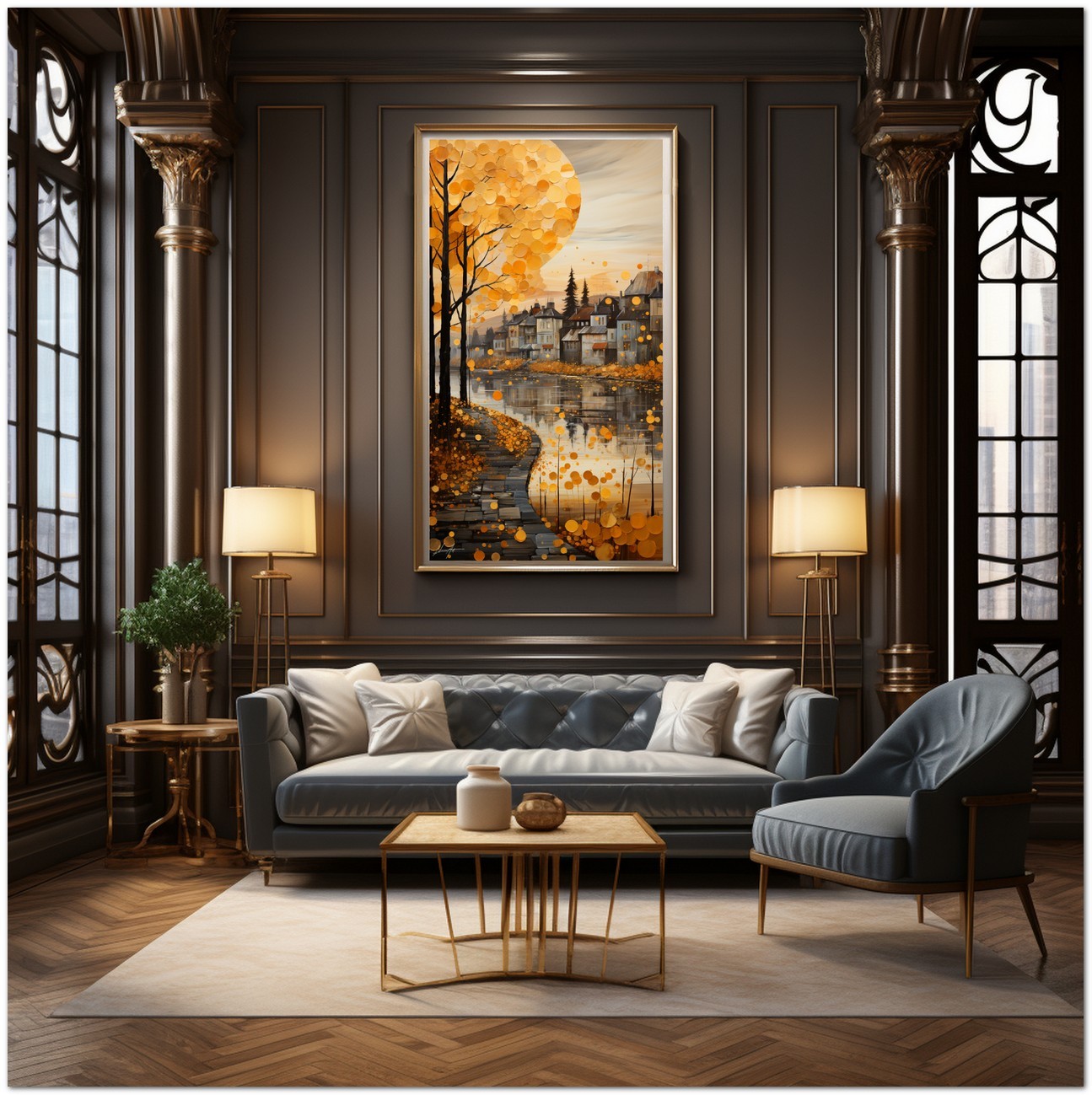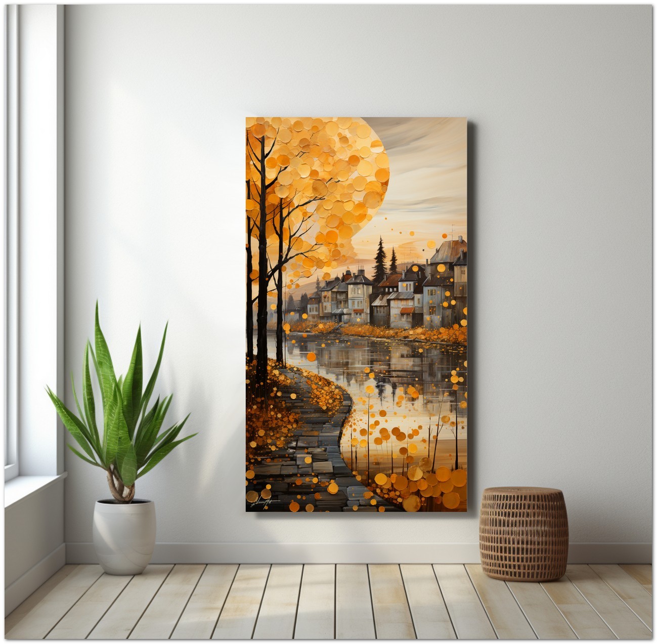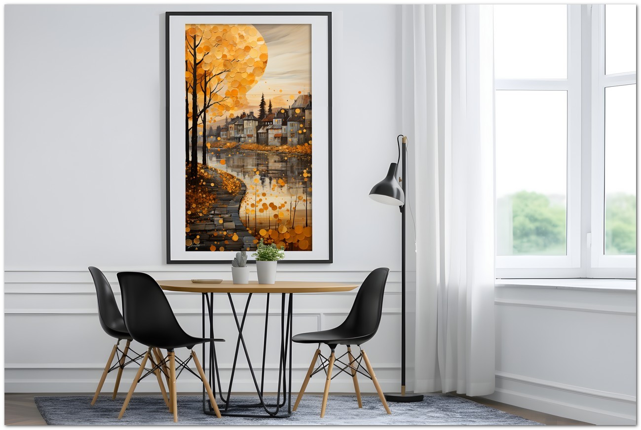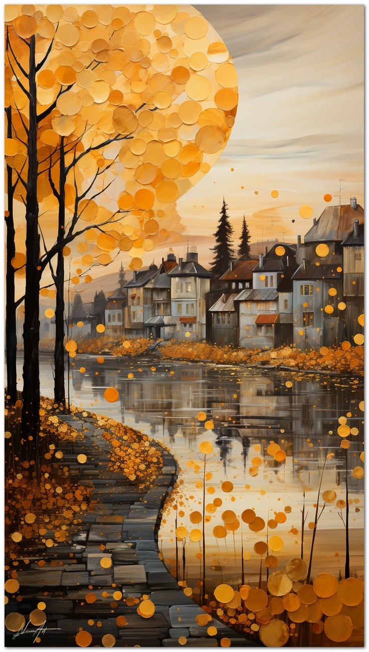 „Fantasy and Landscape“ ist ein digitales Werk, das den Zauber einer imaginären Herbstlandschaft hervorruft, die reich an verschiedenen und faszinierenden Elementen ist. Auf der linken Seite steht ein majestätischer Baum, der die Aufmerksamkeit des Betrachters auf sich zieht, während mehrere malerische Häuser die Flussufer schmücken. Der Himmel wird von einer großen weißen Kugel dominiert, die einer aufgehenden Sonne ähnelt, was der Komposition einen Hauch von Kreativität und Surrealismus verleiht. Details zum Werk „Fantasie und Landschaft“: Klassifizierung, Techniken und Stile