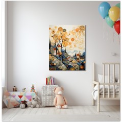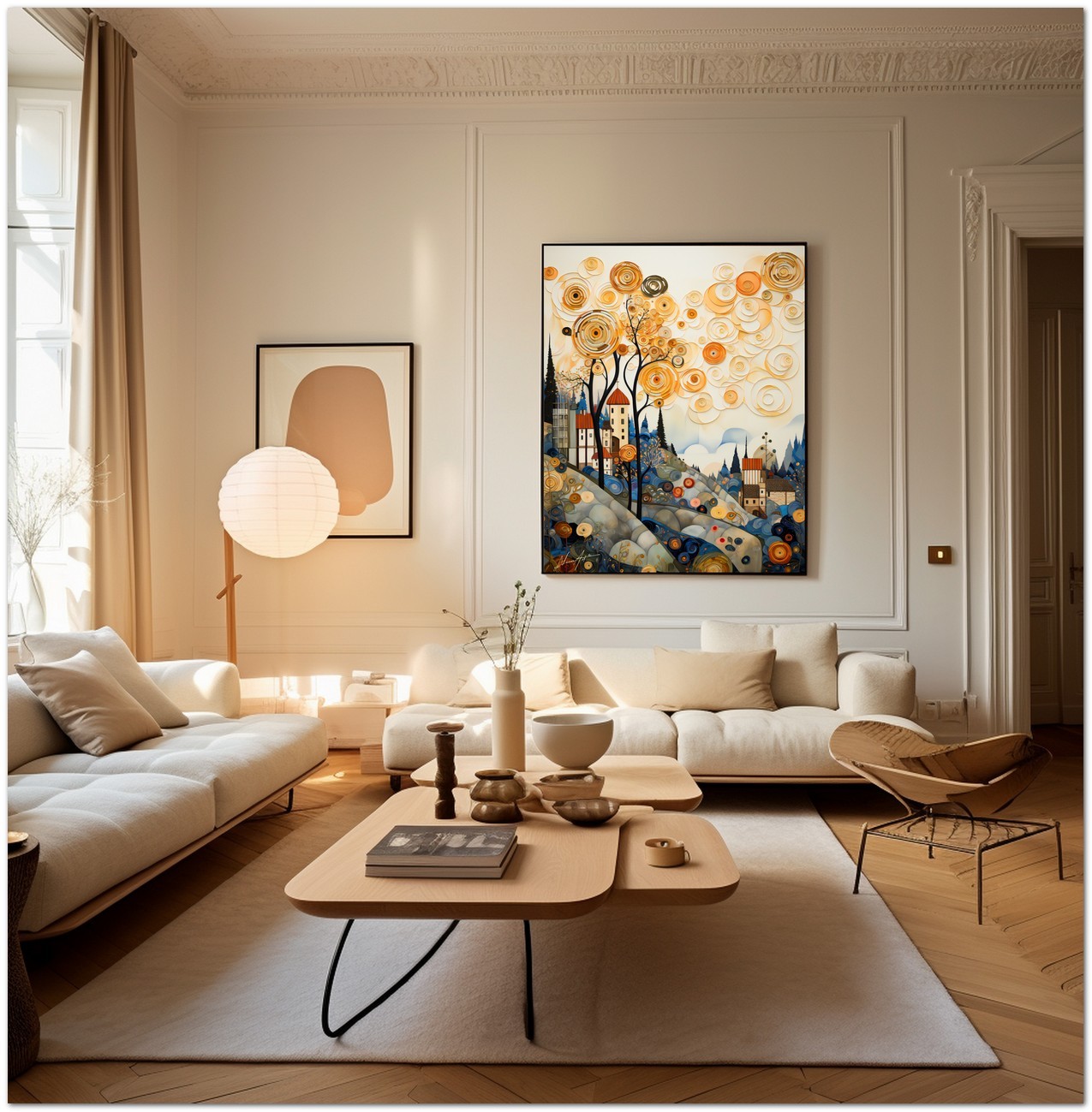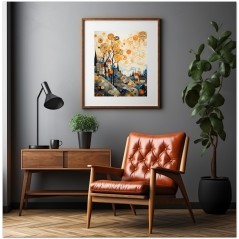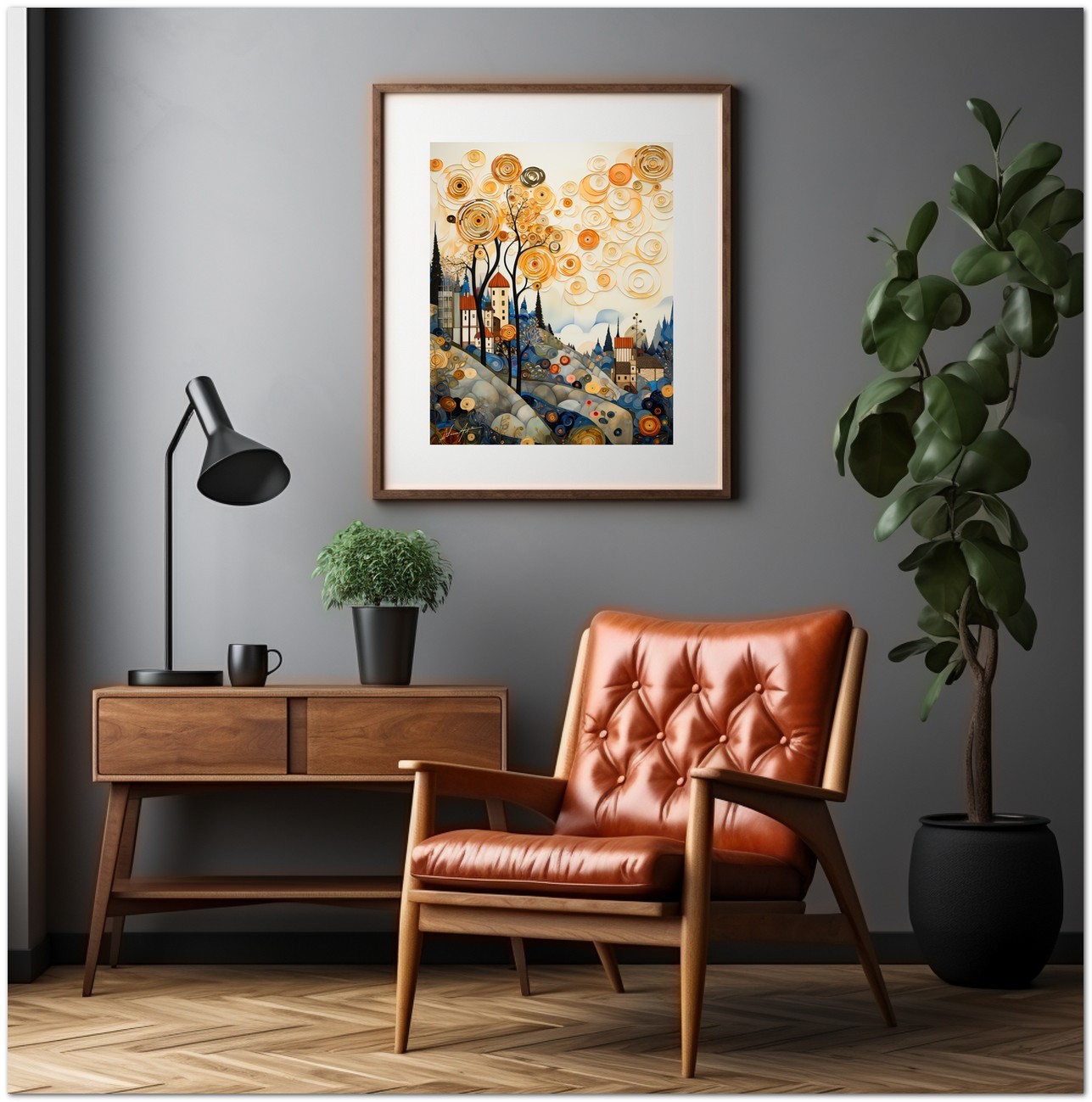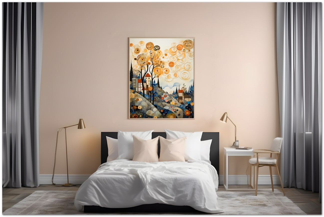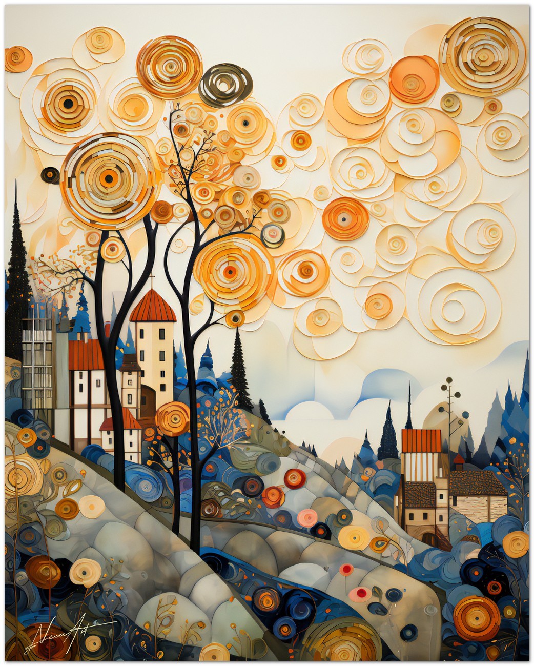 „Village at Night“ ist ein digitales Kunstwerk, das eine friedliche Nachtszene zeigt. Das Bild spielt in einem friedlichen Dorf, umgeben von Bäumen und beleuchtet von einem Sternenhimmel. Die als gelbe Spiralen dargestellten Sterne vermitteln ein Gefühl von Dynamik und Helligkeit und beleuchten die Häuser und Bäume mit einem bezaubernden Licht. Details zum Werk „Villaggio di Notte“: Klassifizierung, Techniken und Stile
