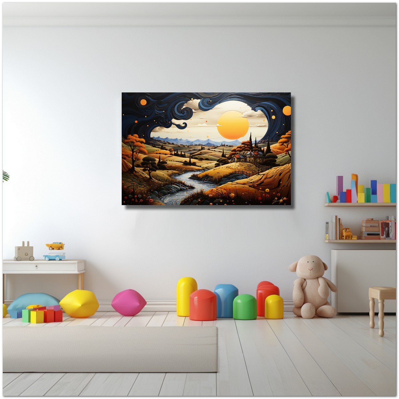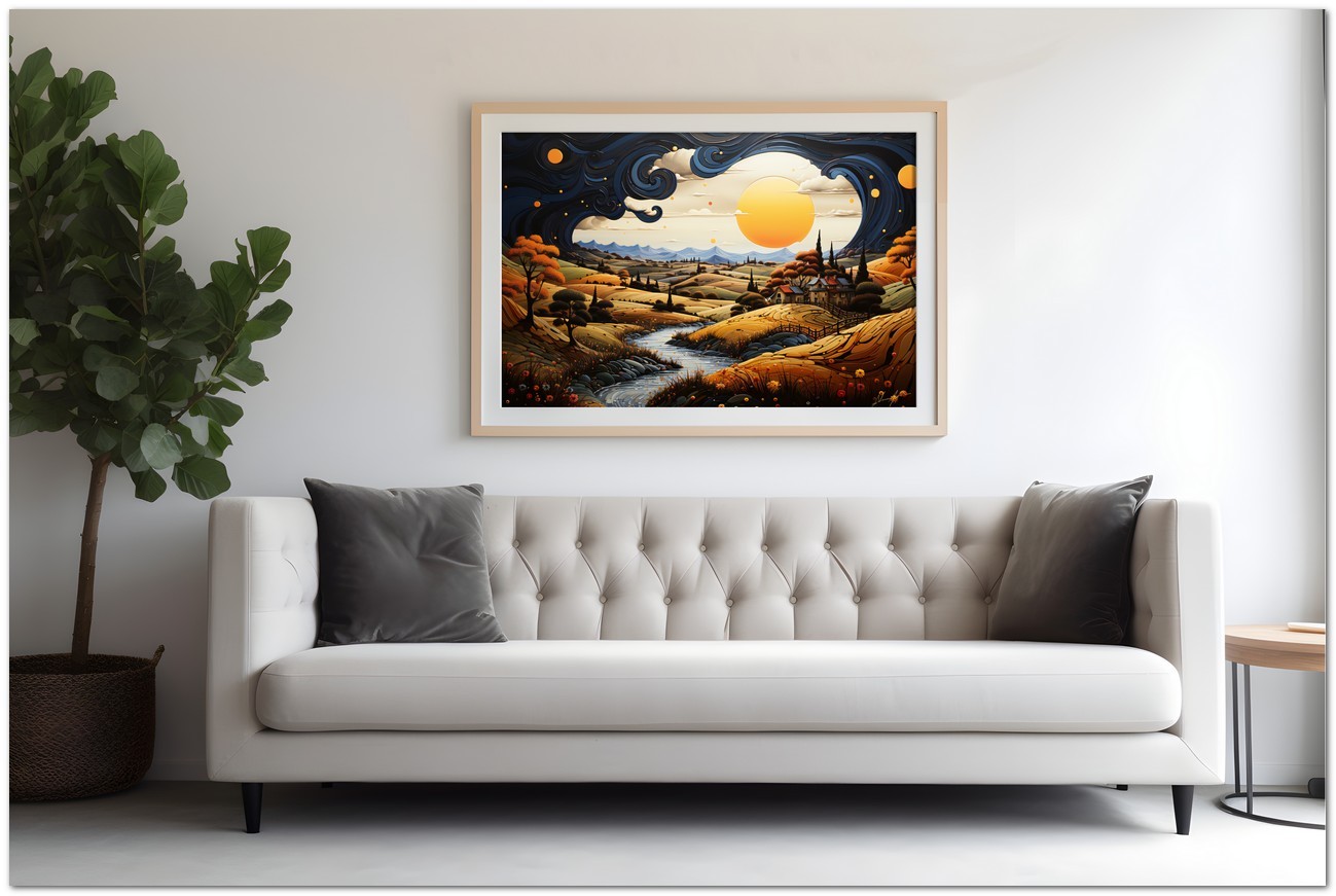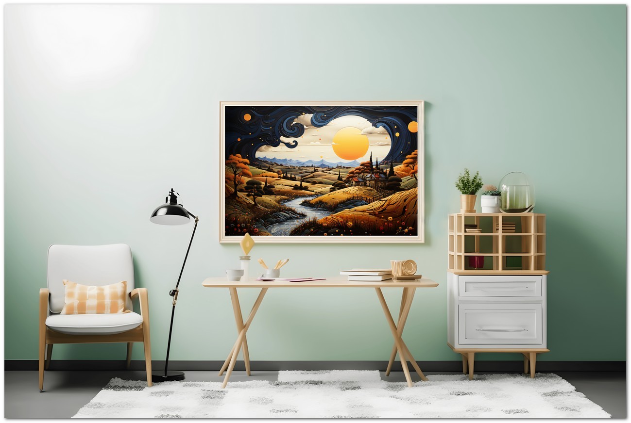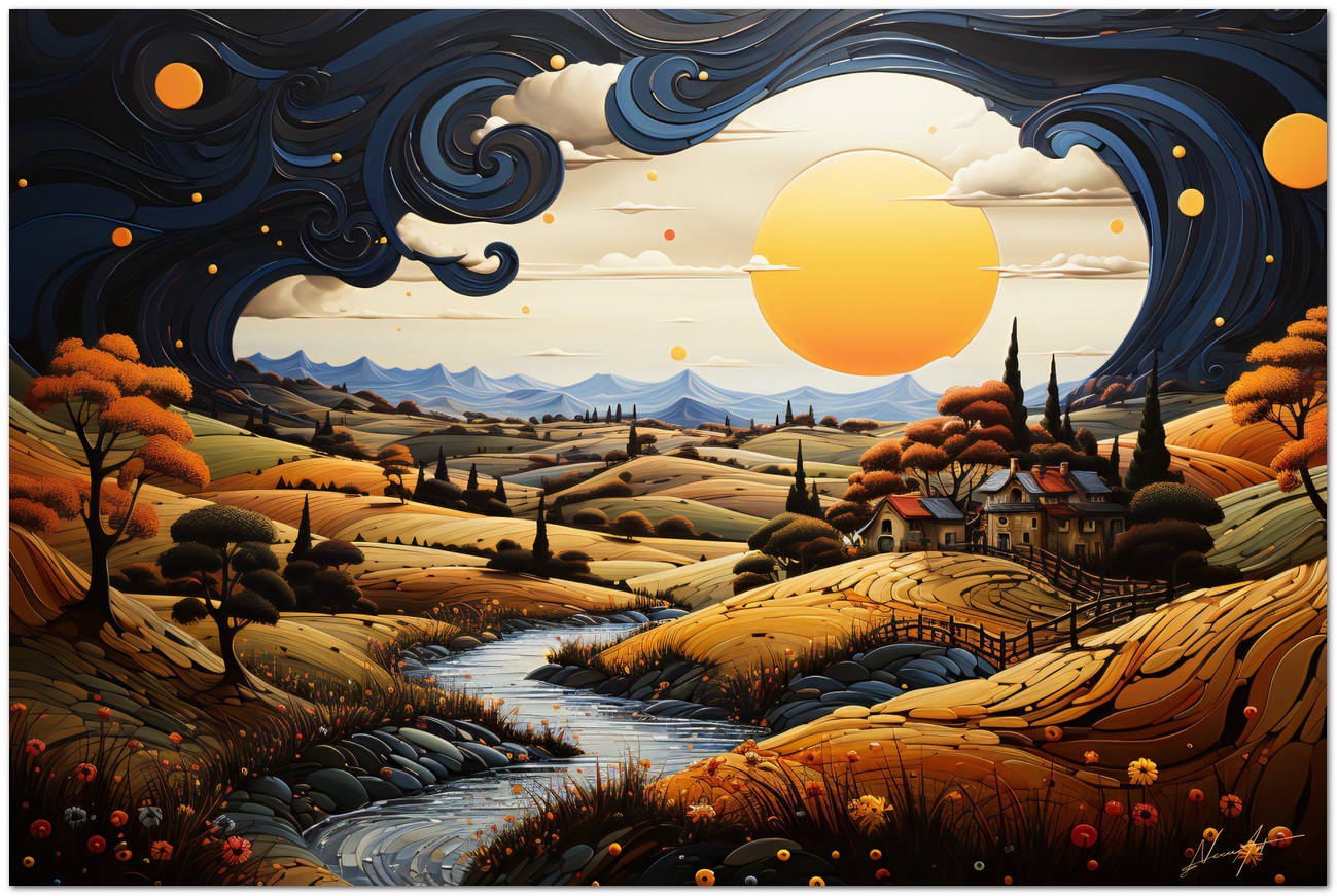 „Celestial Luminosity“ ist ein digitales Gemälde, das den Betrachter in eine ruhige und atemberaubende Landschaft entführt. Dieses Werk zeigt einen sich schlängelnden Fluss, der durch eine malerische Herbstkulisse fließt, mit Bäumen, die in feurigen Farbtönen geschmückt sind. Die Komposition wird zusätzlich durch Sterne am Nachthimmel bereichert, die der Szene eine magische, himmlische Qualität verleihen. In der Mitte des Gemäldes scheint die Sonne hell und bildet einen markanten Kontrast zur umgebenden Nacht. Merkmale des Werkes „Celestial Luminosity“: Klassifizierung, Techniken und Stile