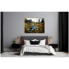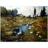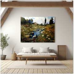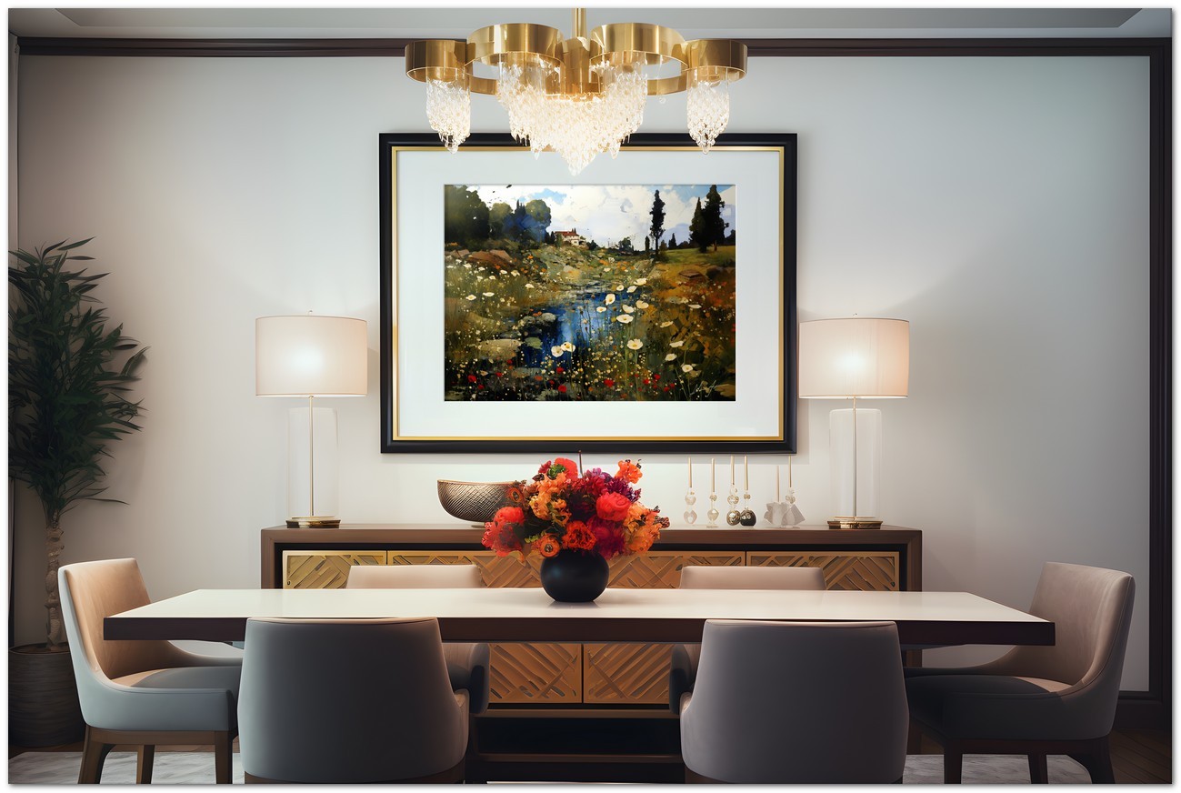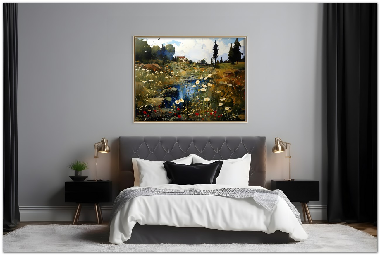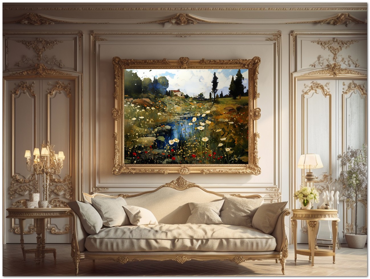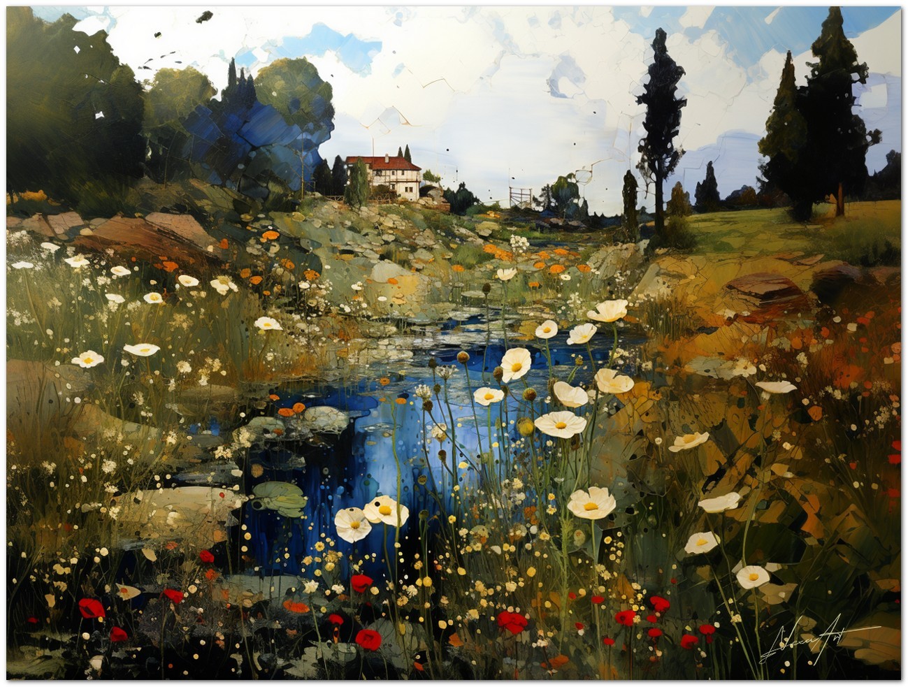 „Armonia Bucolica“ entführt uns in eine friedliche Landschaft, in der die Natur ihre unberührte Schönheit zeigt. Die Komposition besteht aus einem üppigen Feld mit bunten Blumen und einem sich schlängelnden Bach. Ein malerischer, mit Pflanzen und Felsen geschmückter Teich nimmt eine zentrale Position im Werk ein und trägt dazu bei, eine Atmosphäre des Friedens und der Gelassenheit zu schaffen. Im Hintergrund schmiegt sich ein gemütliches Haus zwischen die Bäume, während majestätische Bäume aus dem Feld ragen und einen natürlichen Hintergrund für die idyllische Landschaft bilden. Details zum Werk „Armonia Bucolica“: Klassifizierung, Techniken und Stile