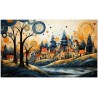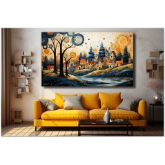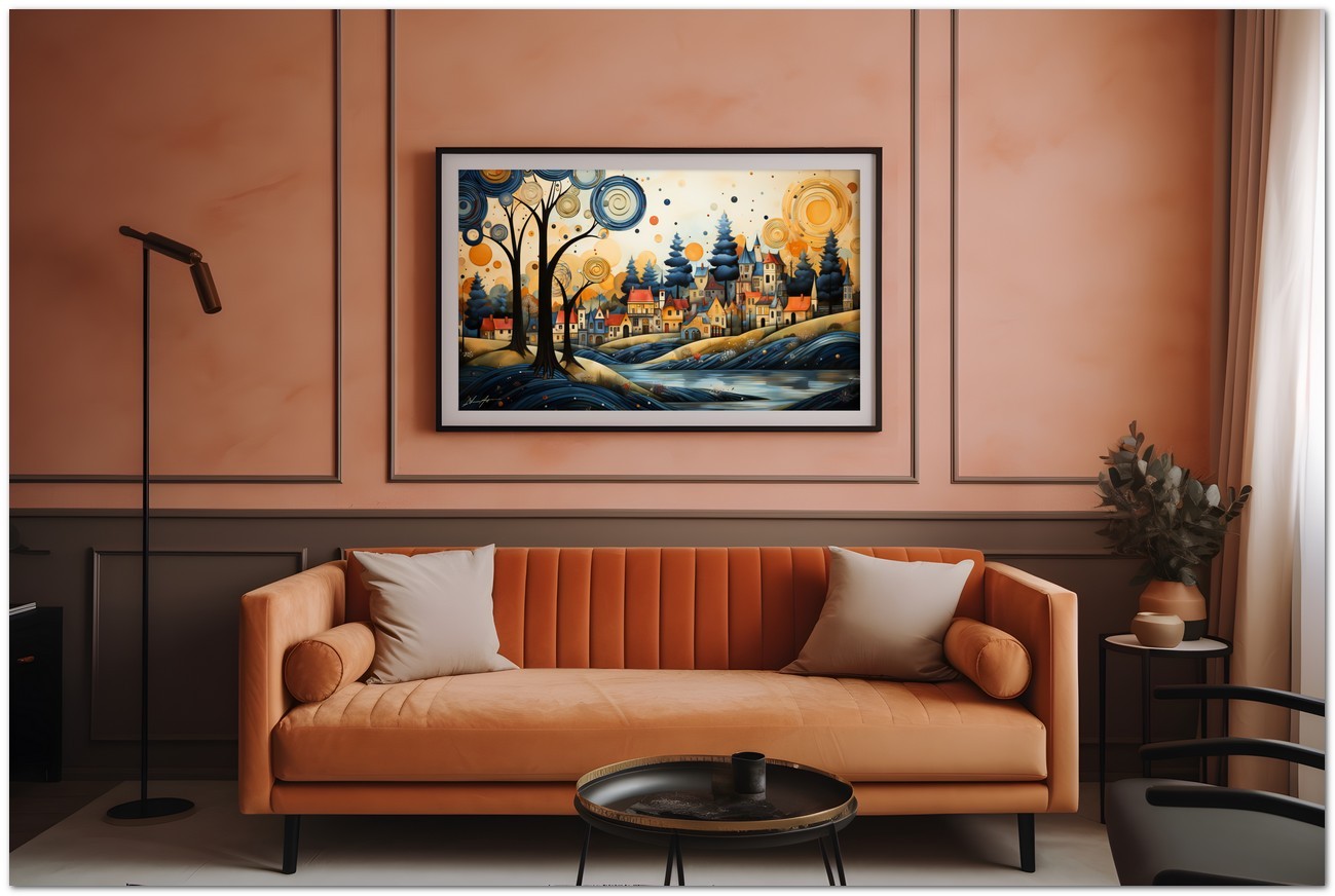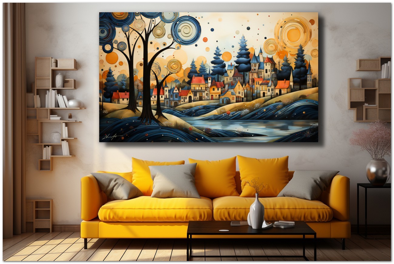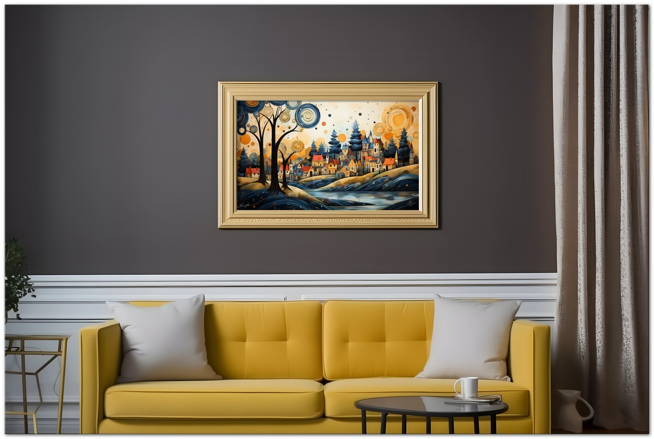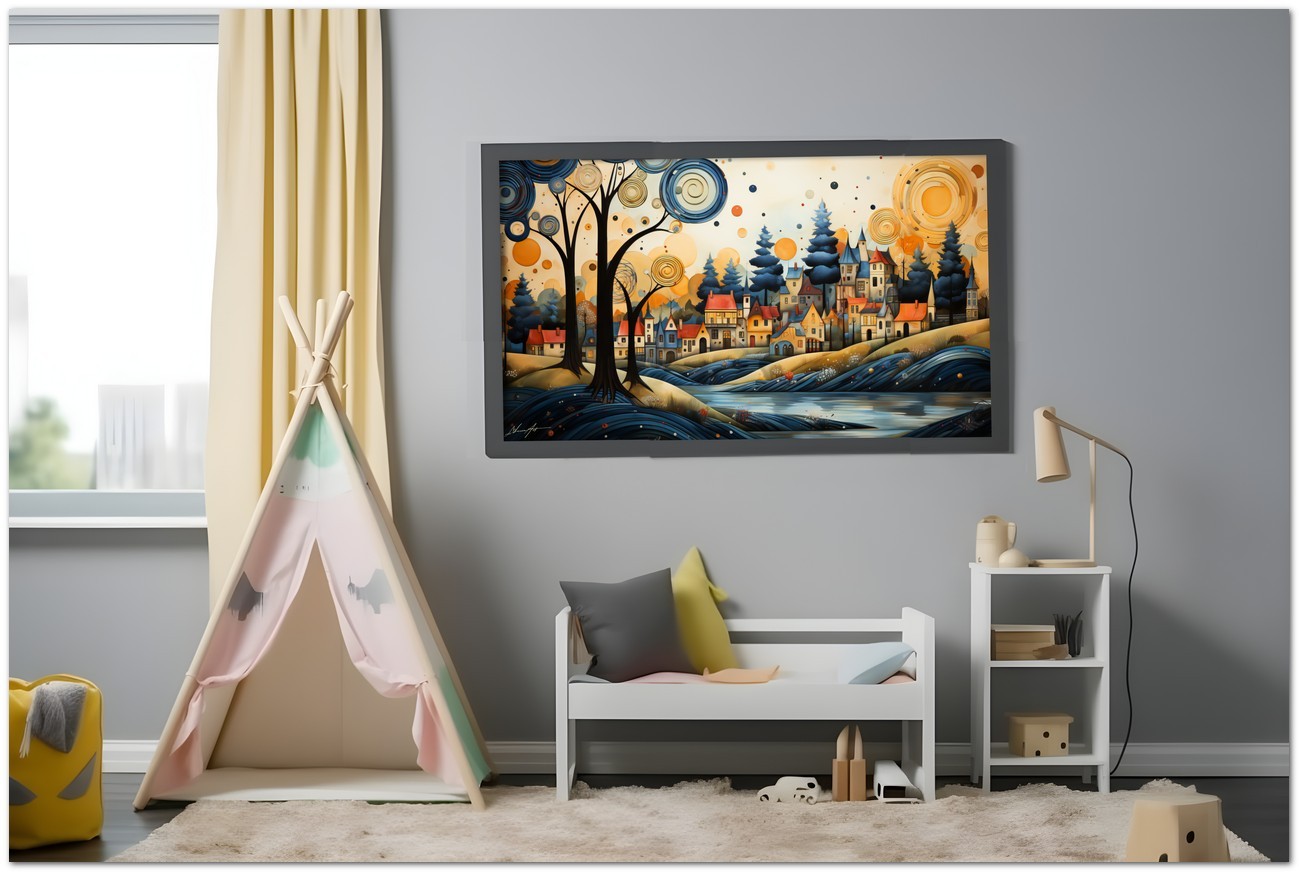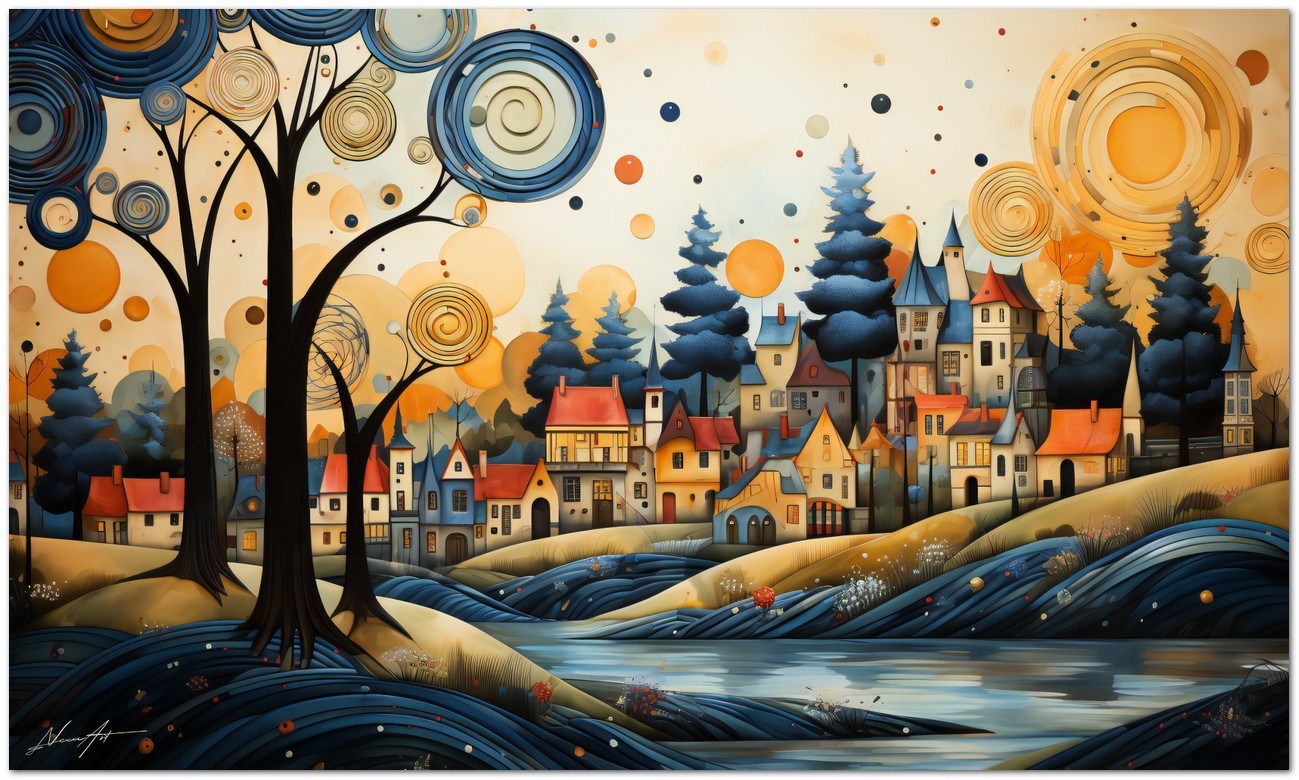 „The Village and the River“ ist ein digitales Werk, das ein charmantes Dorf am Ufer eines Flusses porträtiert, mit farbenfrohen Häusern und einladenden Dächern, die ein Gefühl von Gemeinschaft und Wärme hervorrufen. Ein majestätischer Baum im Vordergrund symbolisiert die Natur und verleiht der Komposition eine Dimension von Tiefe und Leben. Details zum Werk „Das Dorf und der Fluss“: Klassifizierung, Techniken und Stile