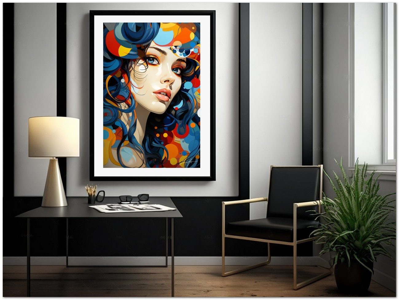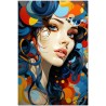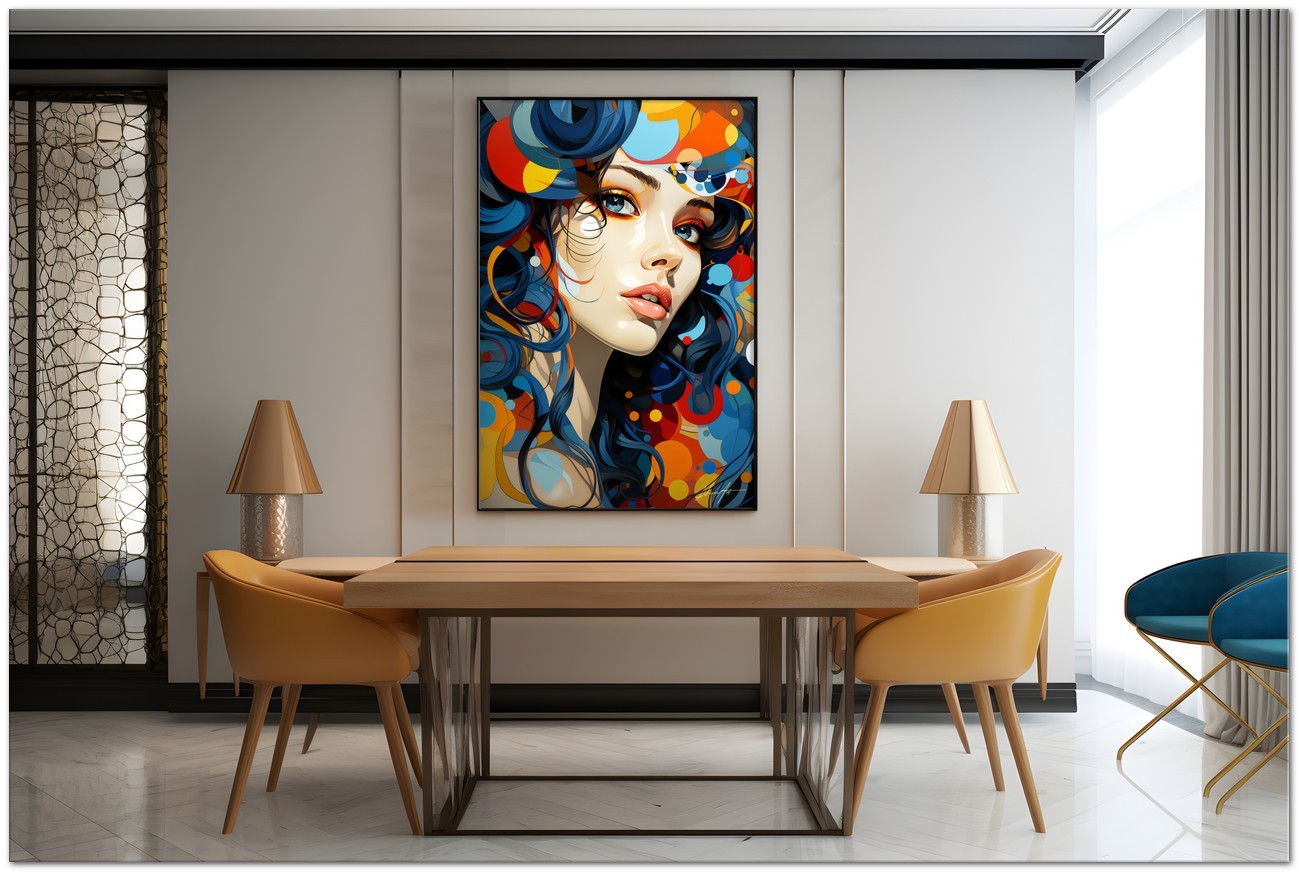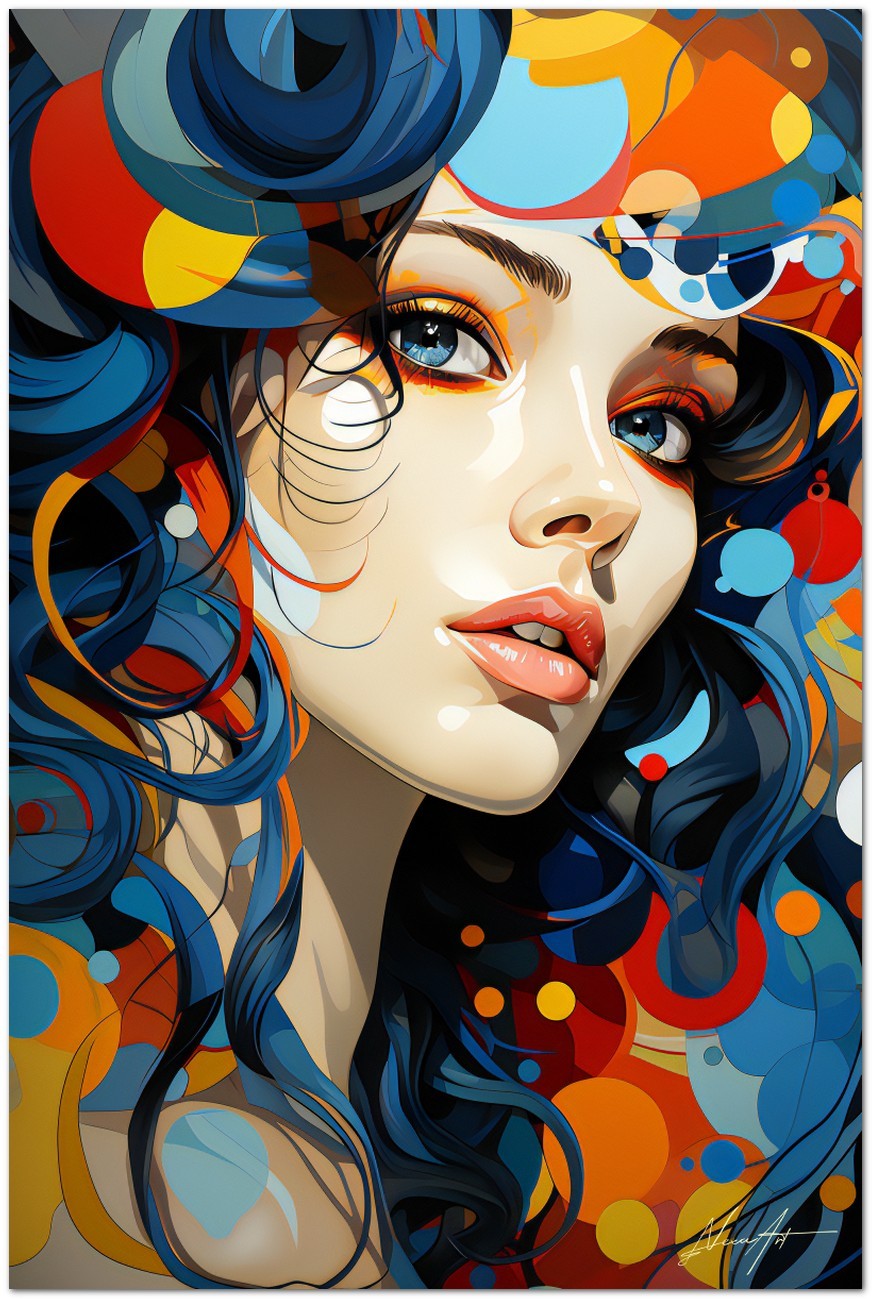 „Porträt von Vivace Colore“ ist eine Illustration, die Energie und Fantasie zum Ausdruck bringt und in der das Porträt einer lebhaften Frau durch ein Spiel mit Farben und Formen lebendig wird. Das Haar der Frau, dargestellt in einer Reihe von Farbtönen von elektrischem Blau bis hin zu leuchtendem Lila, wird zum zentralen Element der Arbeit und erzeugt eine fesselnde visuelle Dynamik. Der Hintergrund des Gemäldes ergänzt mit seinem lebendigen Farbspektrum perfekt das Erscheinungsbild der Frau und verleiht der gesamten Komposition Tiefe und Bewegung. Über „Vivid Color Portrait“: Klassifizierung, Techniken und Stile