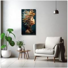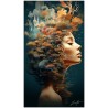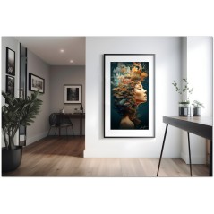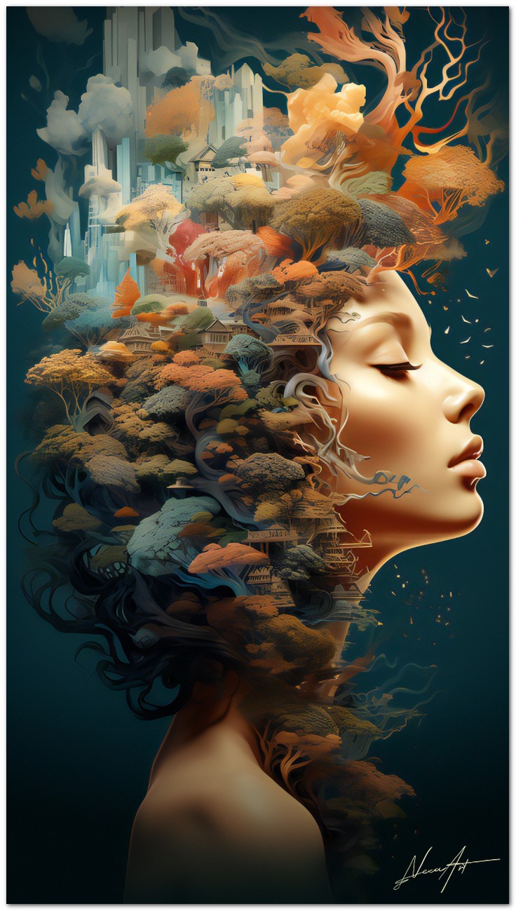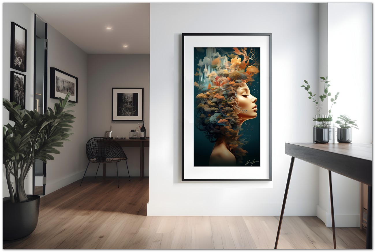 „The Face of the Forest“ ist ein digitales Werk, das durch das Porträt einer Frau eine tiefe Verbindung zur Natur hervorruft. Ihre heitere Figur, die den gesamten Rahmen ausfüllt, vermittelt Ruhe und ein Gefühl der Verschmelzung mit der umgebenden Natur. Ihre sanften Augen blicken in die Ferne und drücken Kontemplation aus, während ihr dunkles, üppiges Haar harmonisch mit dem leuchtenden Laubwerk, das sie umgibt, verschmilzt. Einblicke in das Werk: Klassifizierung, Techniken und Stile