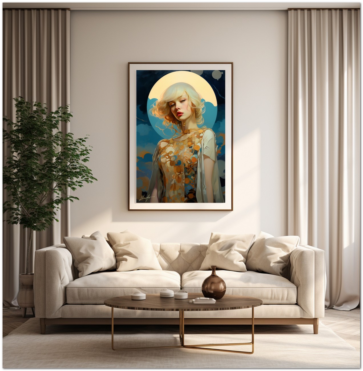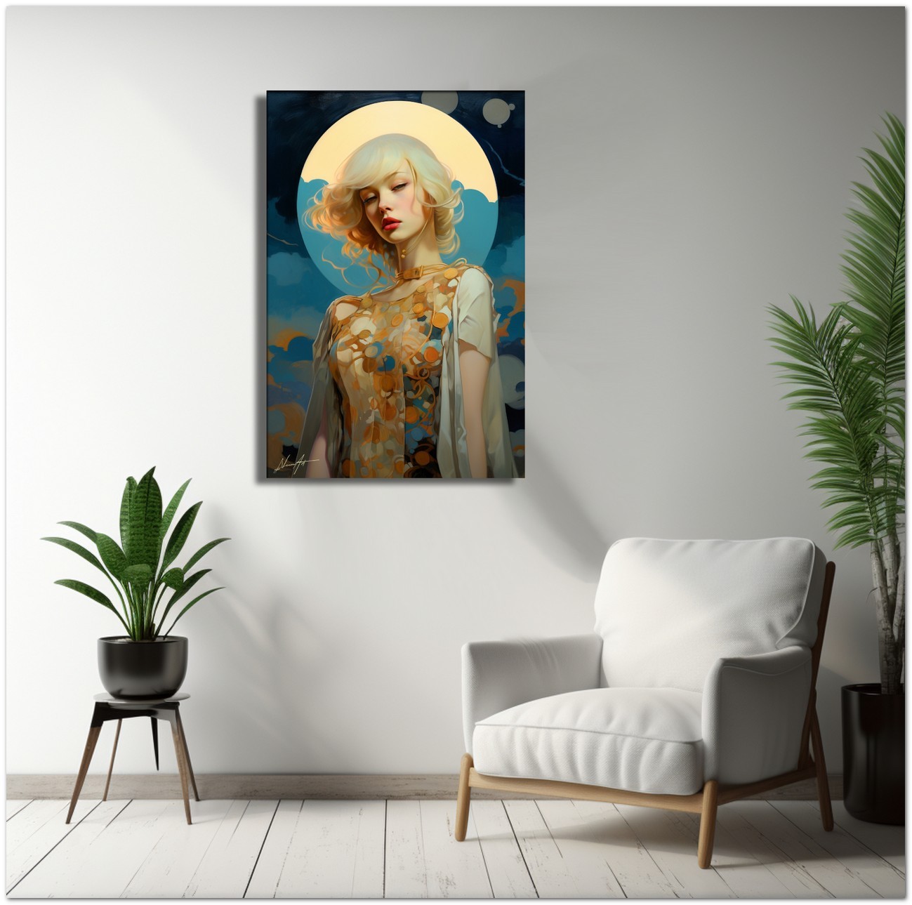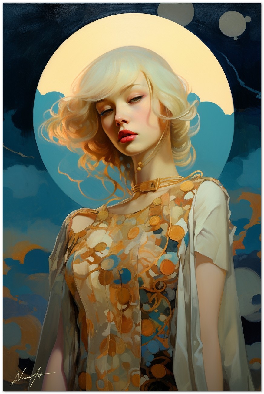 „Luna e Mistero“ entführt uns in ein künstlerisches Universum, in dem eine Frau mit wallendem blonden Haar zur Protagonistin einer ruhigen Szene wird, beleuchtet vom Licht des Mondes. Die ätherische Aura, die sie umgibt, wird durch das Mondlicht betont, das ihrer Figur einen strahlenden, übernatürlichen Heiligenschein verleiht. Der Künstler porträtiert meisterhaft das zarte Gesicht der Frau und fängt ihre junge Schönheit und ihren rätselhaften Ausdruck ein, während sie sich vor einem Hintergrund voller warmer Töne abhebt. Details zum Werk „Moon and Mystery“: Klassifizierung, Techniken und Stile